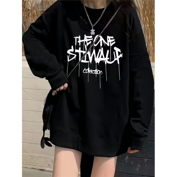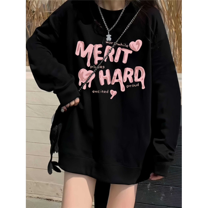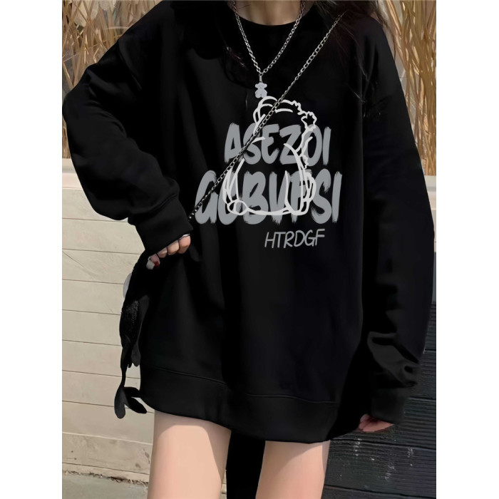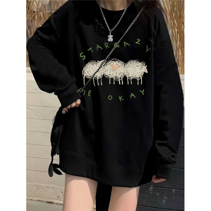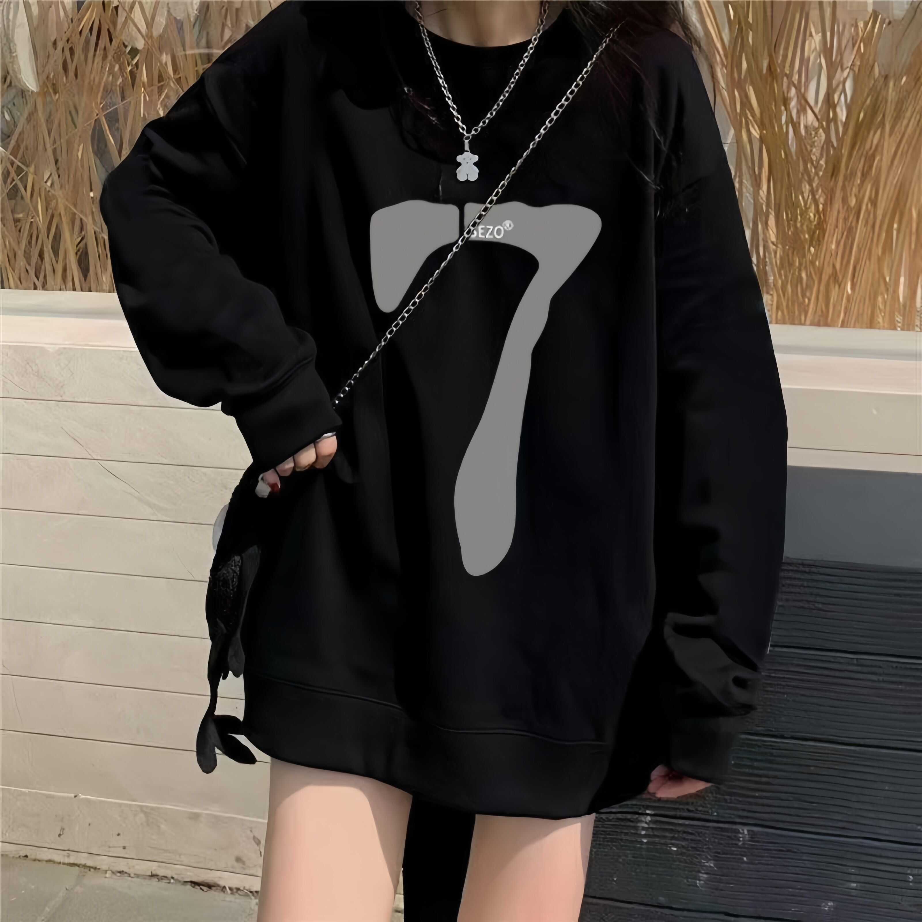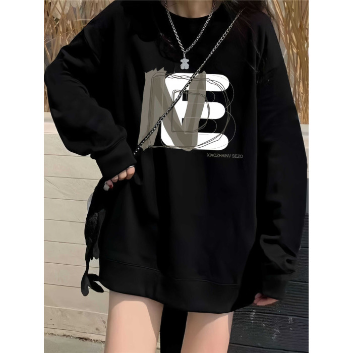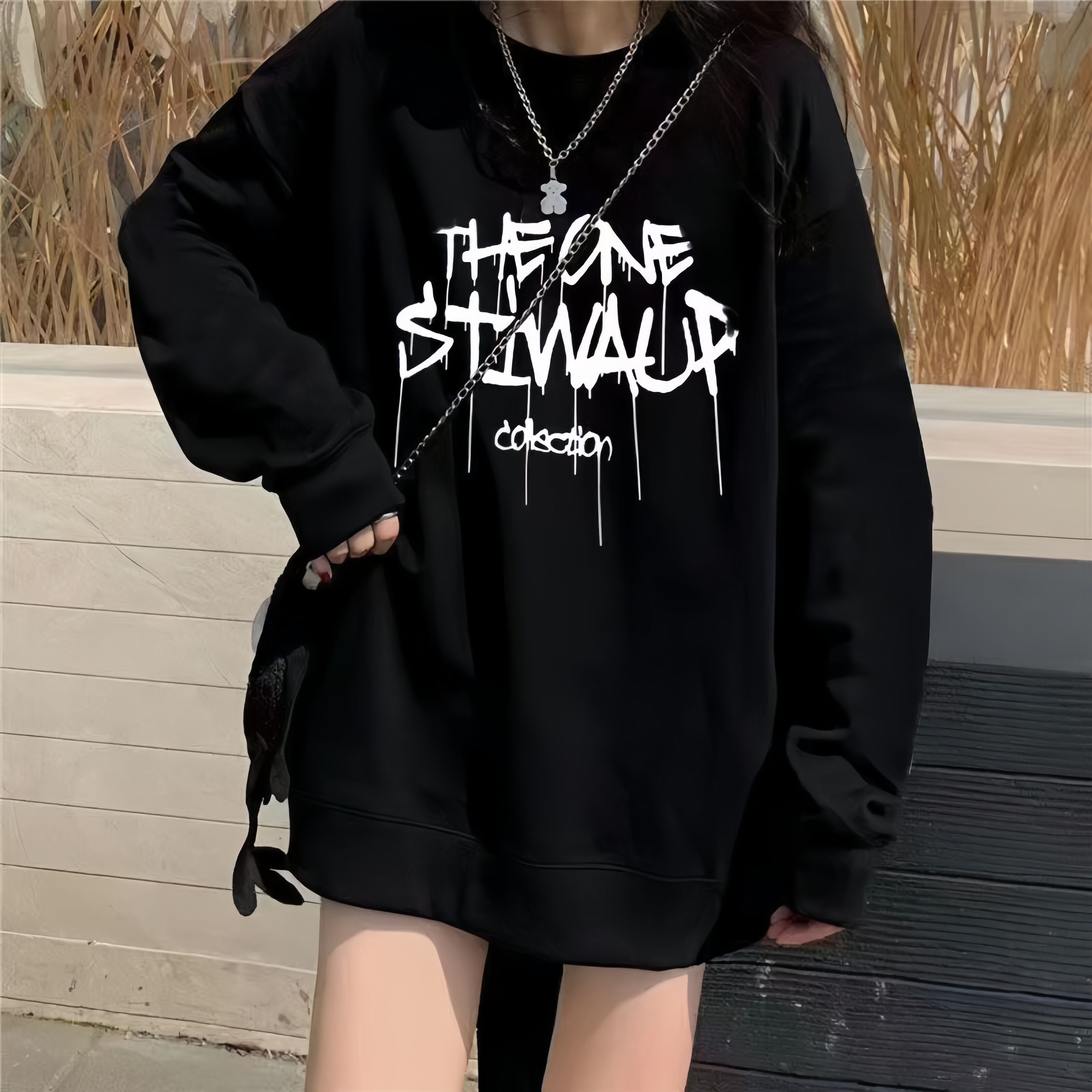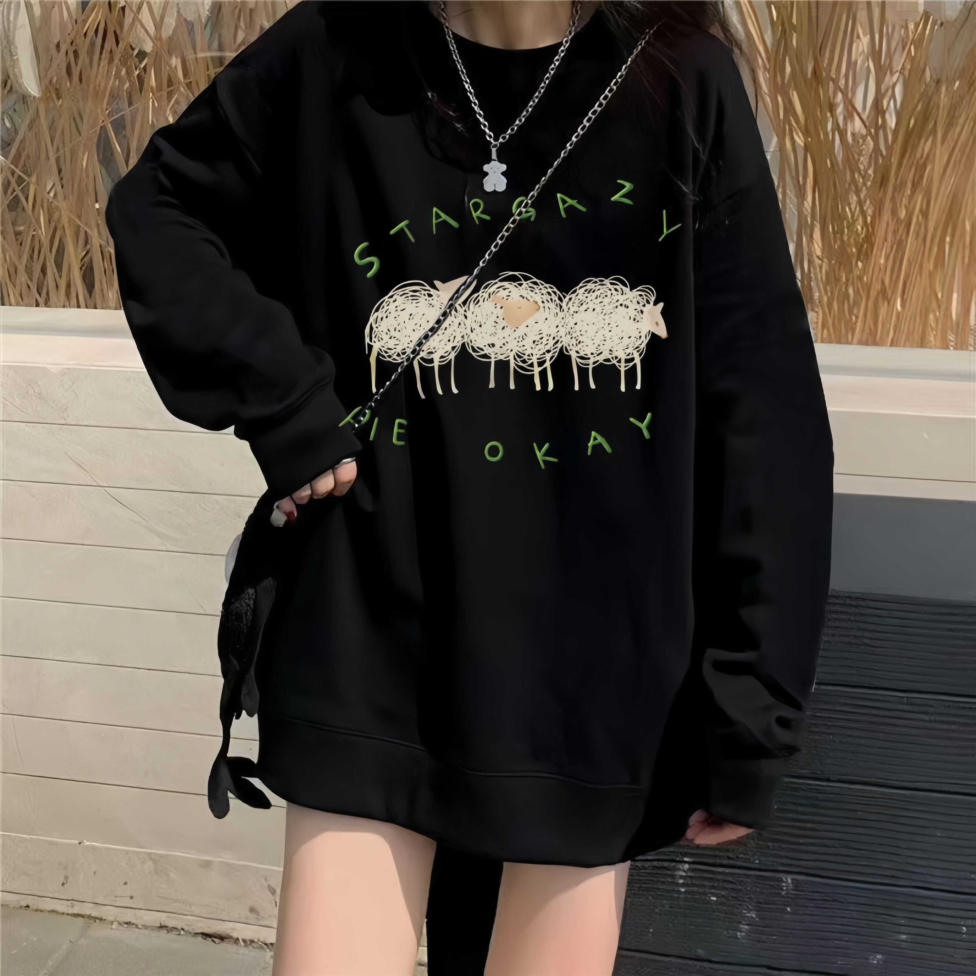 純棉黑色圓領衛衣女2025新款爆款春秋季美式復古寬松慵懶無帽上衣