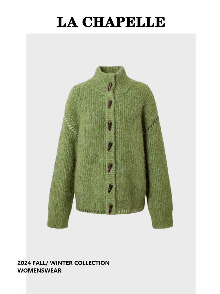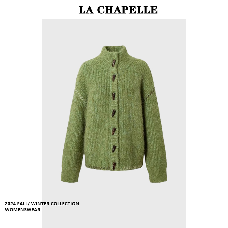 拉夏貝爾聖誕綠撞色手綉飾邊厚實慵懶廓形毛衣外套女2025秋季新款