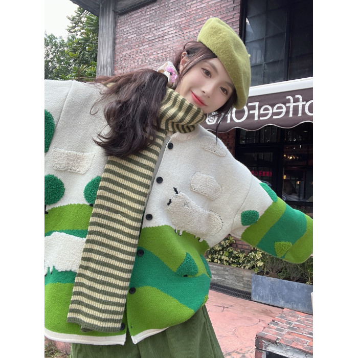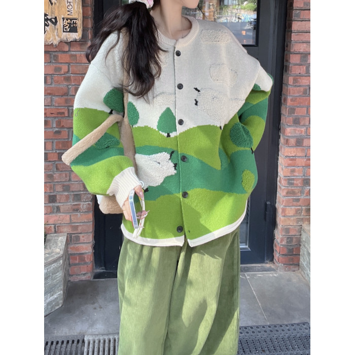 大碼女復古針織開衫秋季高級感聖誕綠色軟糯毛衣胖MM遮肉顯瘦上衣