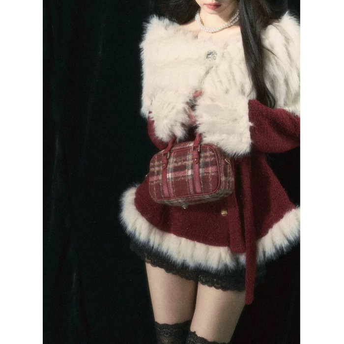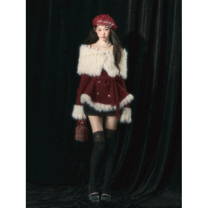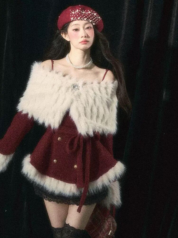 韓版千金感名媛一字肩聖誕紅色收腰上衣拼接毛領高腰蕾絲短裙套裝