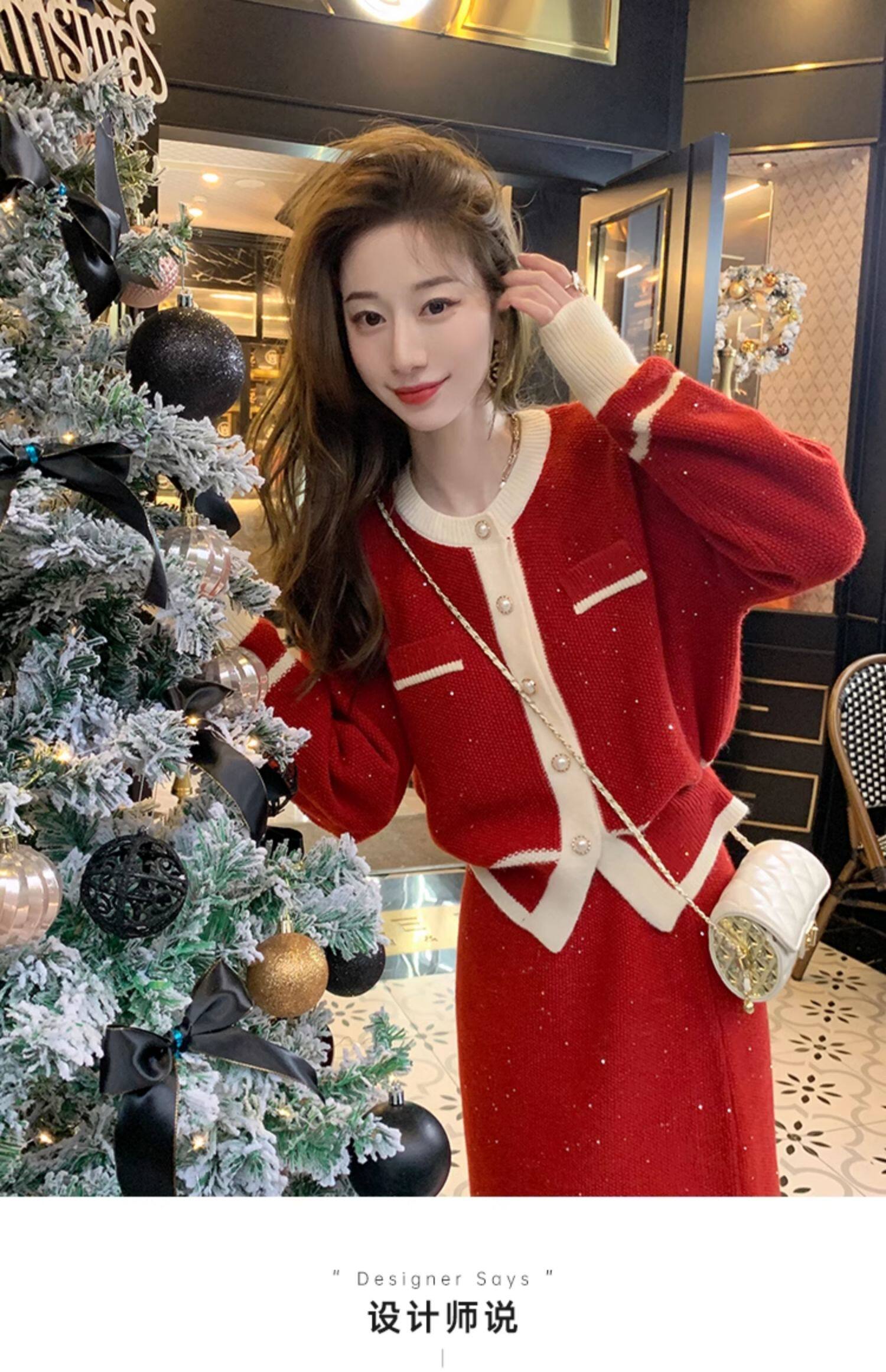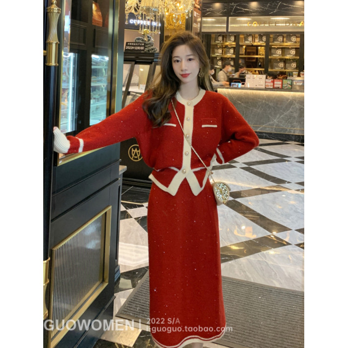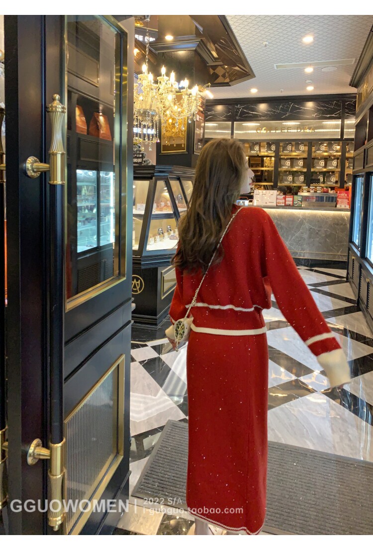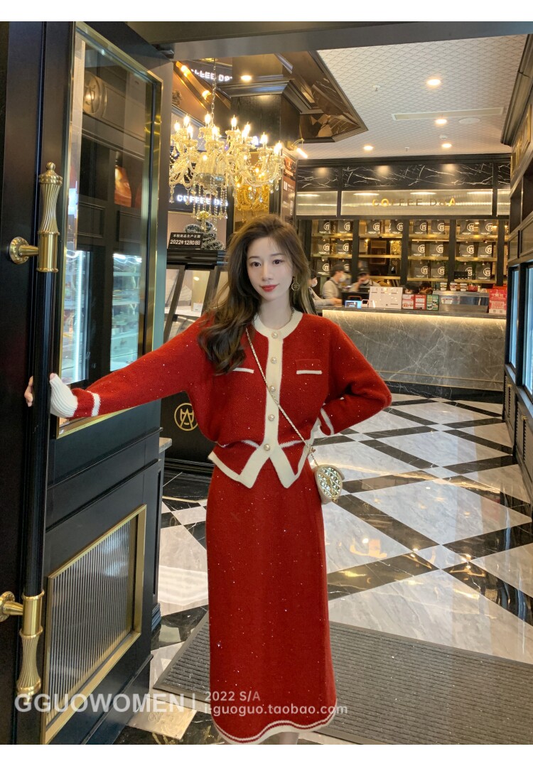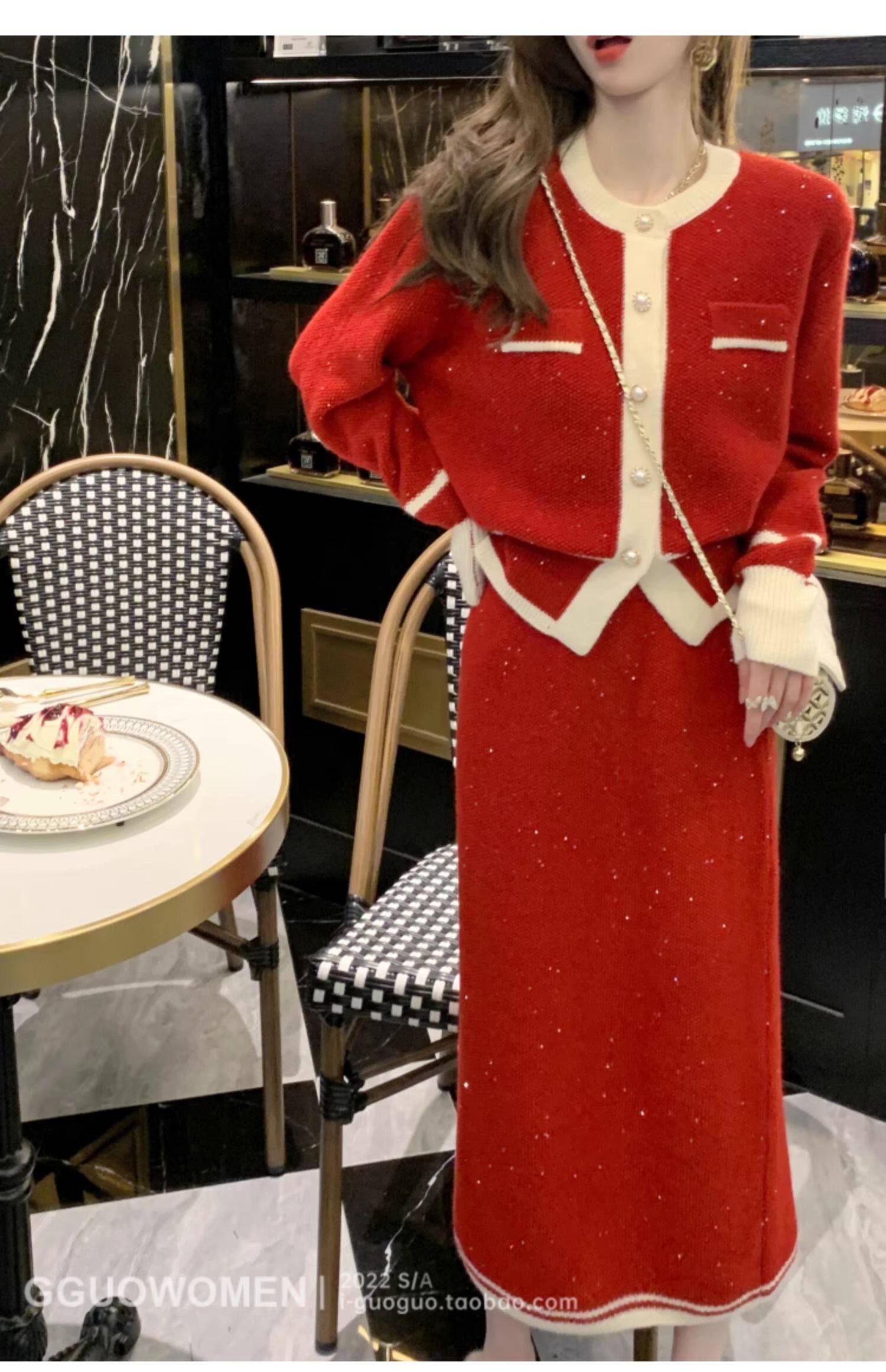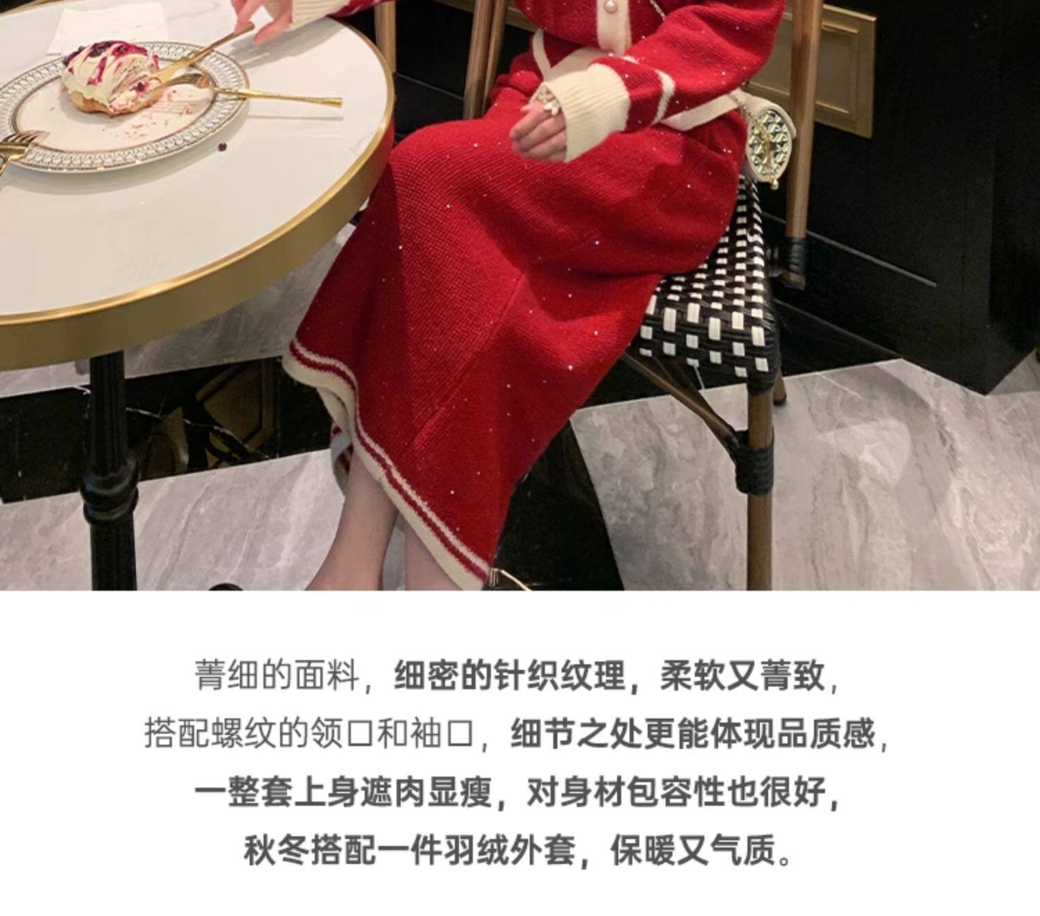 今年流行漂亮時尚減齡氣質聖誕紅色針織毛衣半身裙兩件套裝裙秋冬