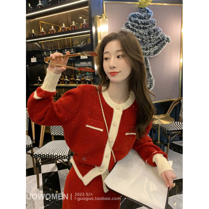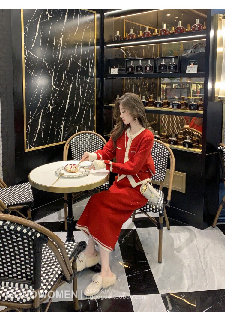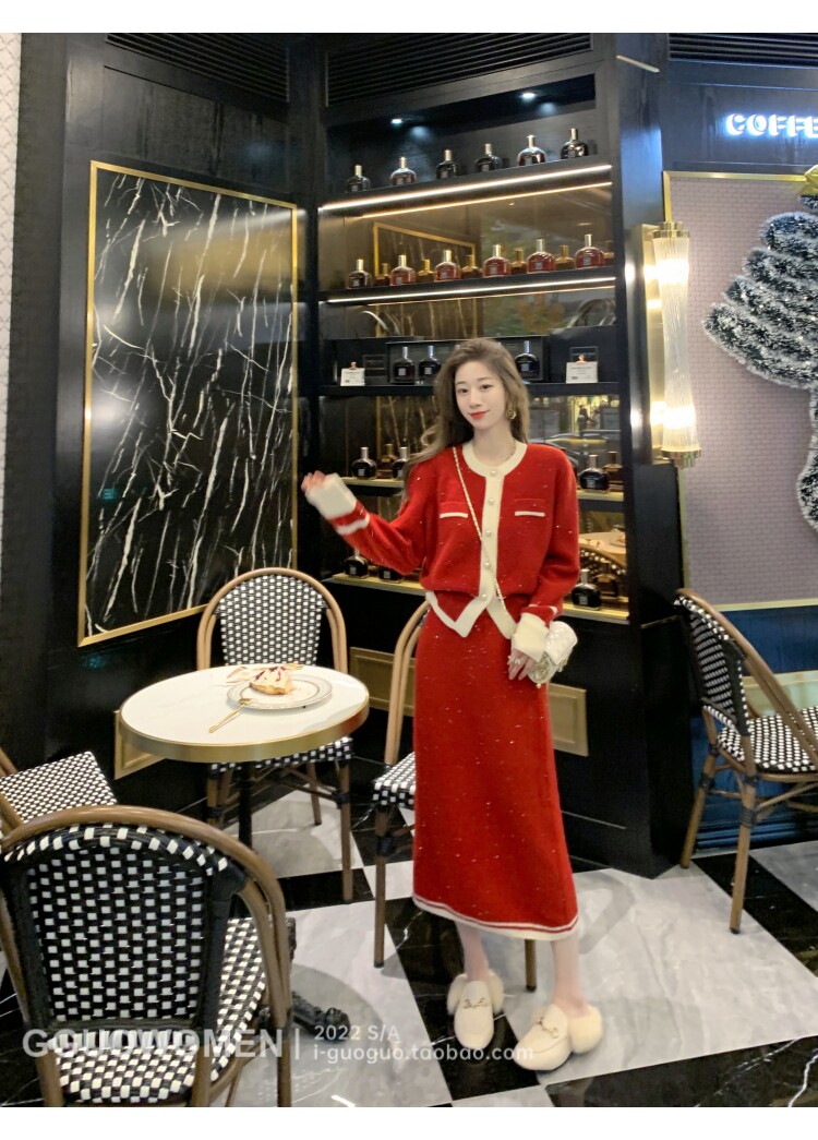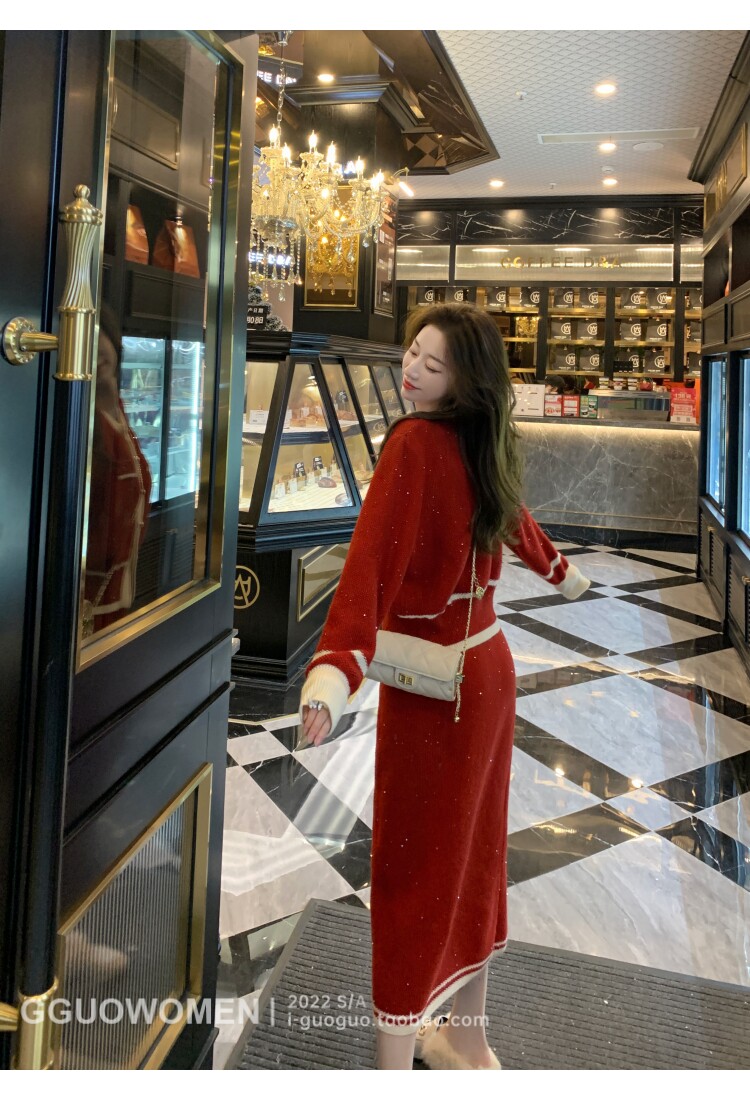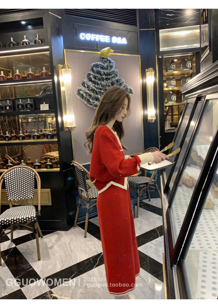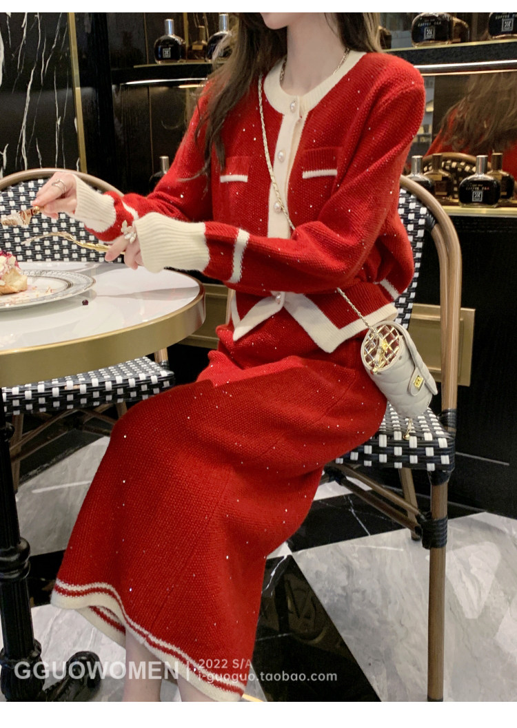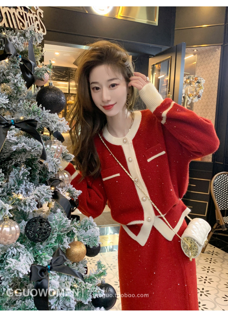 今年流行漂亮時尚減齡氣質聖誕紅色針織毛衣半身裙兩件套裝裙秋冬