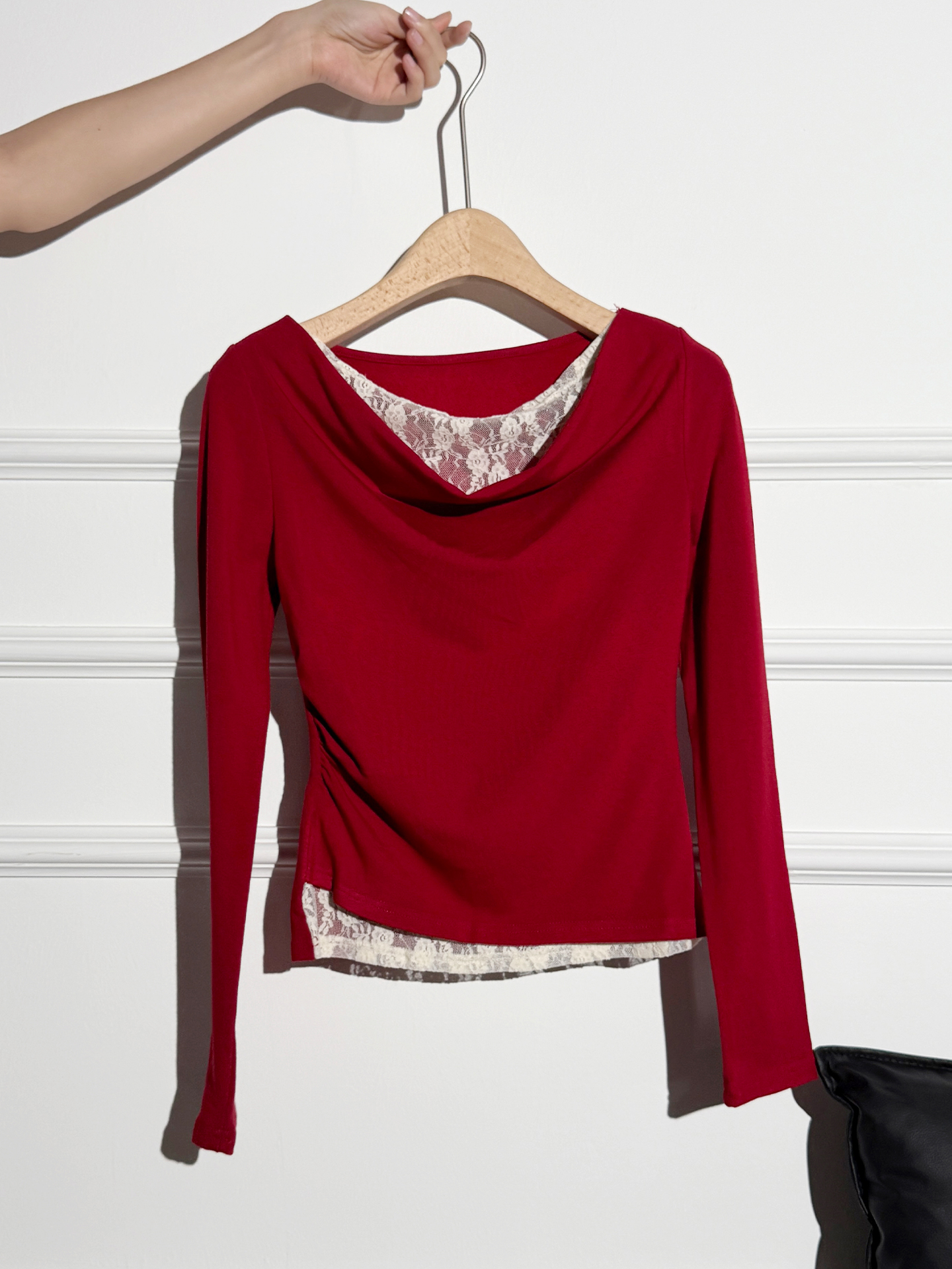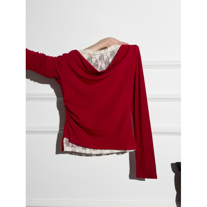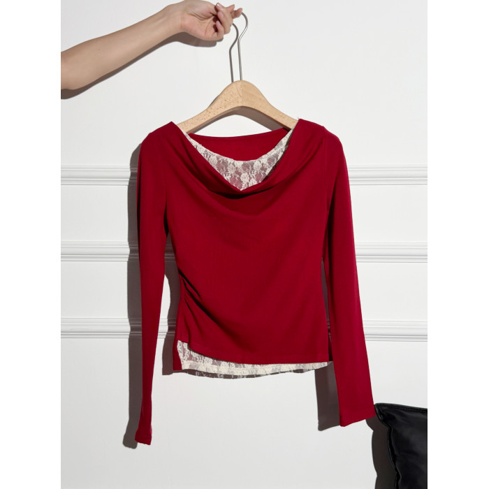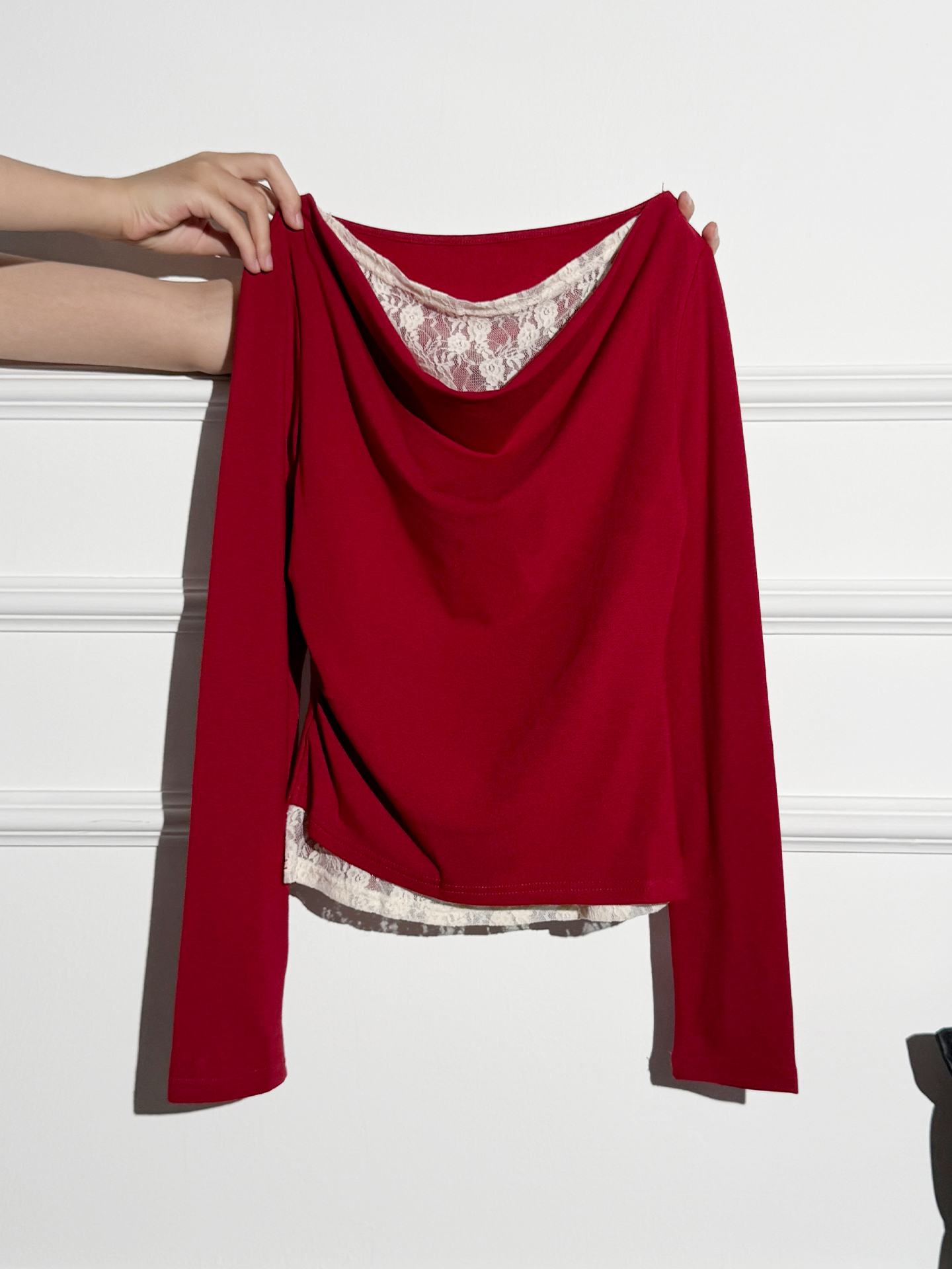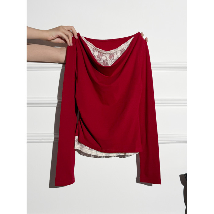 拉夏貝爾打底衫蕩領一字肩長袖T恤女秋蕾絲內搭假兩件不規則上衣