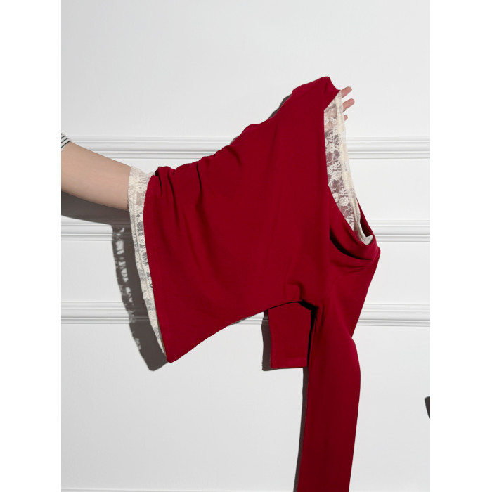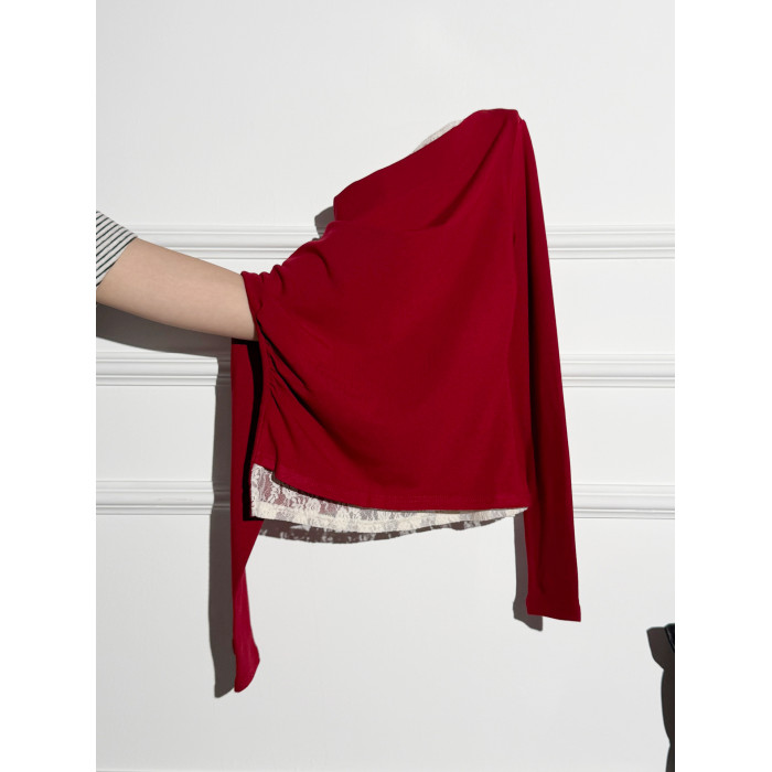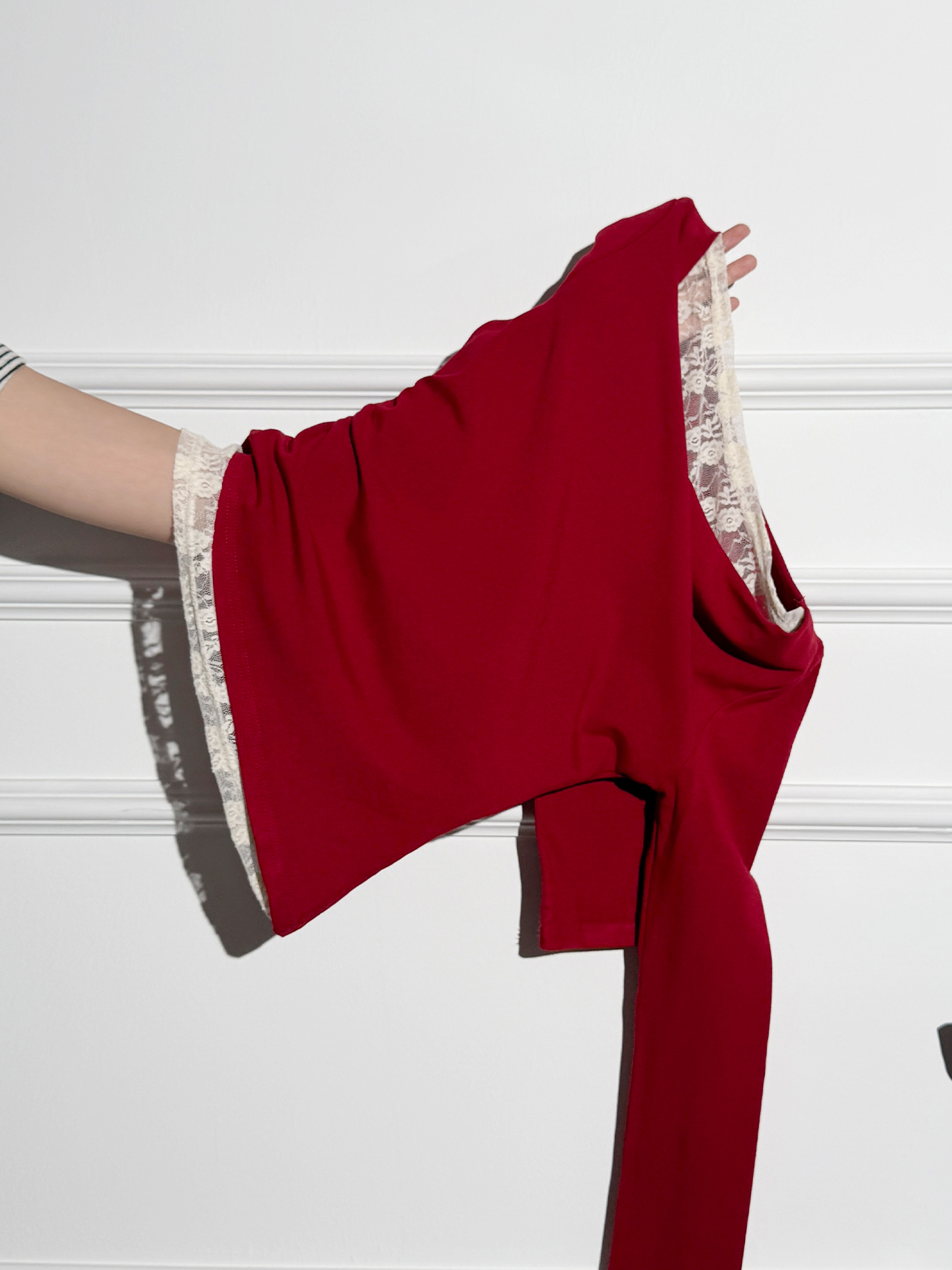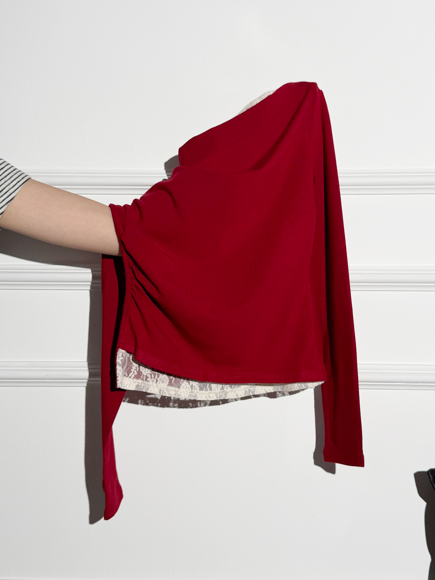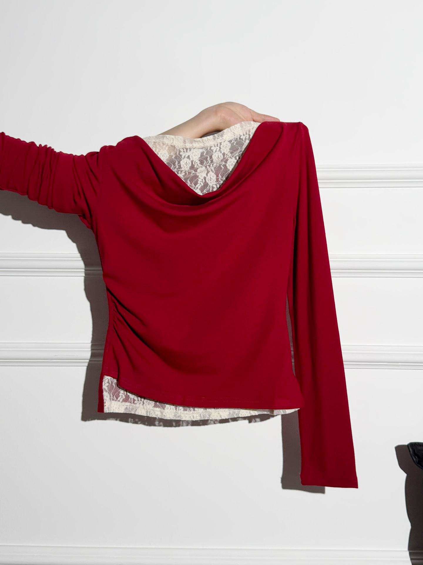 拉夏貝爾打底衫蕩領一字肩長袖T恤女秋蕾絲內搭假兩件不規則上衣
