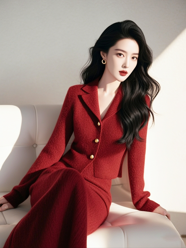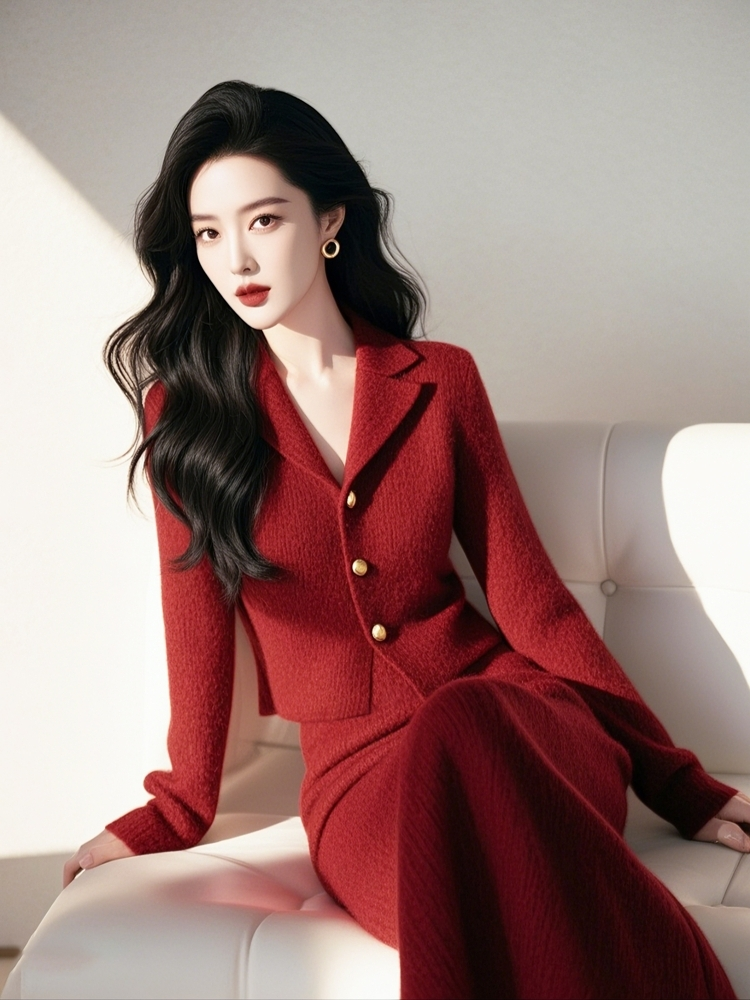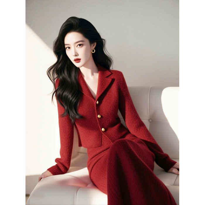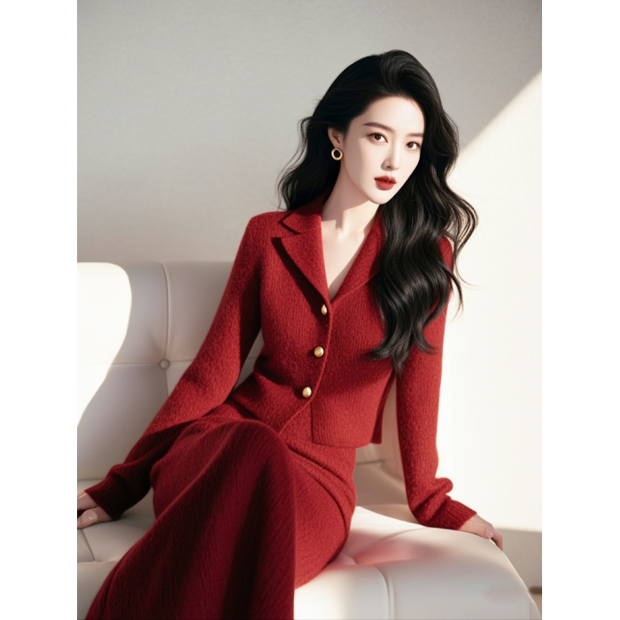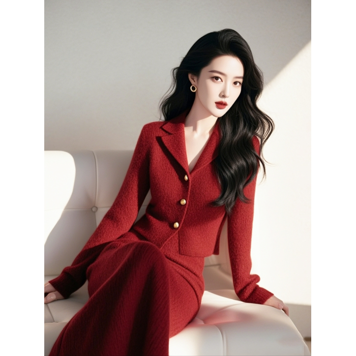冬季穿搭一整套高級感出蓆重要場合小香風聖誕紅色針織毛衣套裝裙