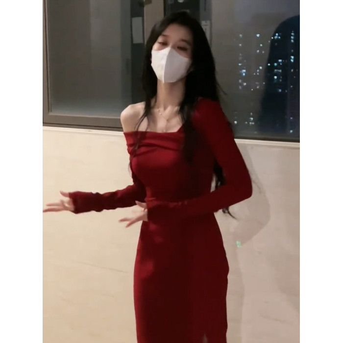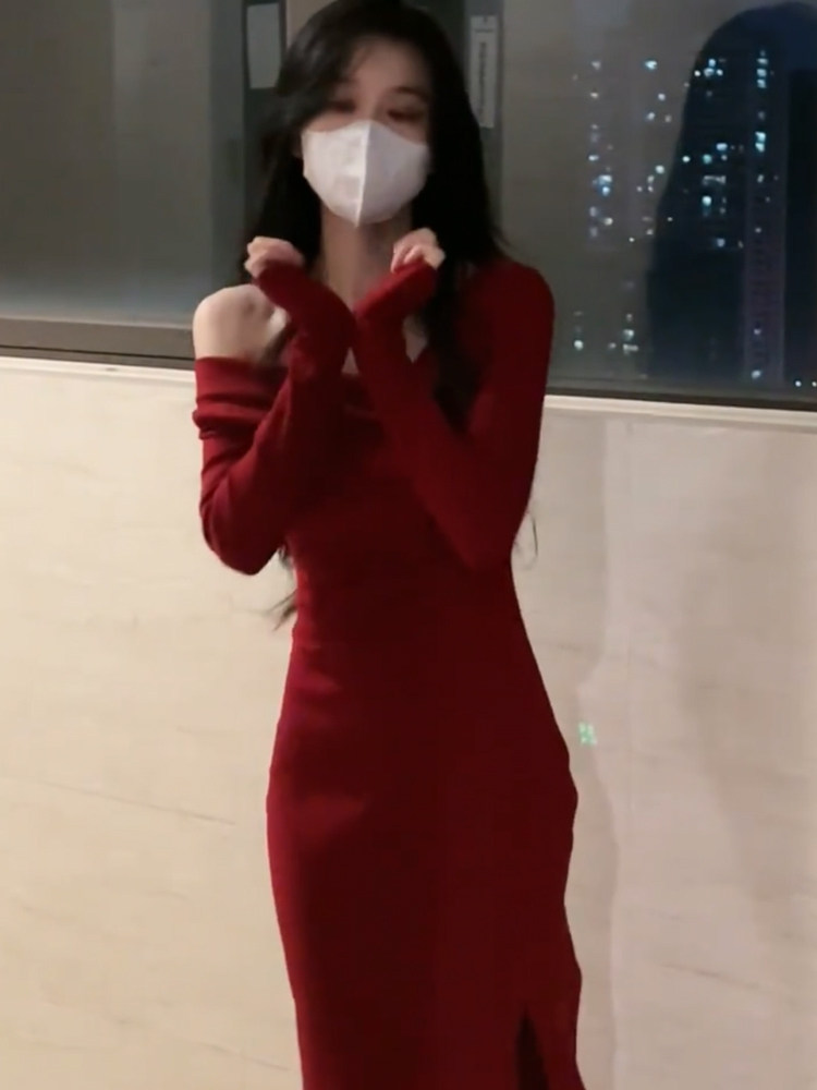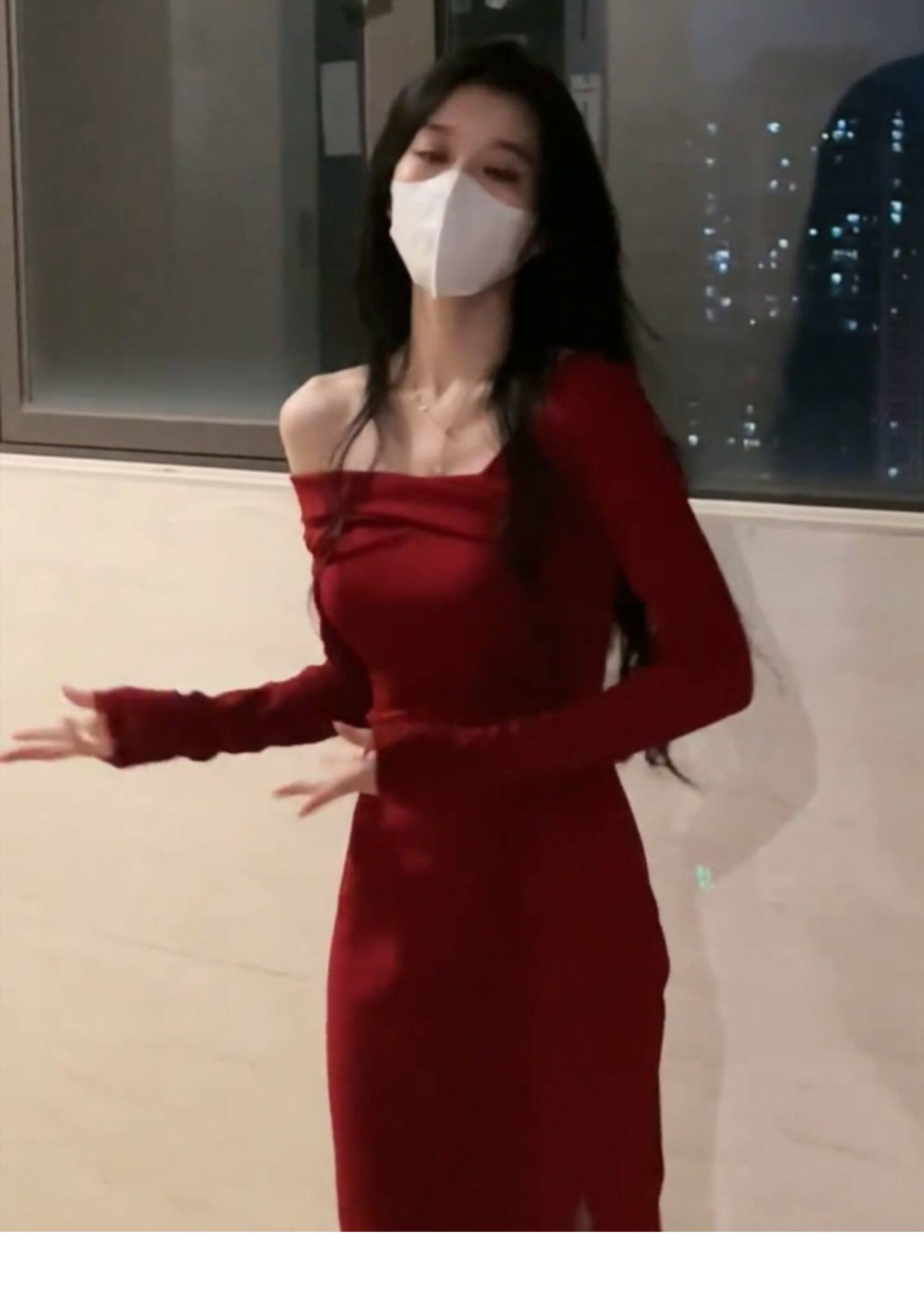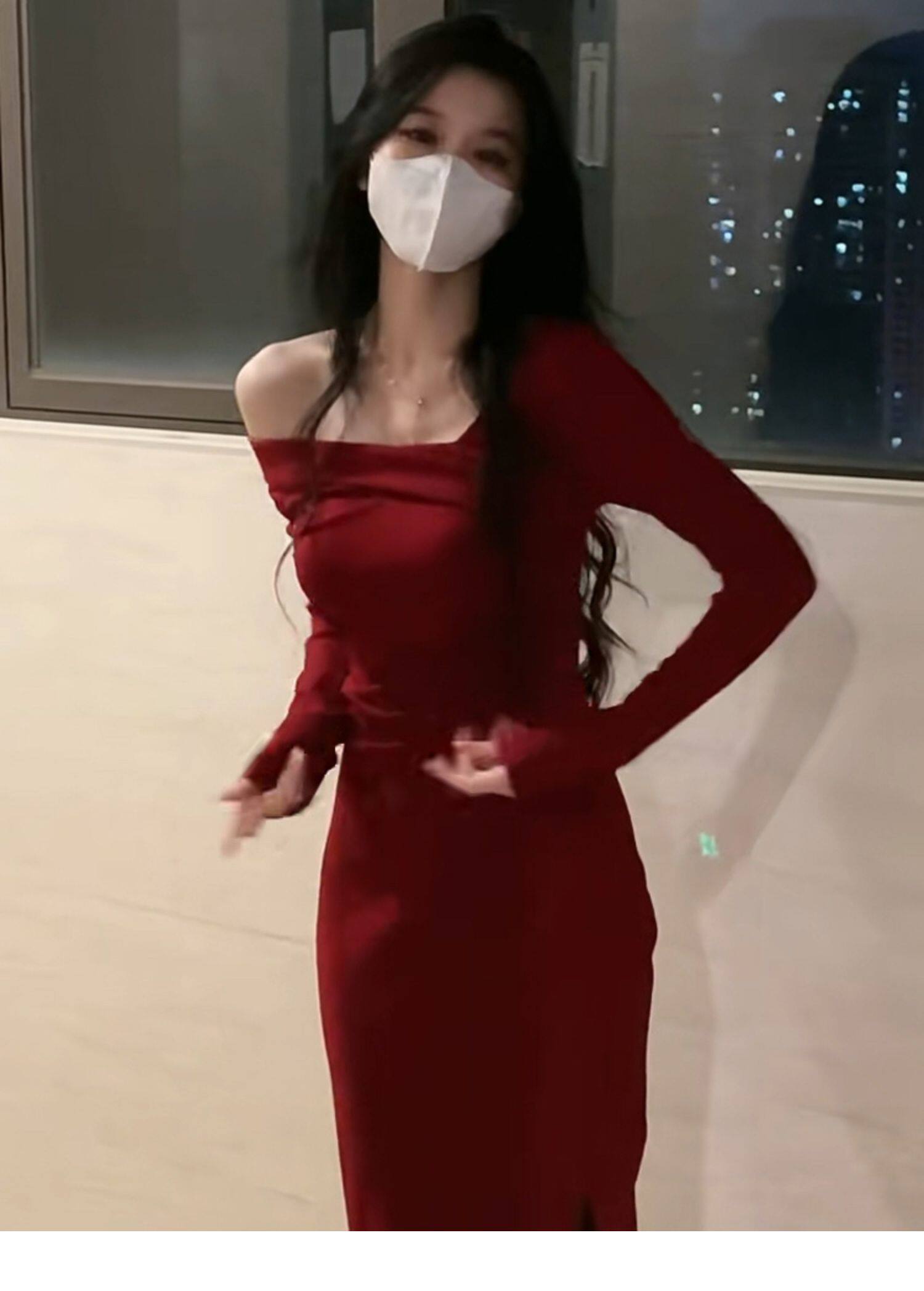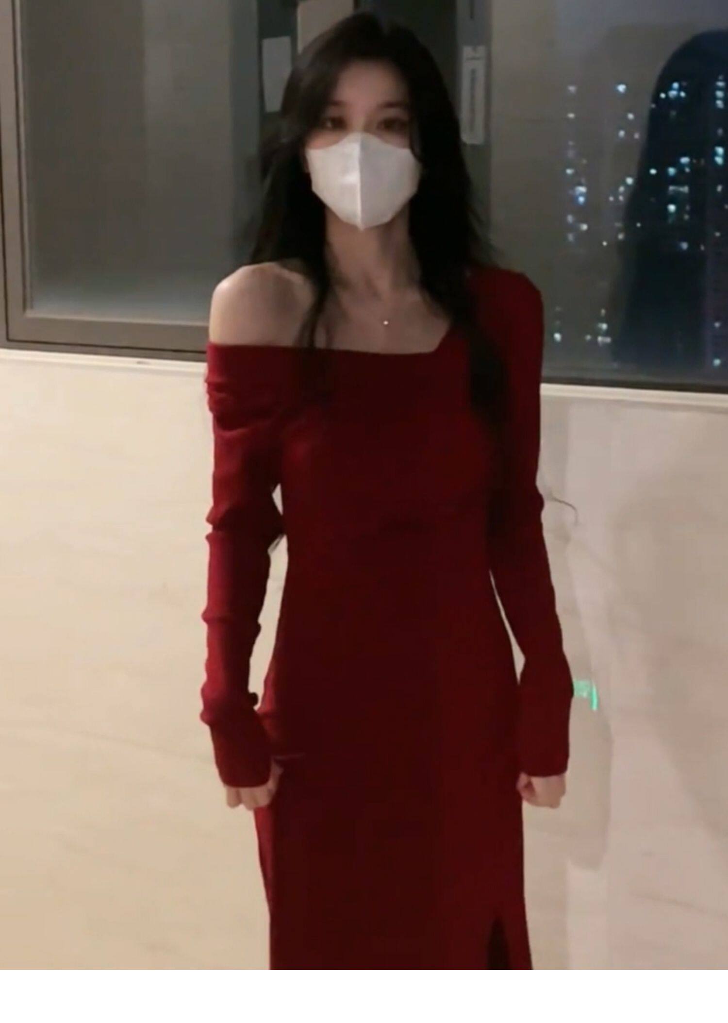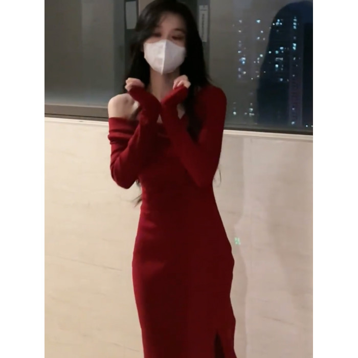 聖誕穿搭訂婚禮服平時可穿赫本風拜年服聖誕紅色露肩針織連衣裙女