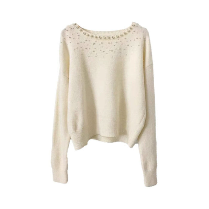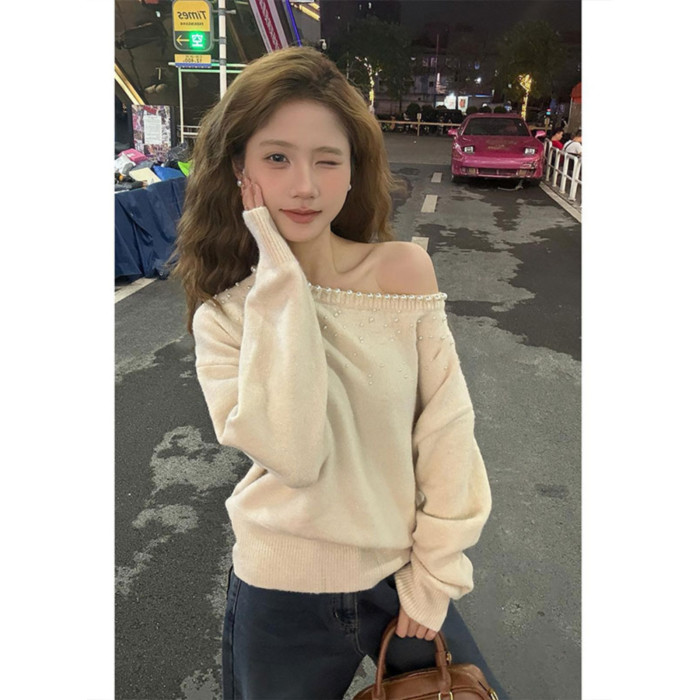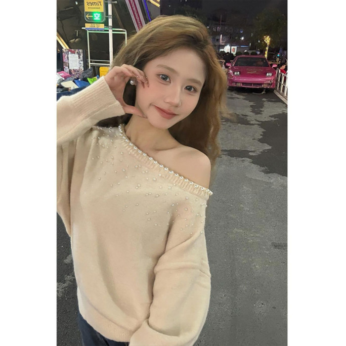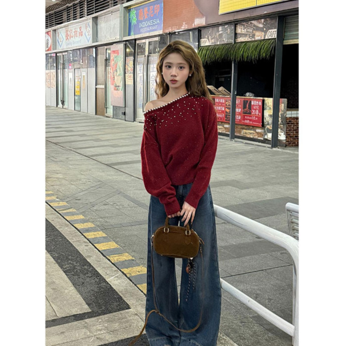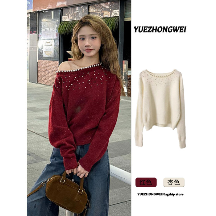 新年過年戰袍聖誕紅色不規則斜肩毛衣女秋冬慵懶風露肩針織衫上衣