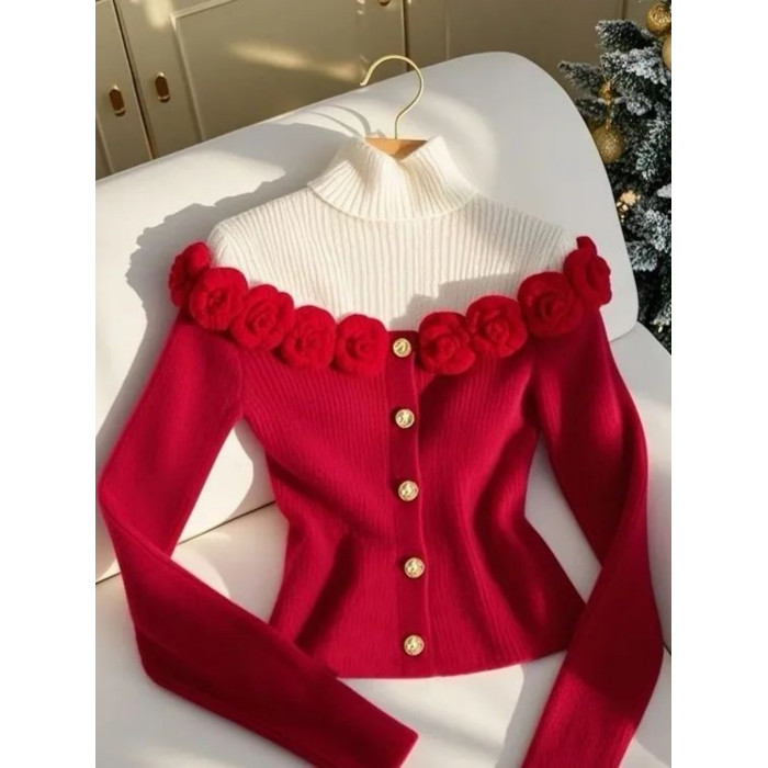 聖誕紅色立體花朵假兩件毛衣2025冬獨特漂亮高級感設計感針織上衣