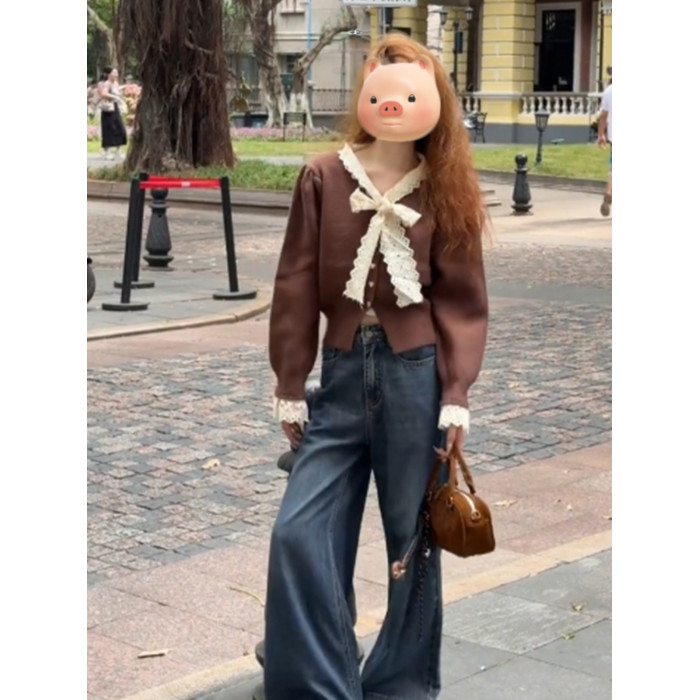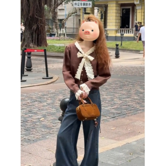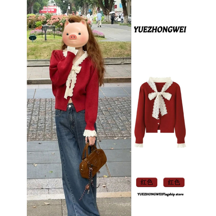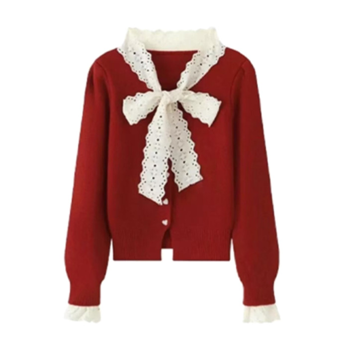 聖誕紅色蕾絲蝴蝶結系帶毛衣開衫女2025秋冬新款修身短款針織外套