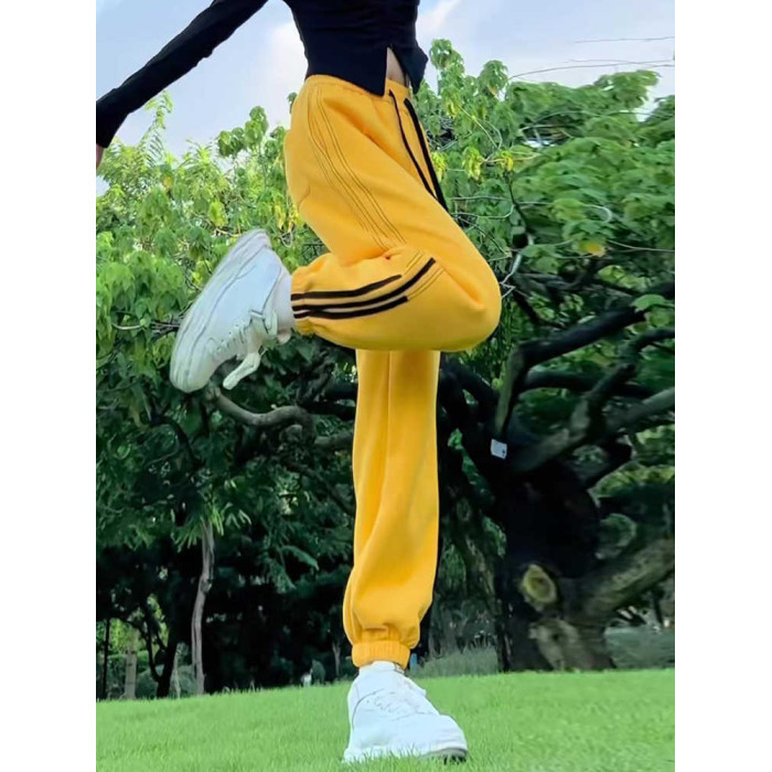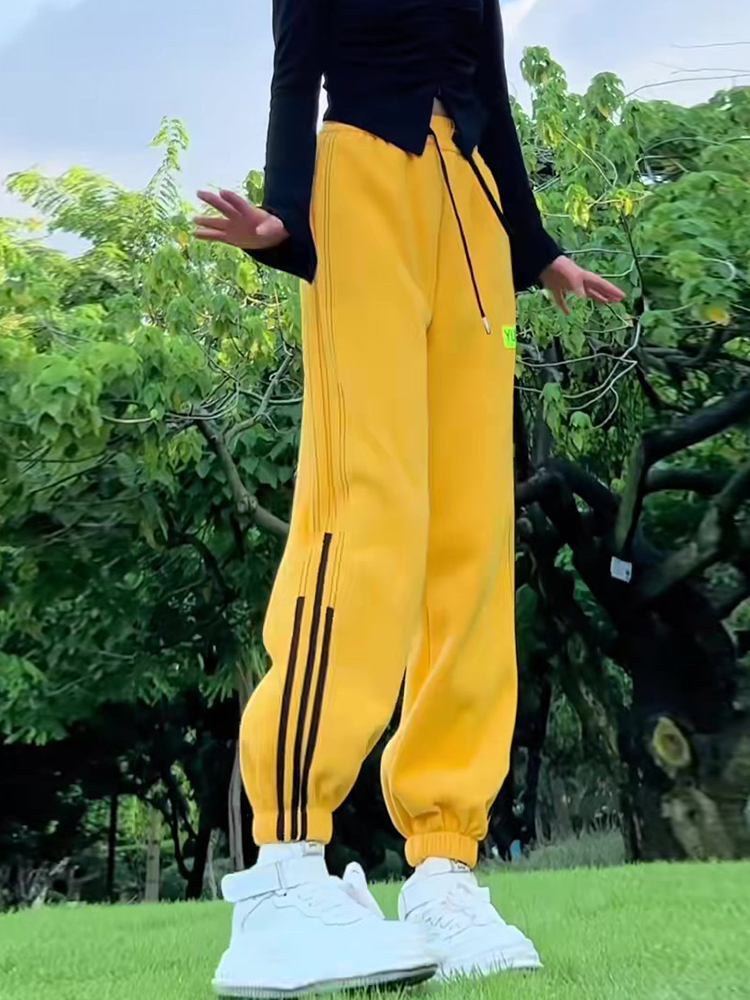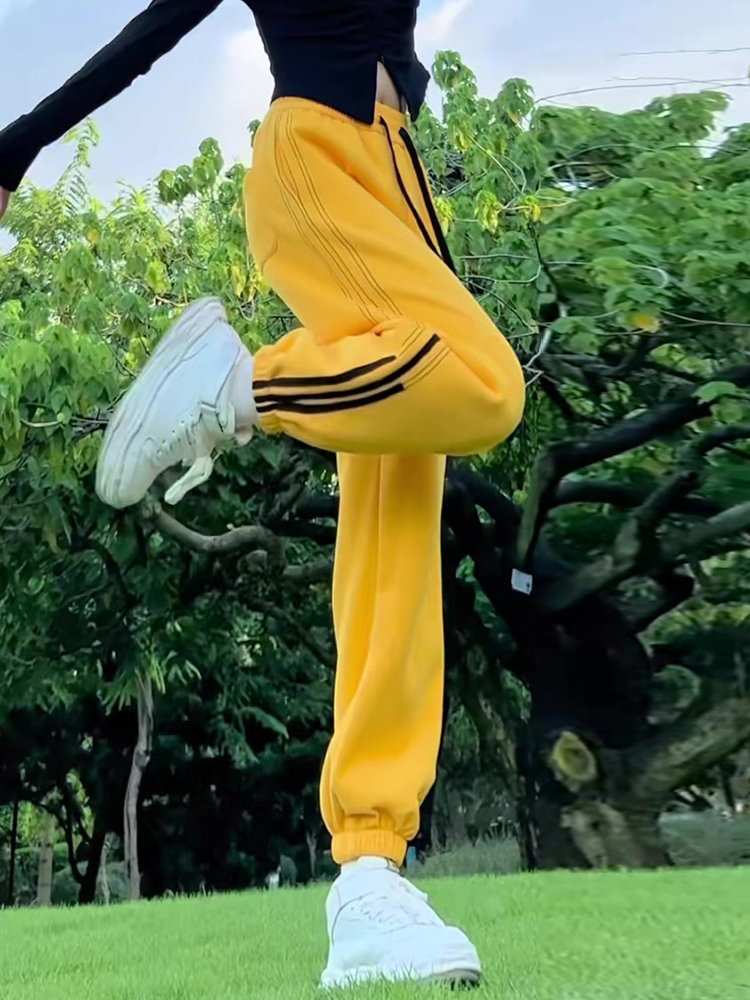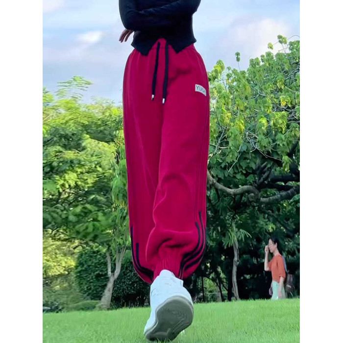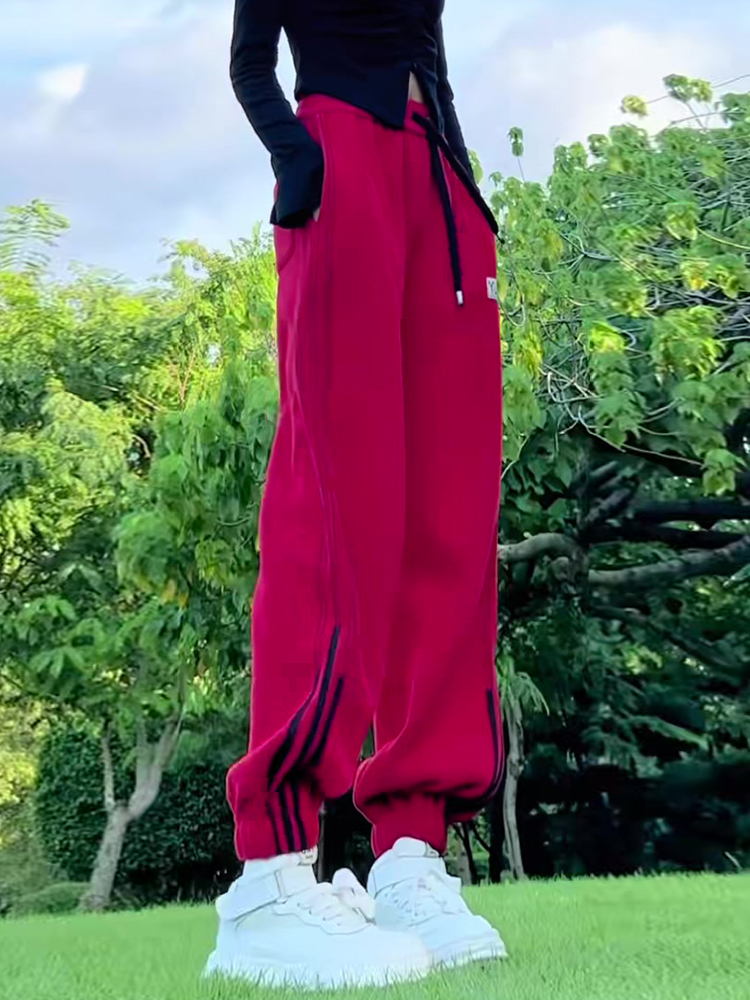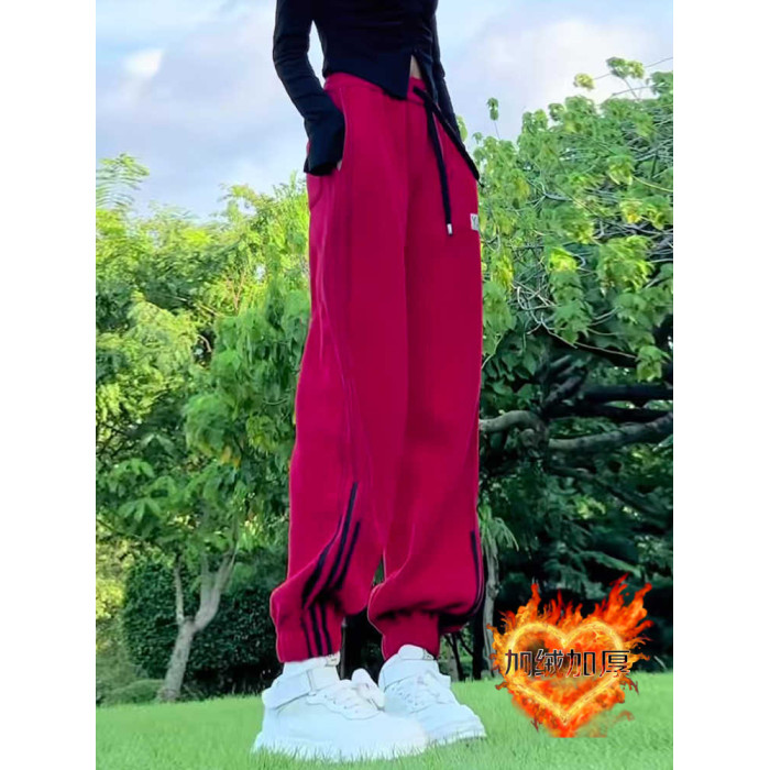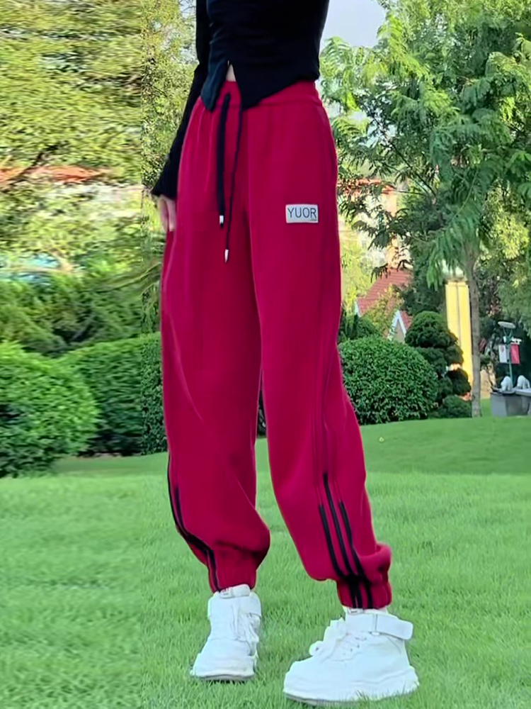 小個子聖誕紅色加絨束腳哈倫褲拼接抽繩衛褲高腰休閒運動褲女冬季