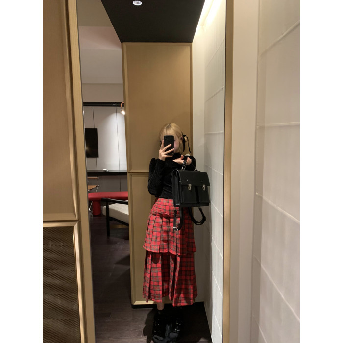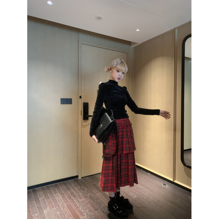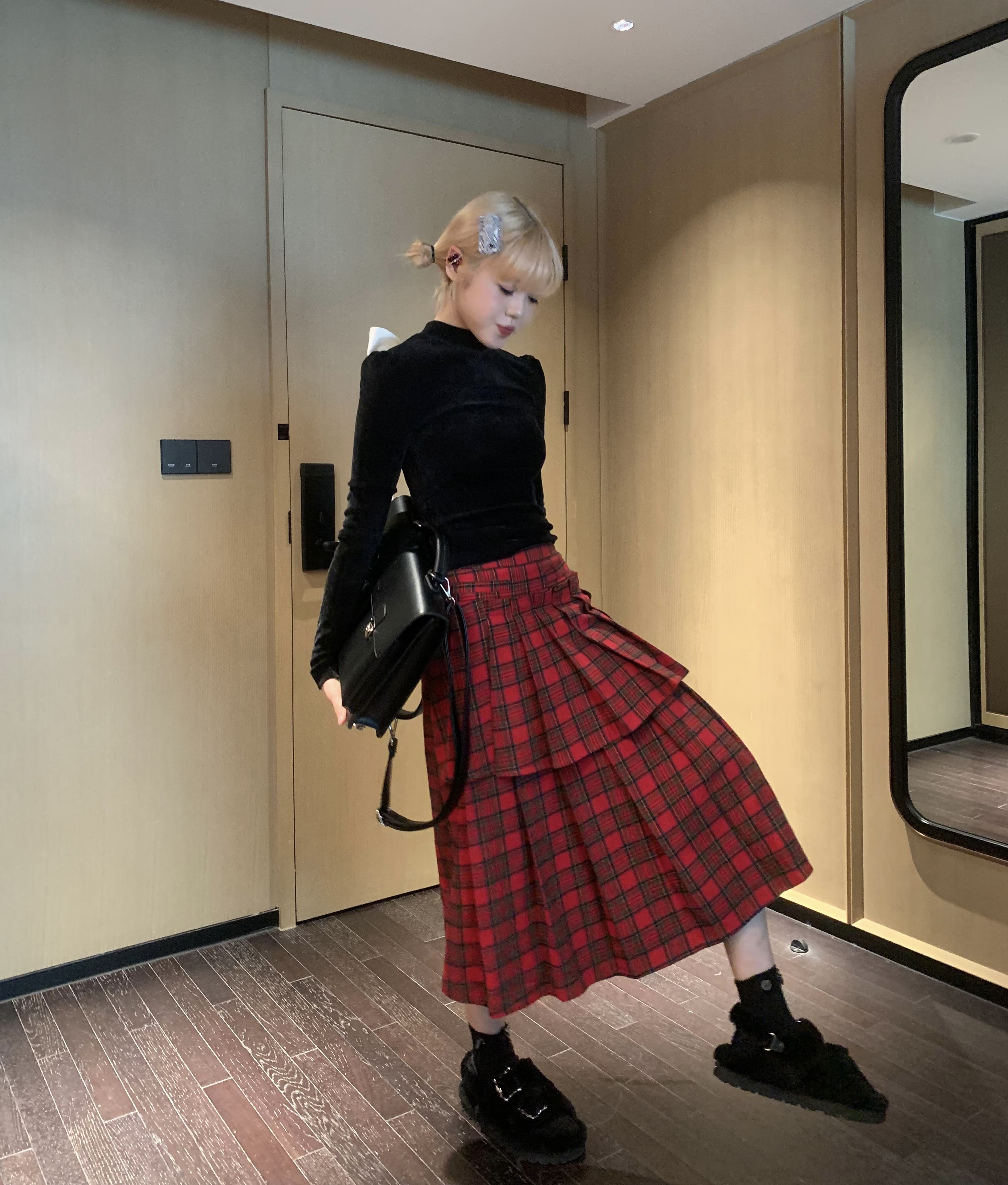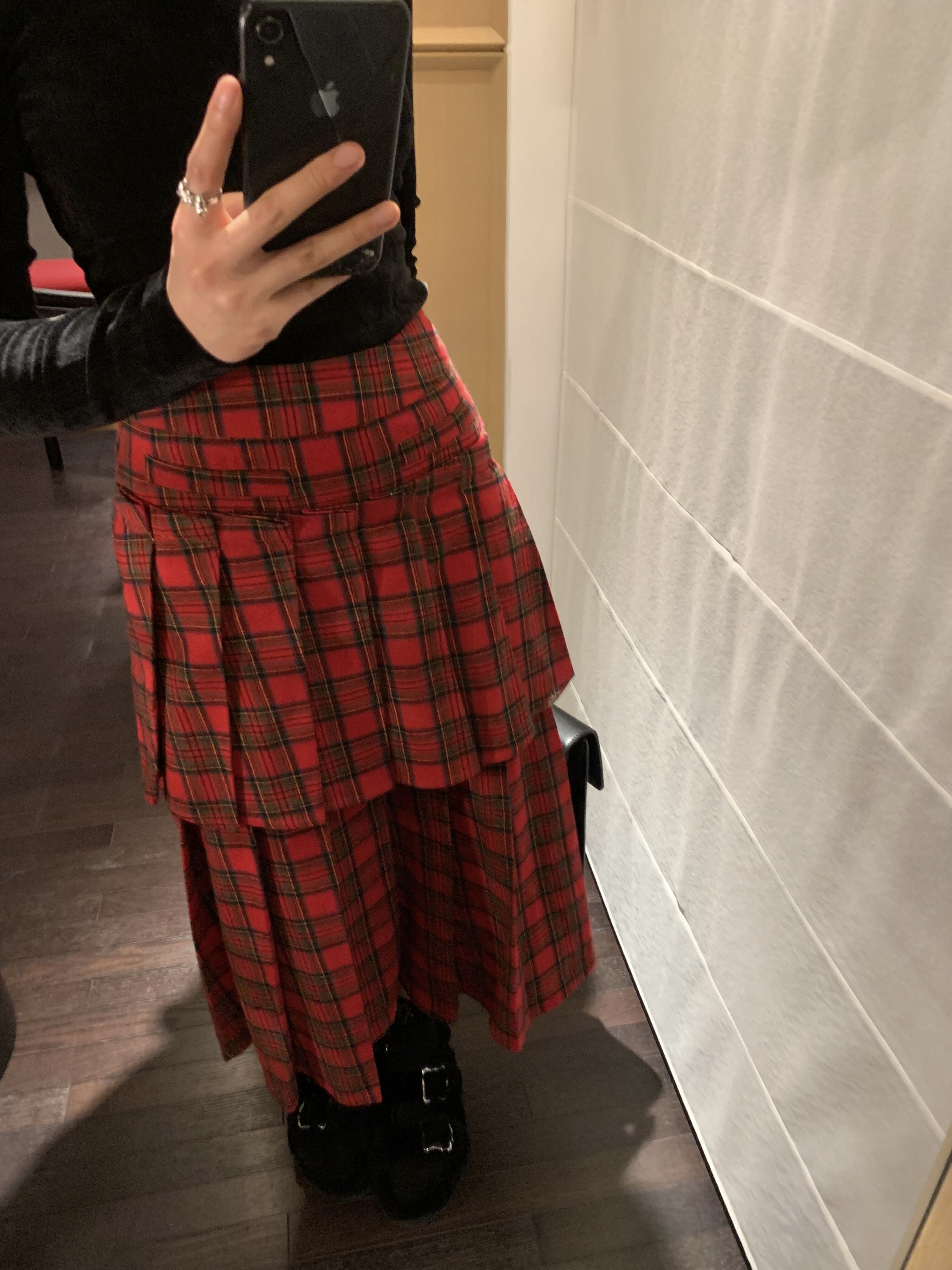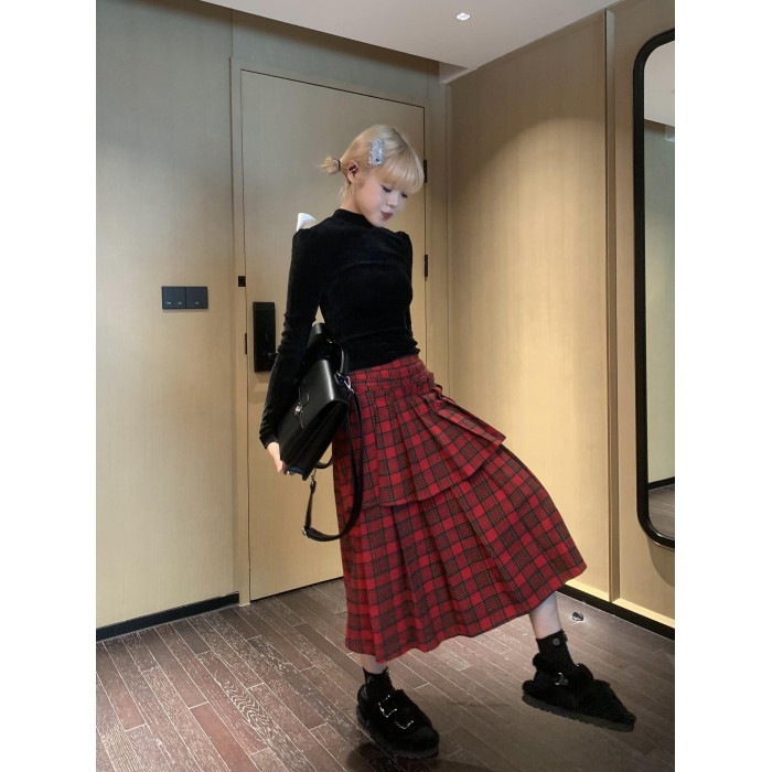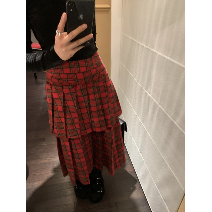 PlaceOrder 復古聖誕紅格子半身雙層設計壓褶A字秋冬中長裙子