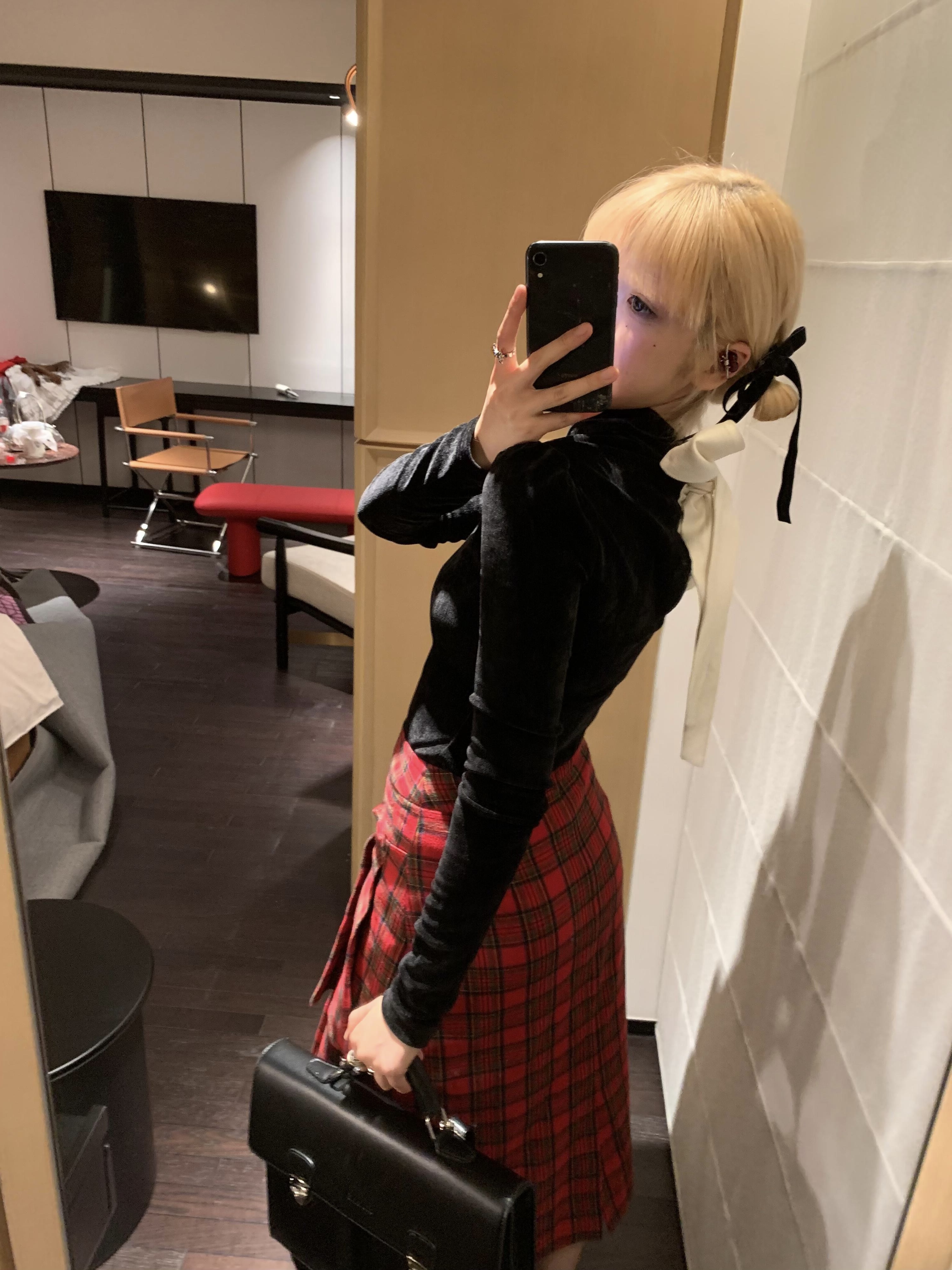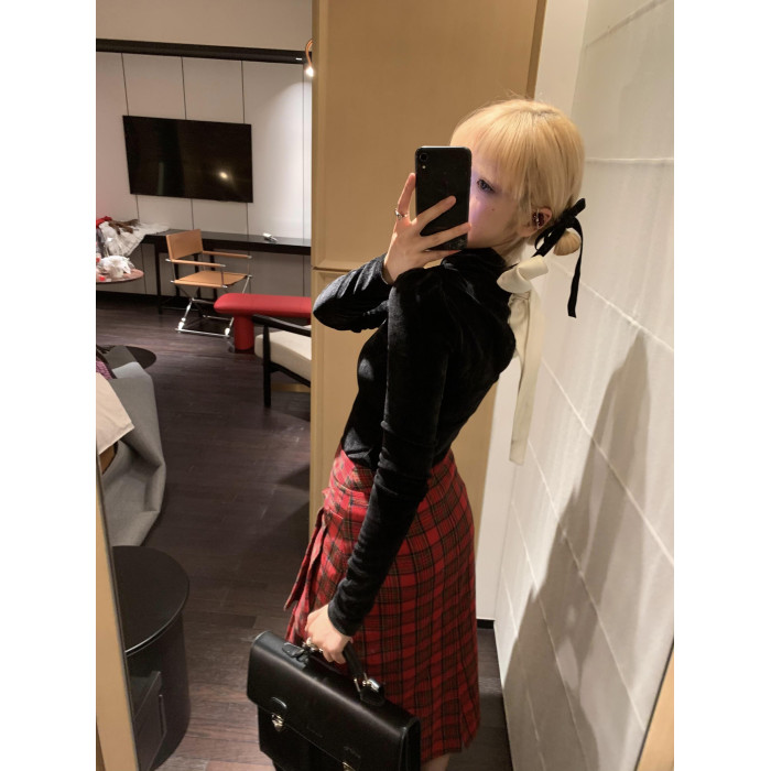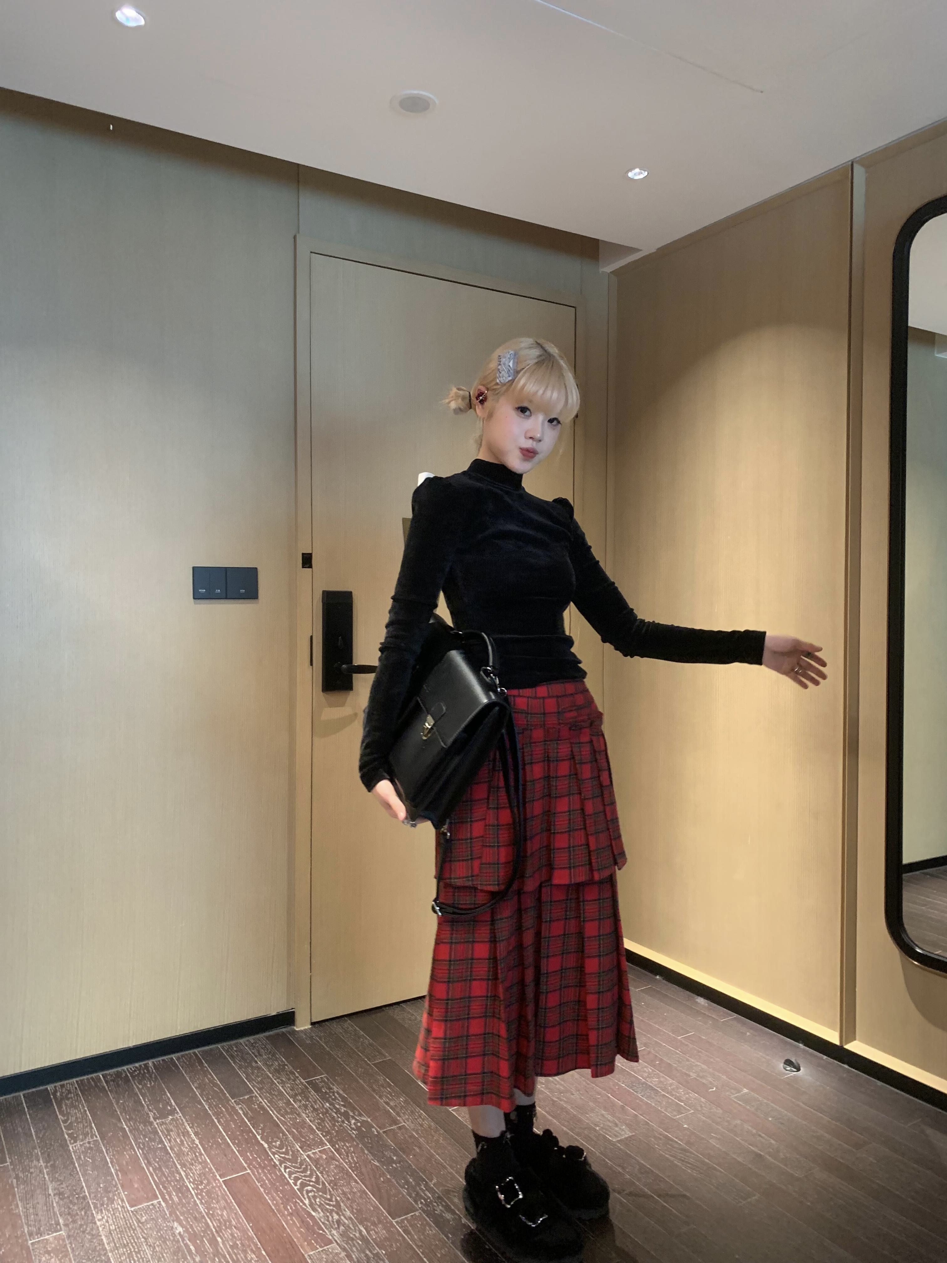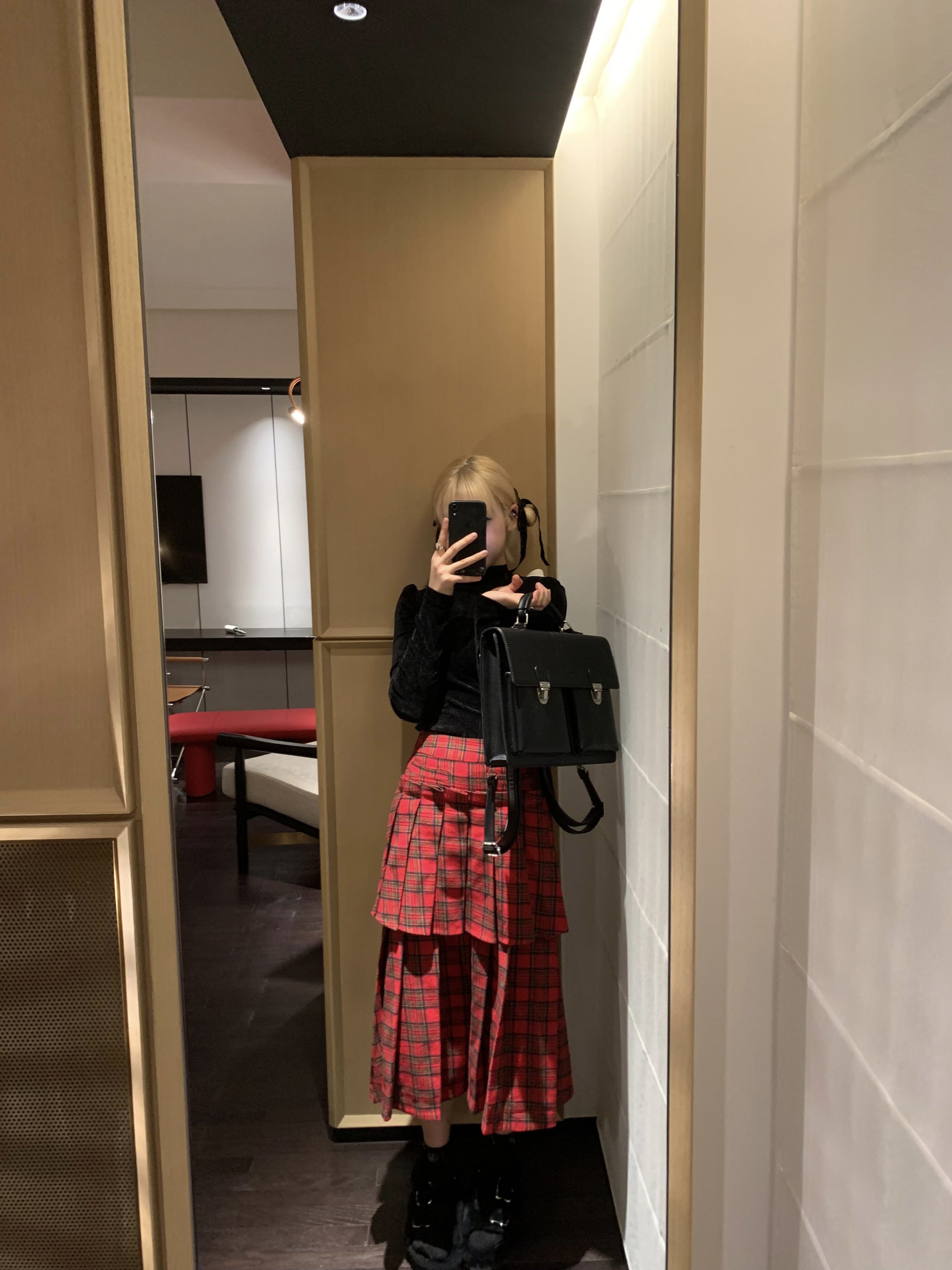 PlaceOrder 復古聖誕紅格子半身雙層設計壓褶A字秋冬中長裙子