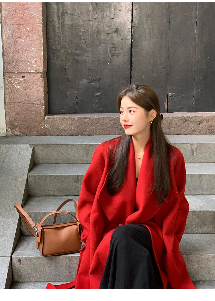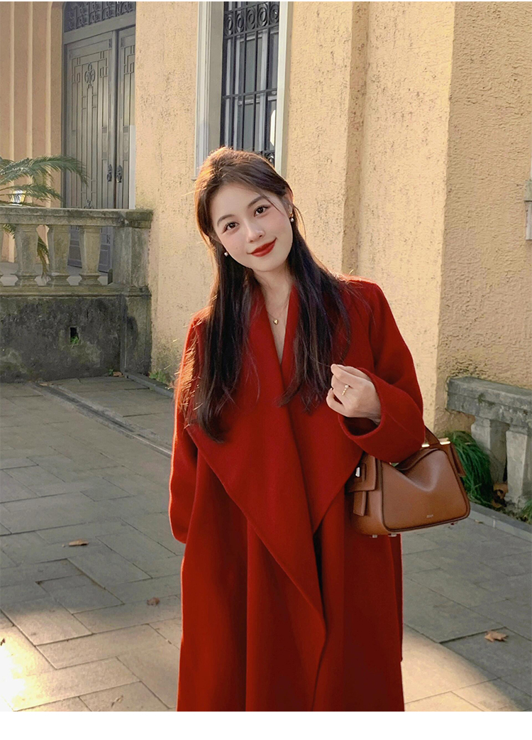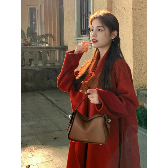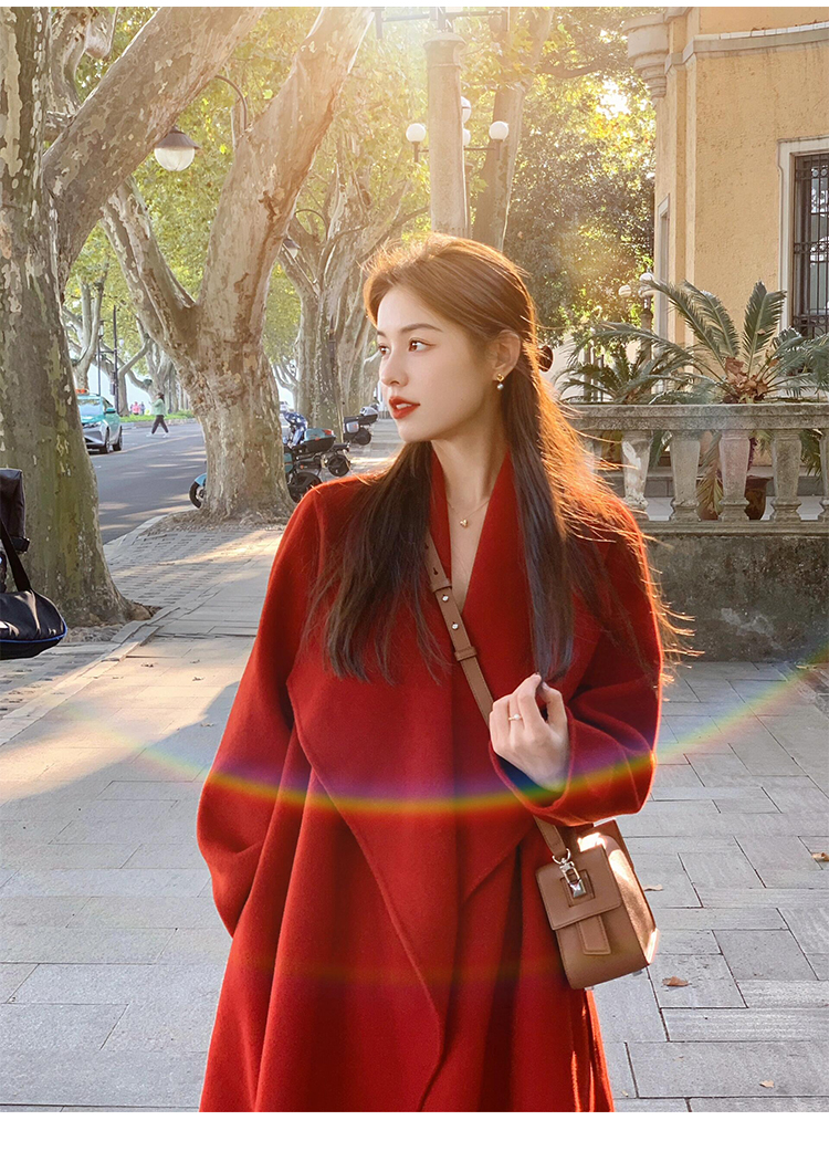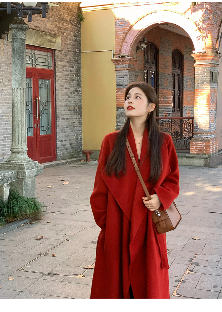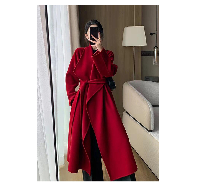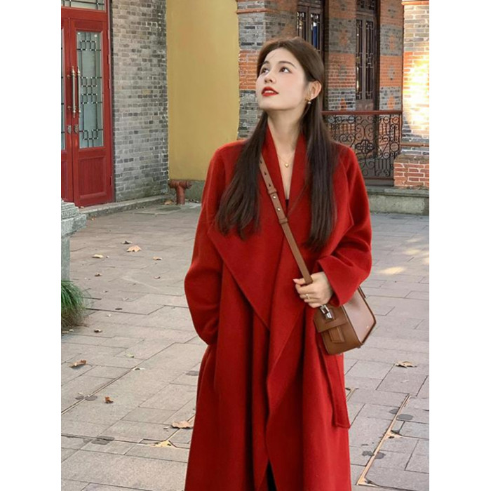 雙面羊毛大衣女2025冬季高級感聖誕紅色中長款系帶收腰毛呢外套女