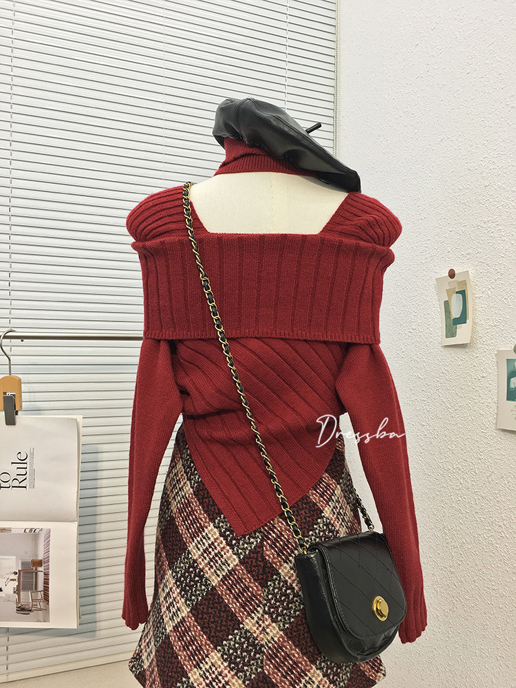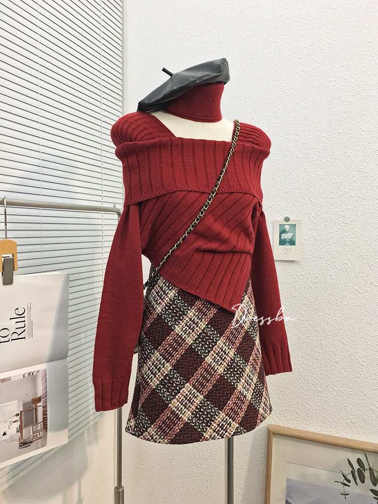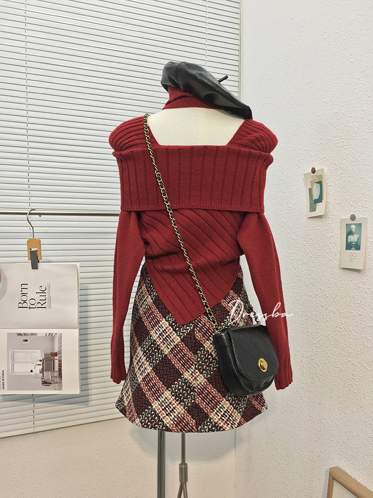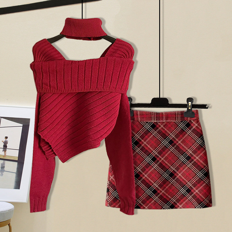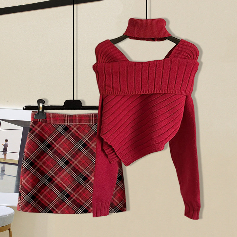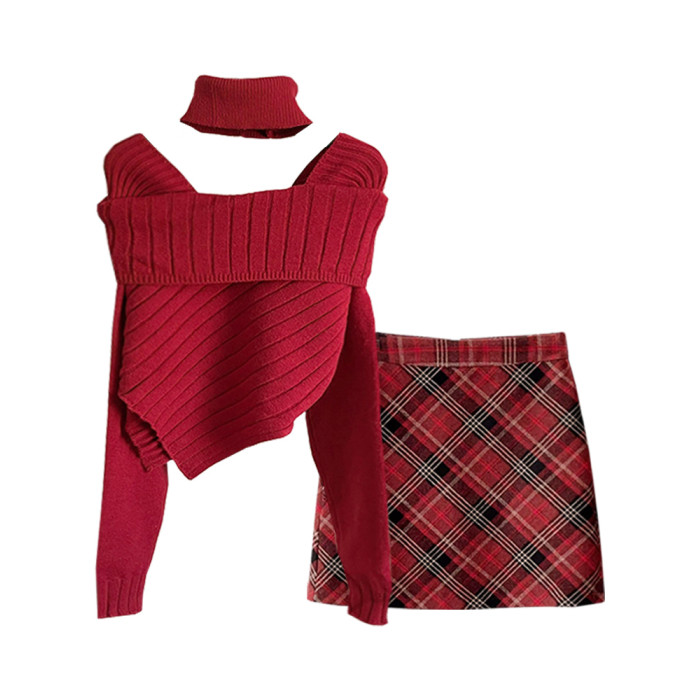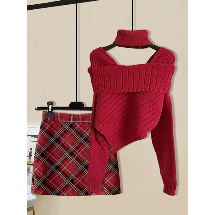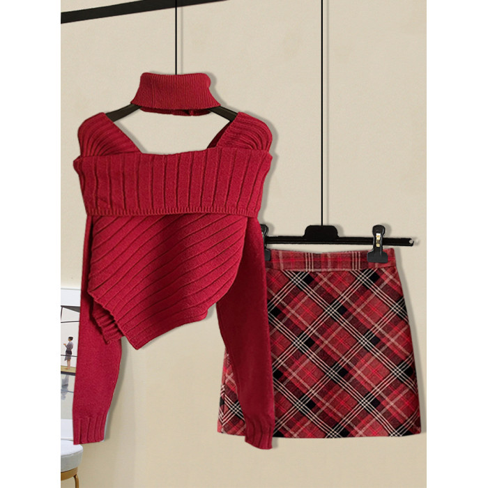 設計感純欲辣妹女秋冬新款聖誕紅掛脖不規則毛衣格紋短裙兩件套裝