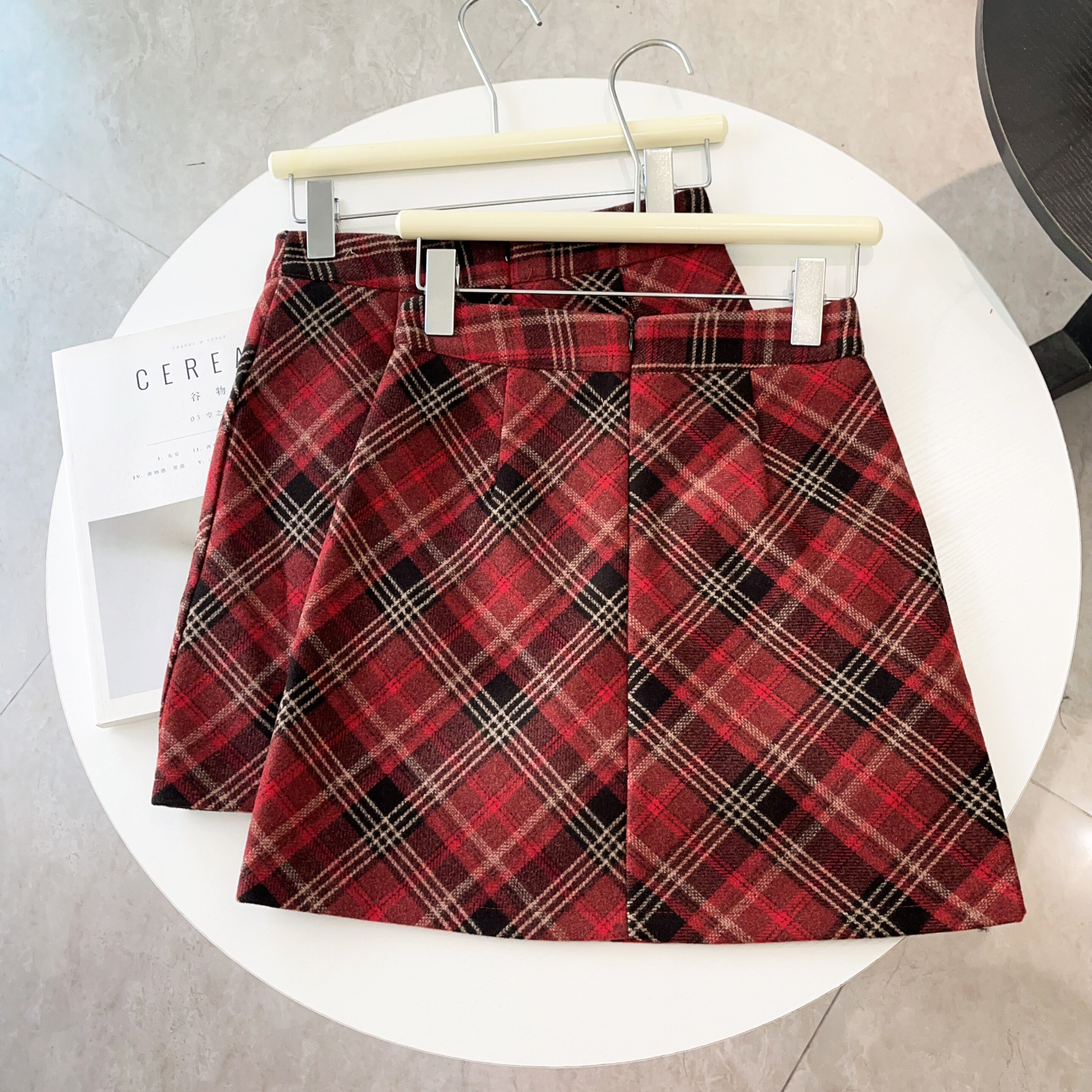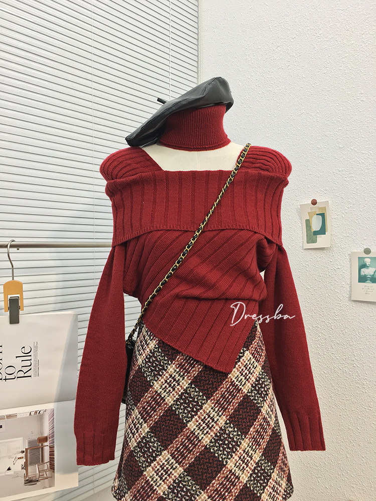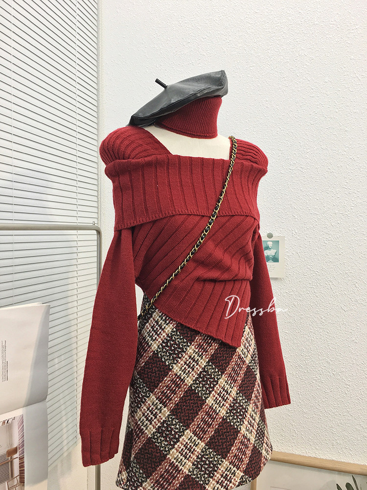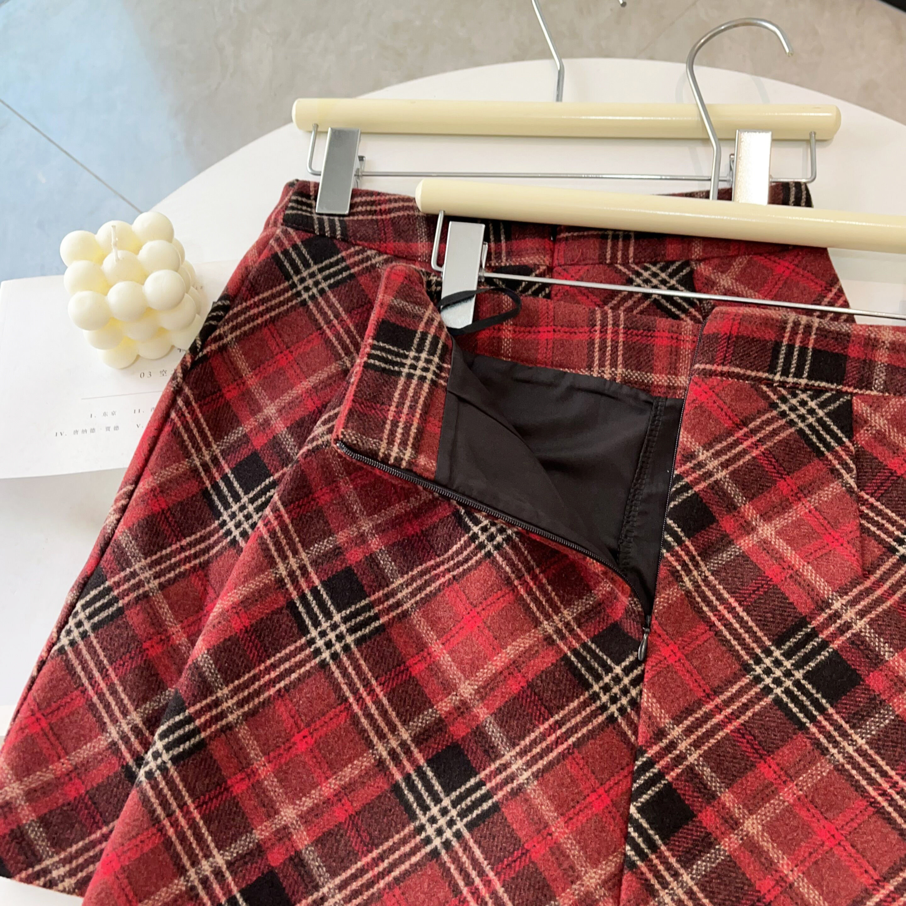 設計感純欲辣妹女秋冬新款聖誕紅掛脖不規則毛衣格紋短裙兩件套裝