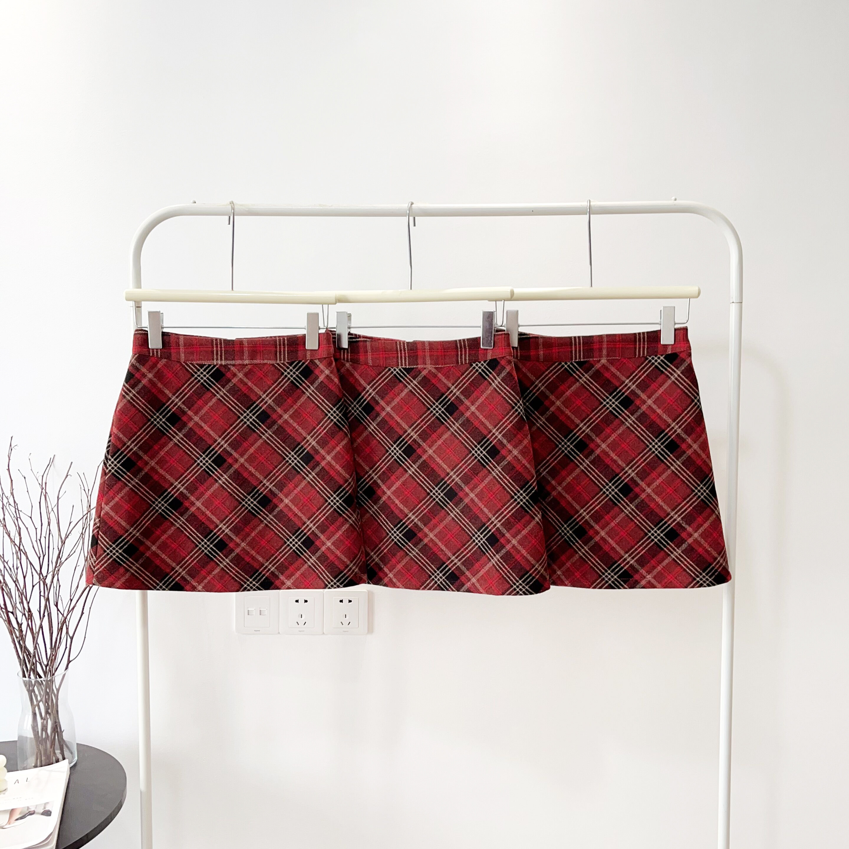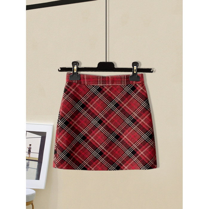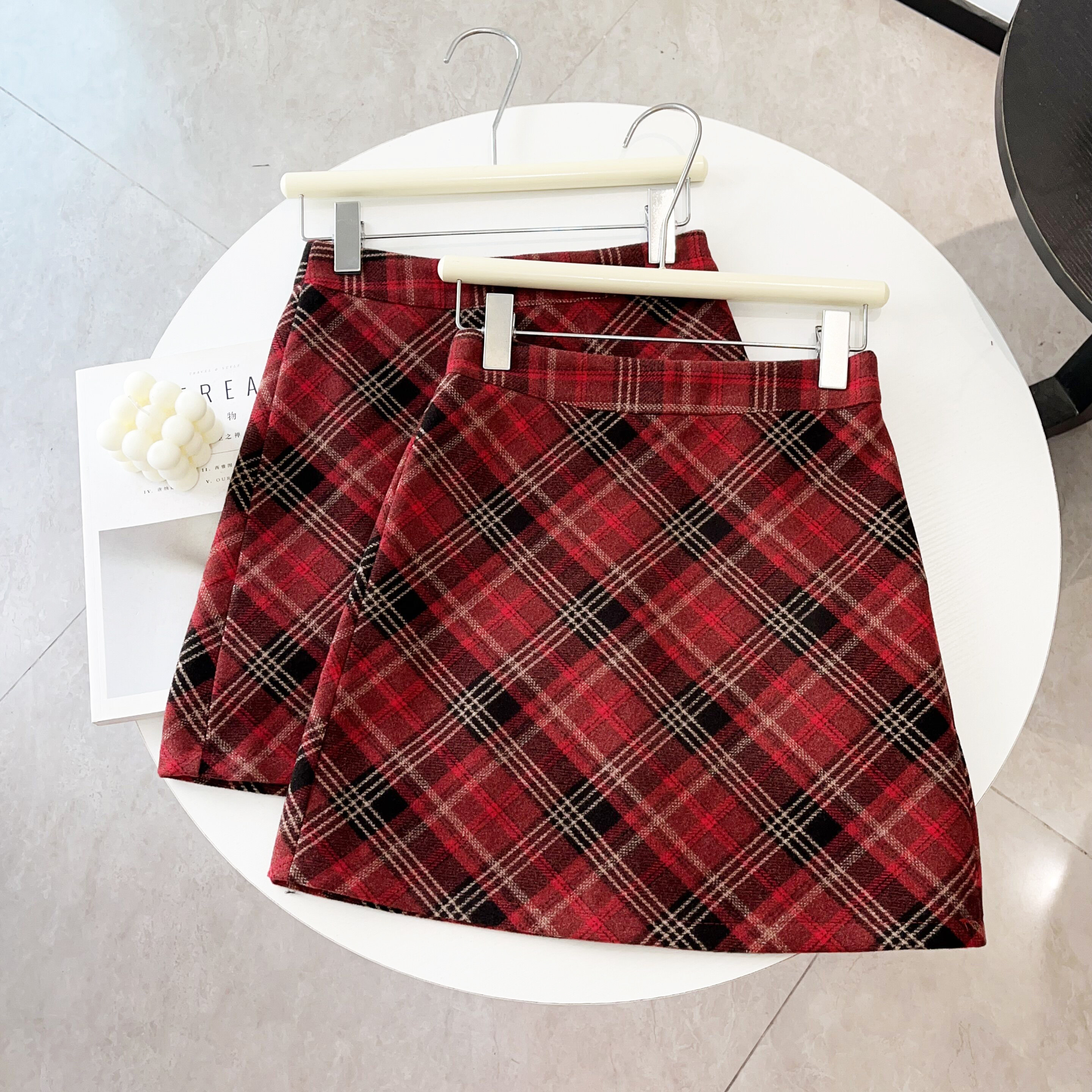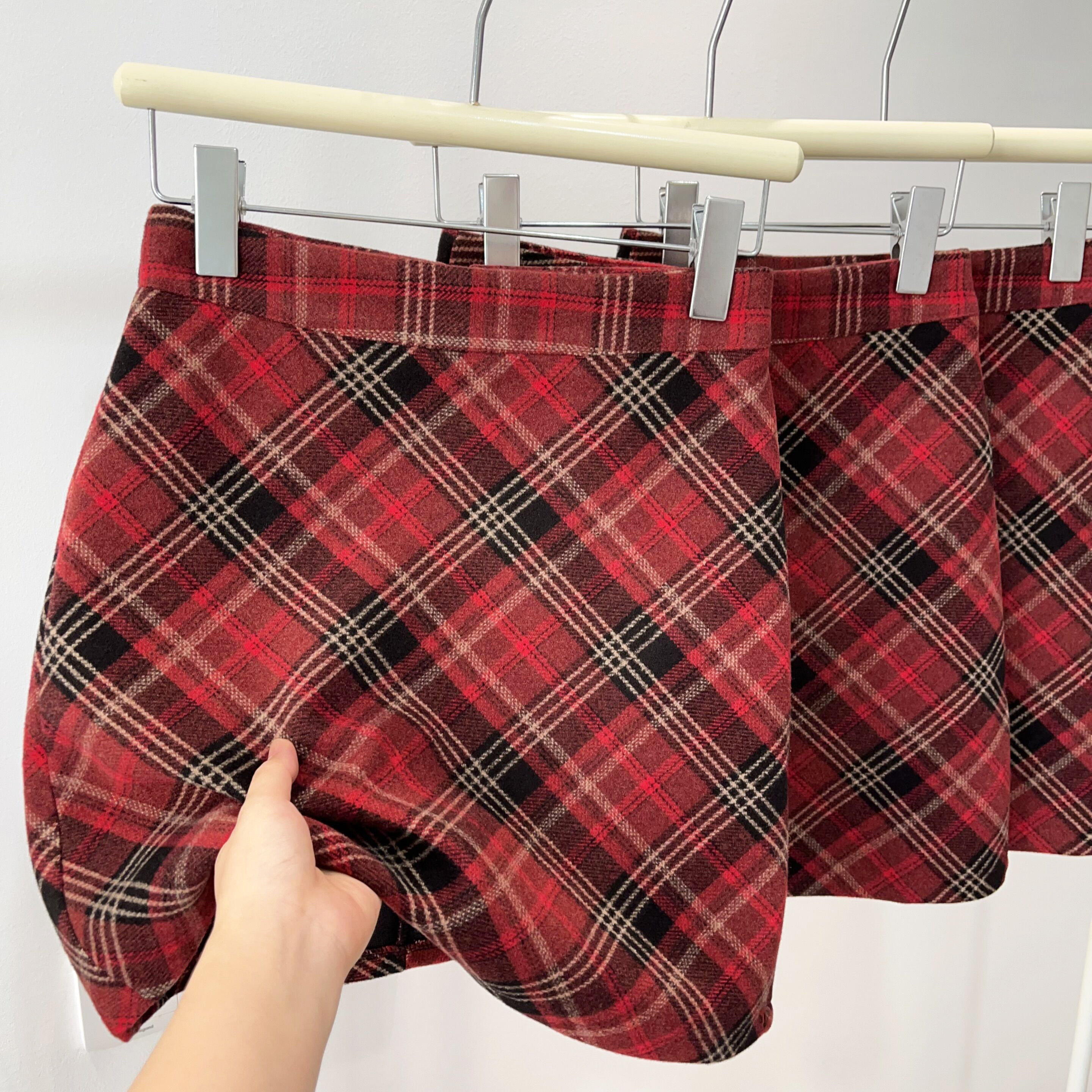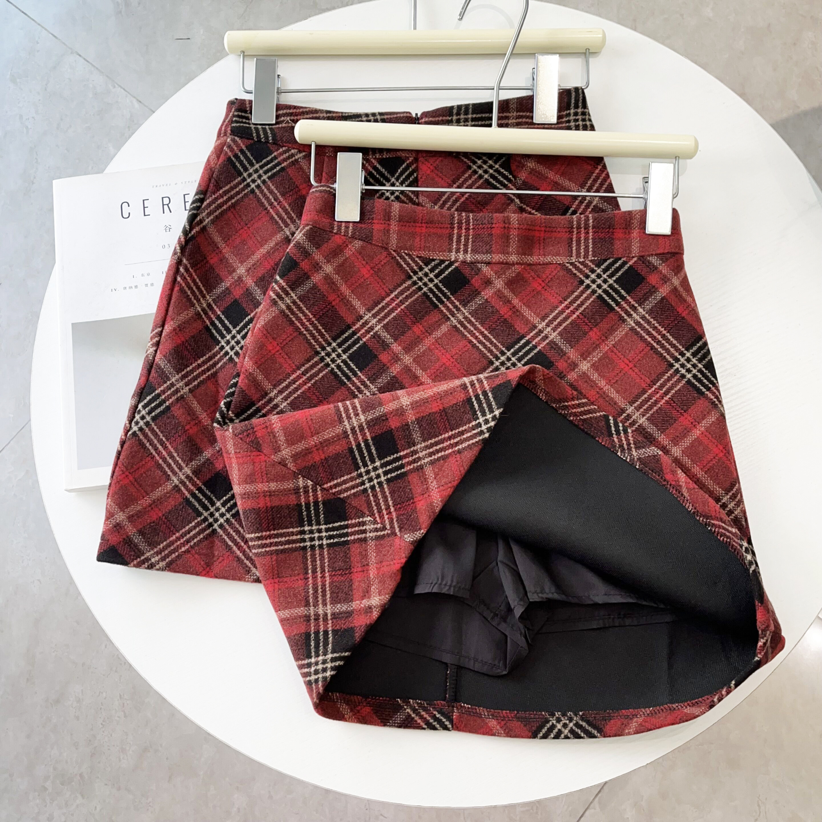 設計感純欲辣妹女秋冬新款聖誕紅掛脖不規則毛衣格紋短裙兩件套裝