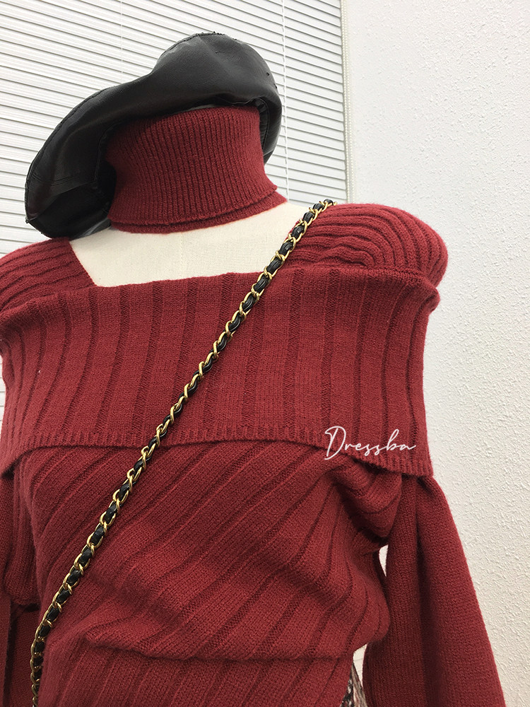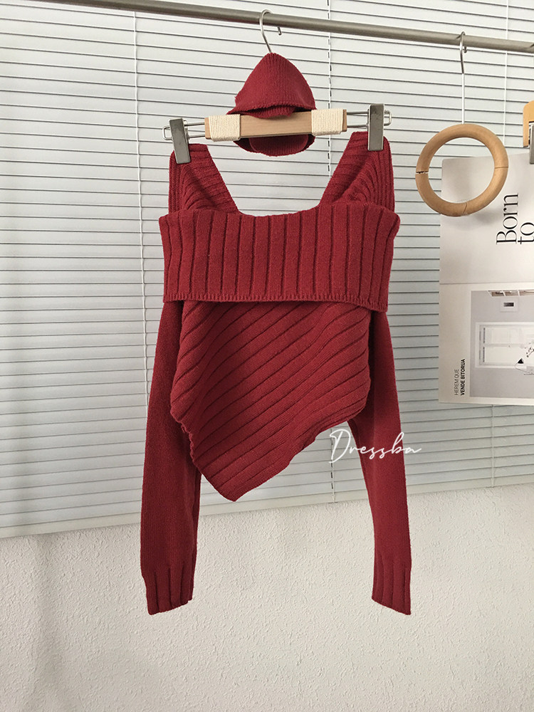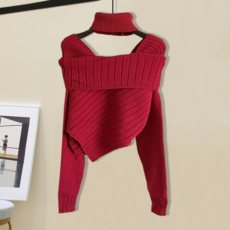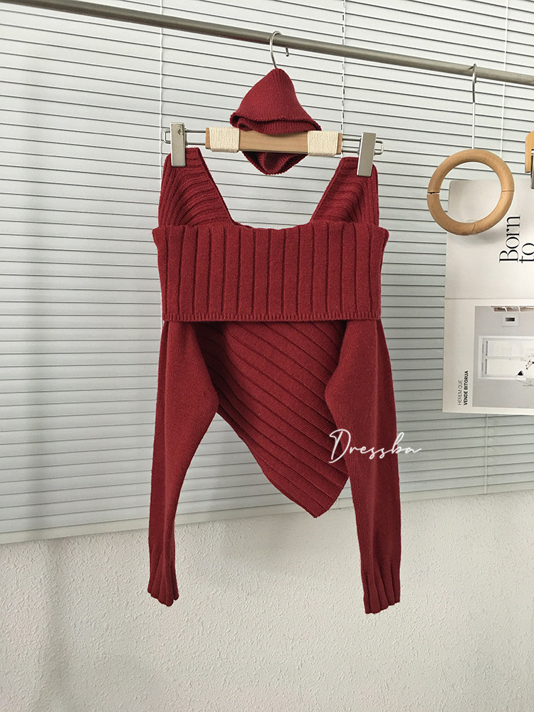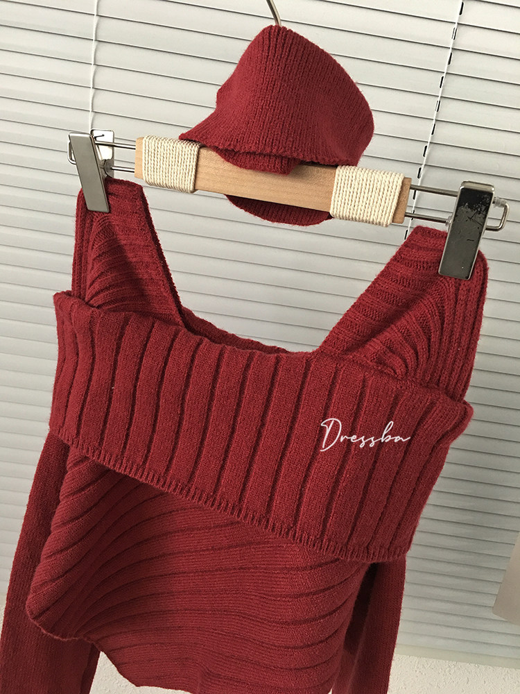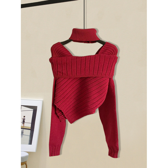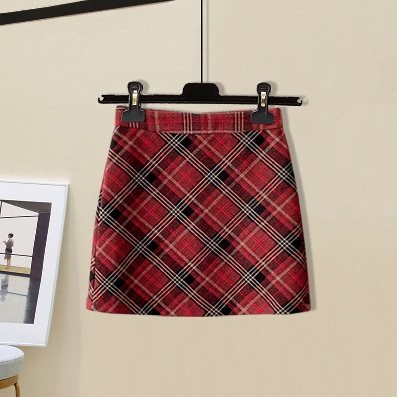 設計感純欲辣妹女秋冬新款聖誕紅掛脖不規則毛衣格紋短裙兩件套裝