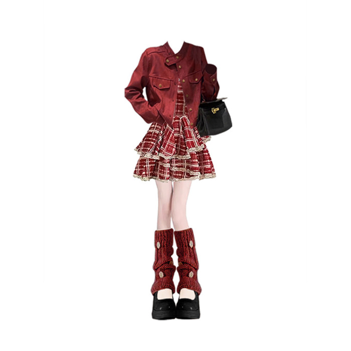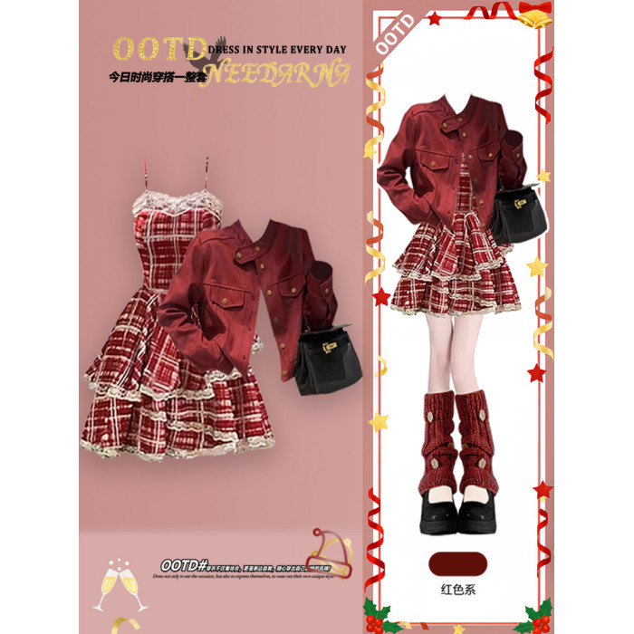 萬聖節深秋初冬季一整套穿搭高級感巨好看的小香風聖誕紅色連衣裙