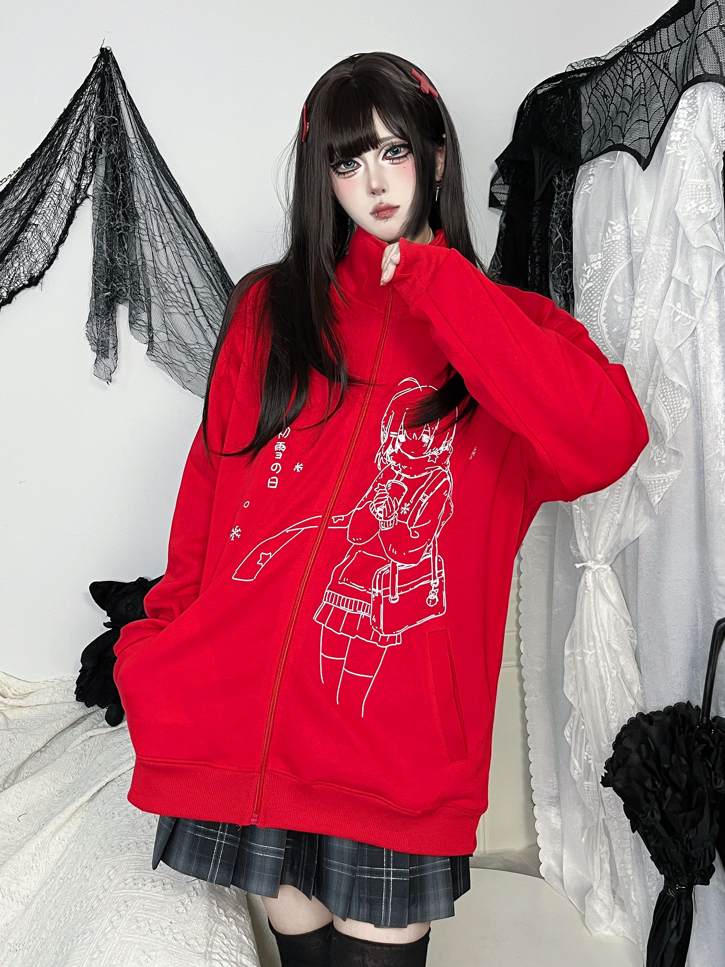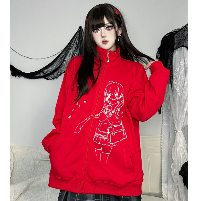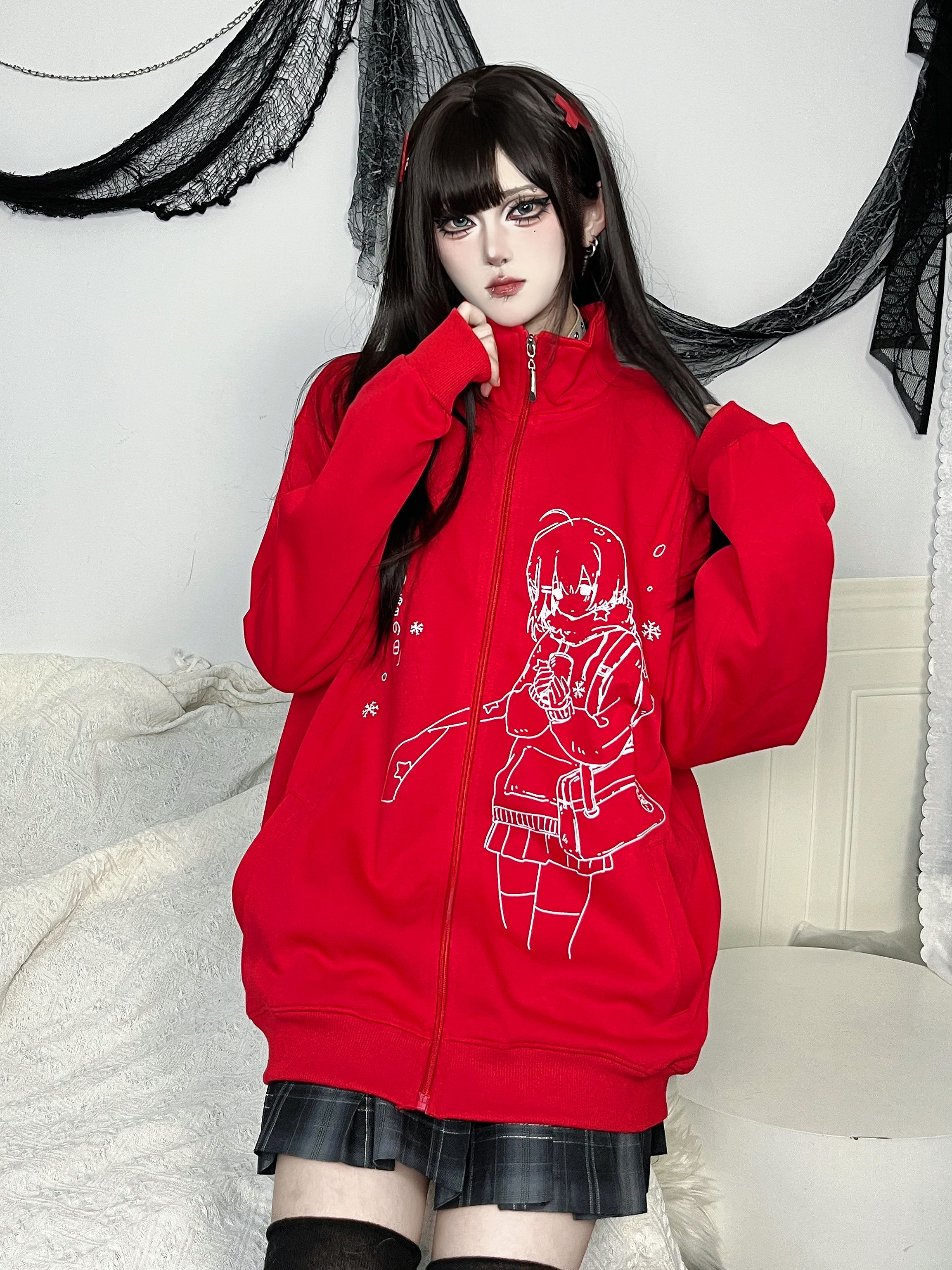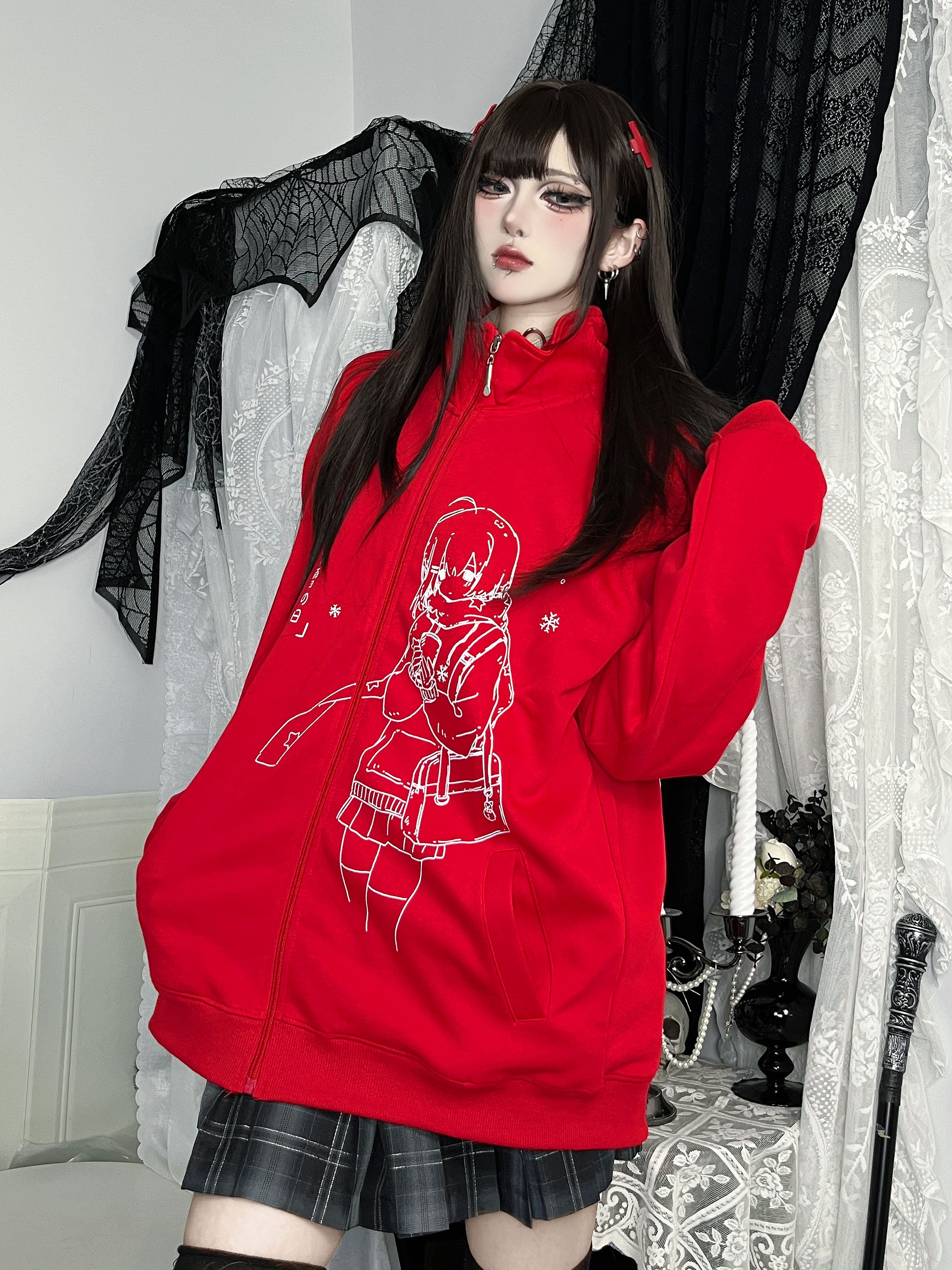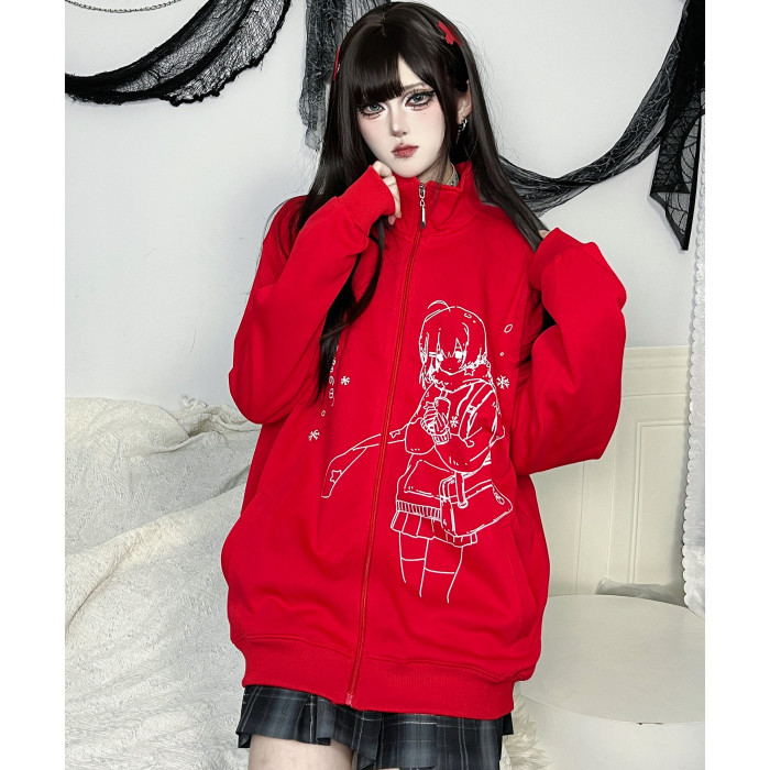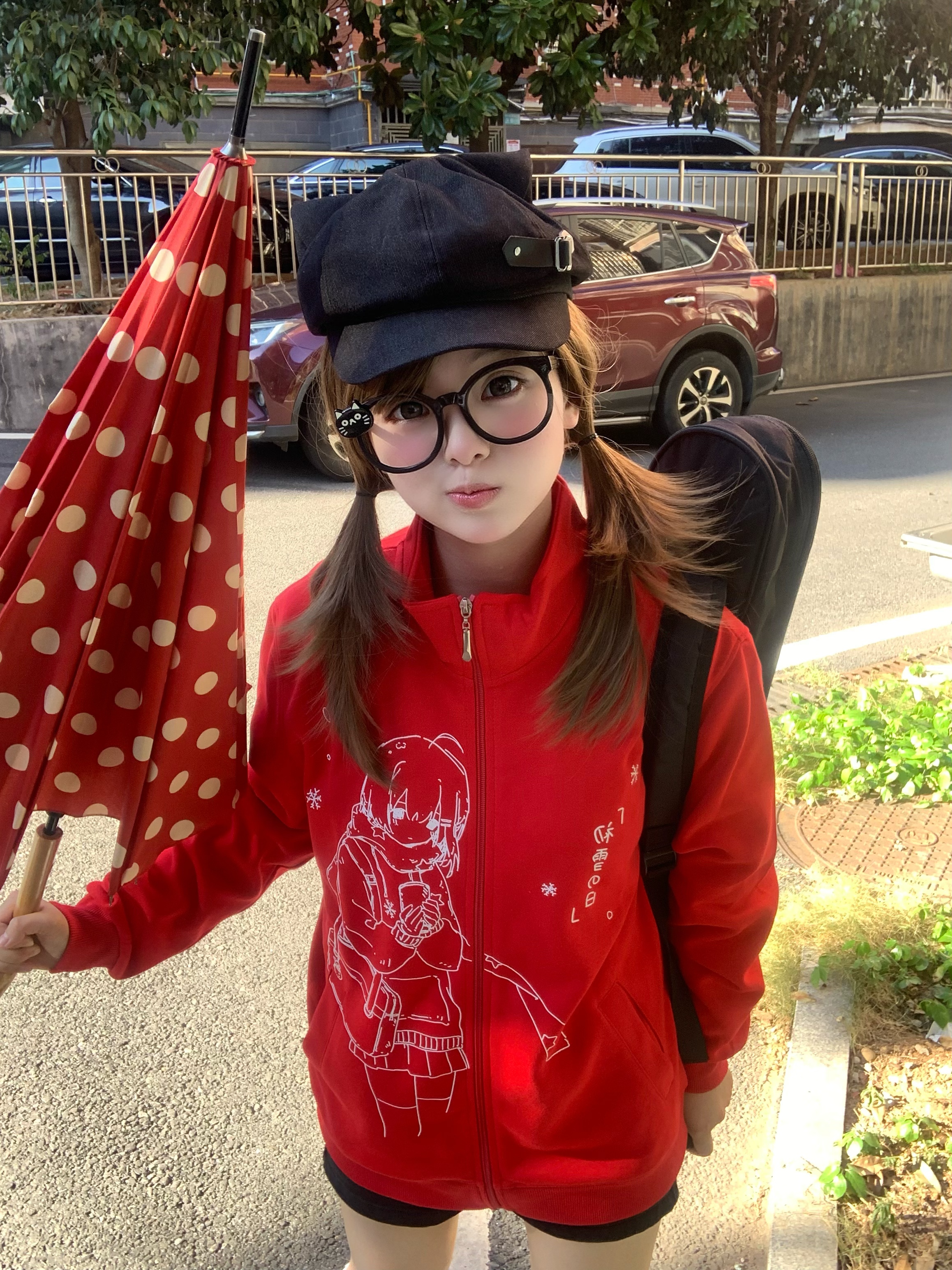 車日時 初雪日聖誕紅原創立領拉鍊外套加絨日系萌感宅宅