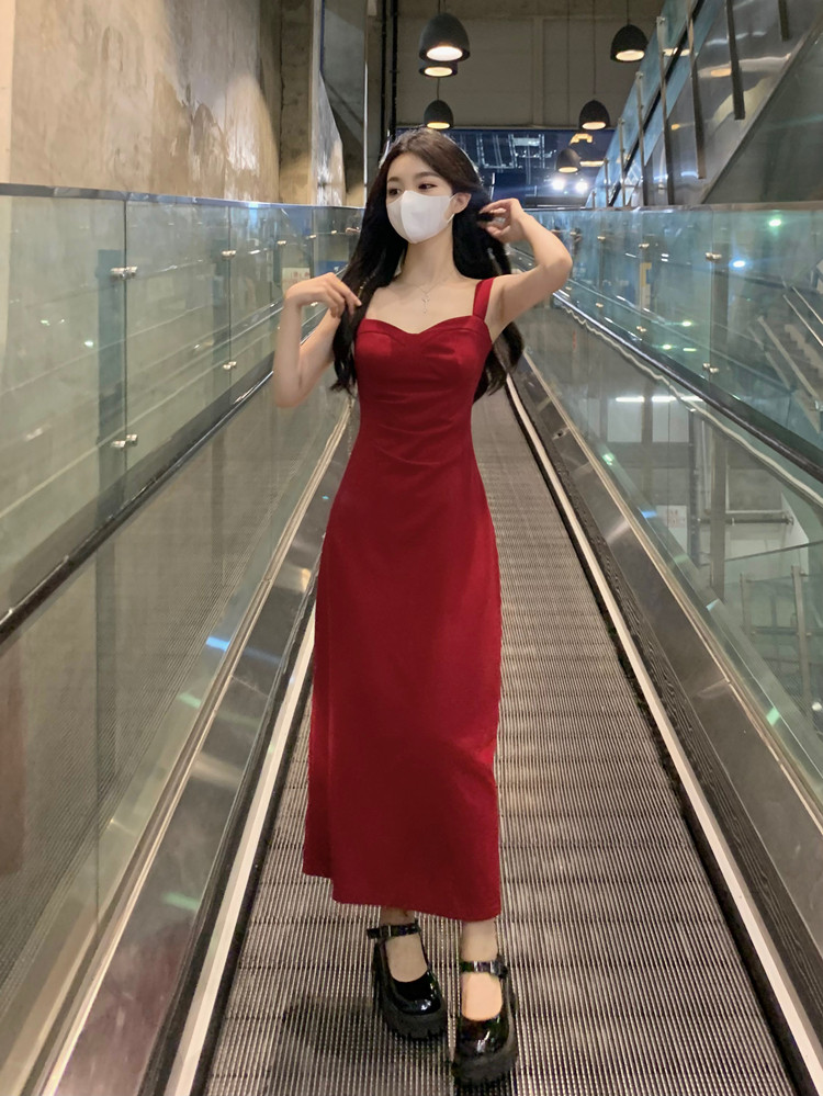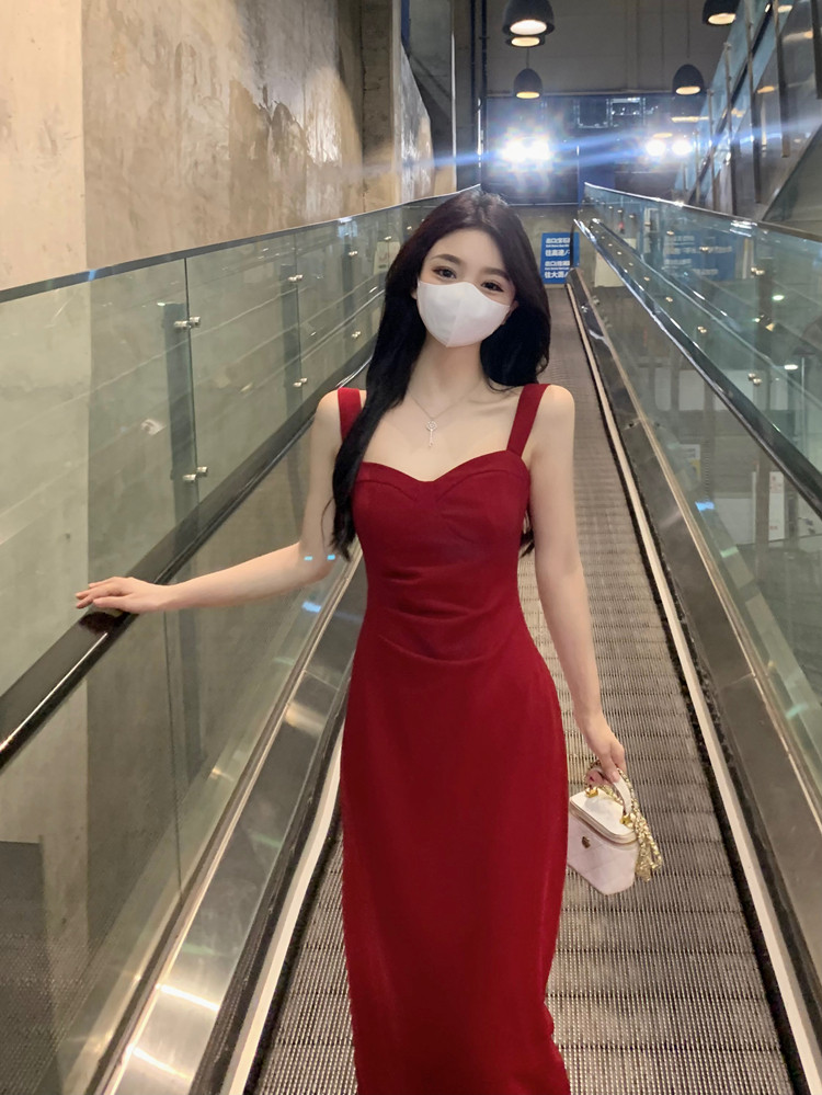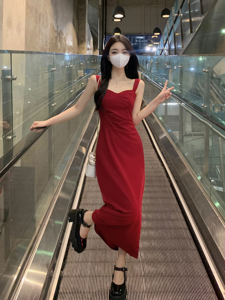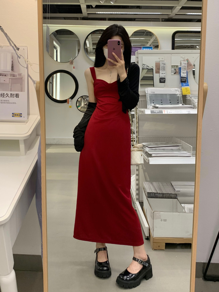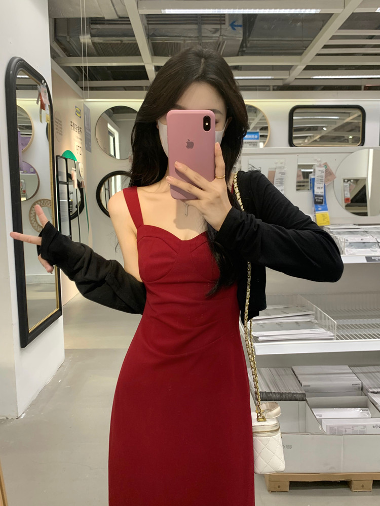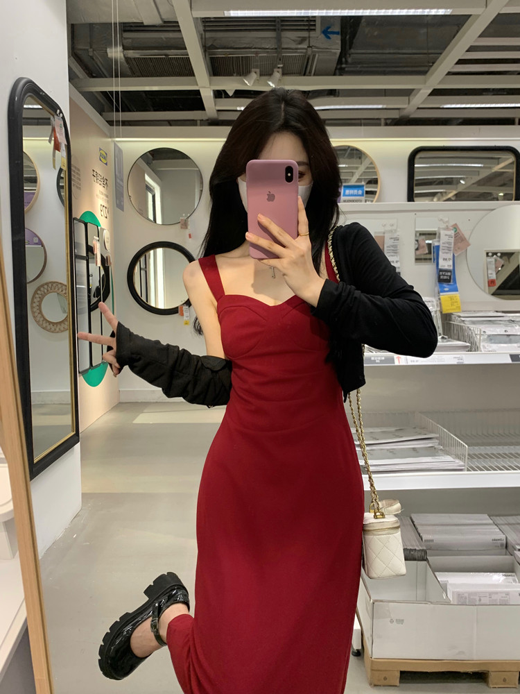 聖誕紅色吊帶連衣裙2025秋季大碼胖mm顯瘦高級感收腰長裙外搭套裝