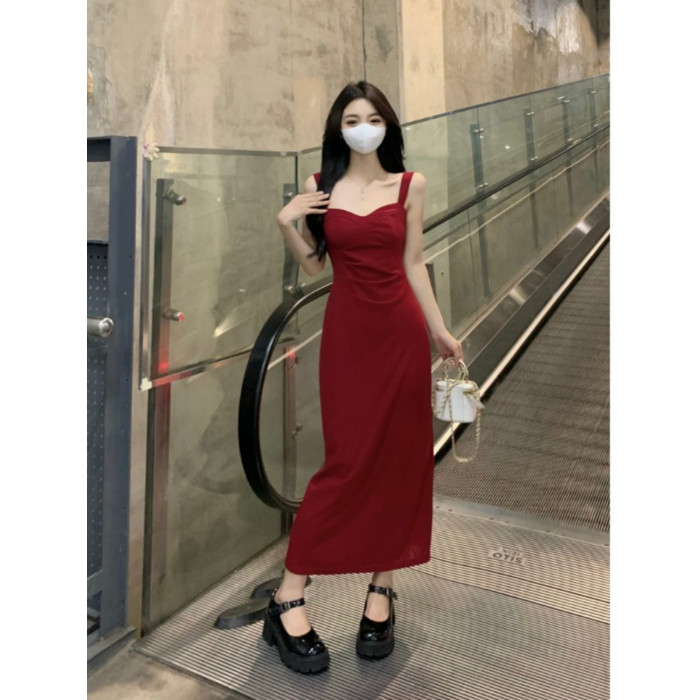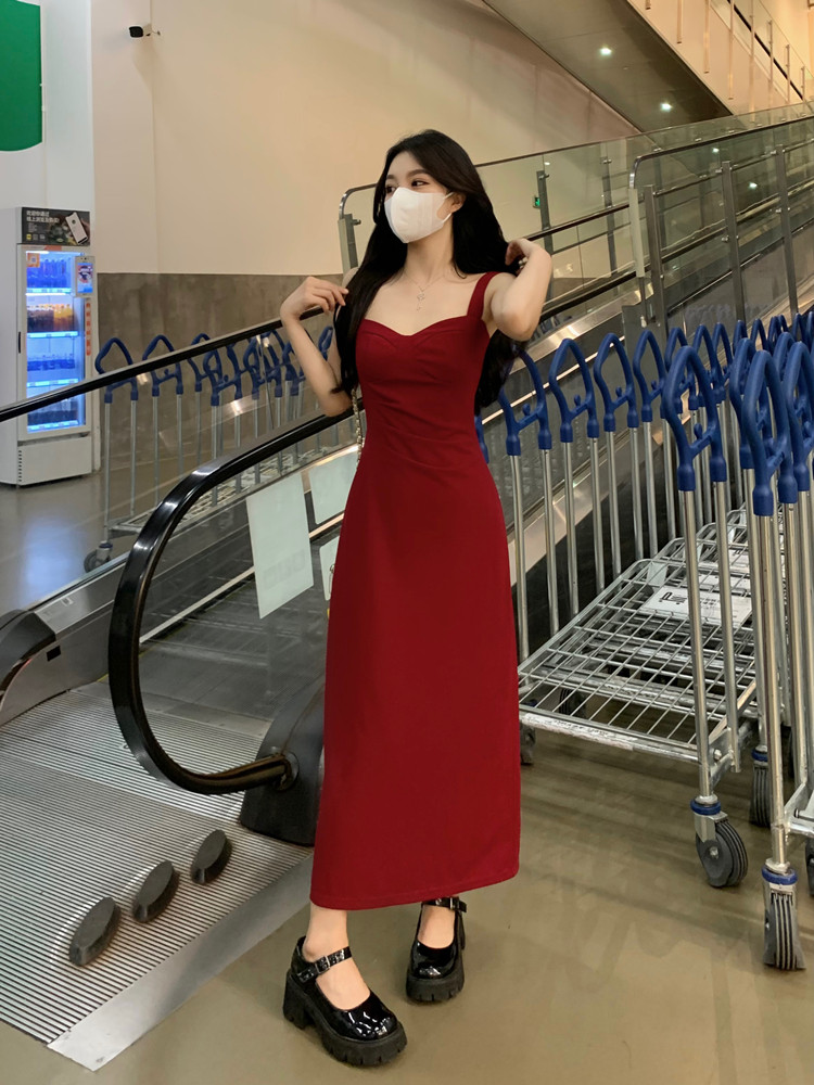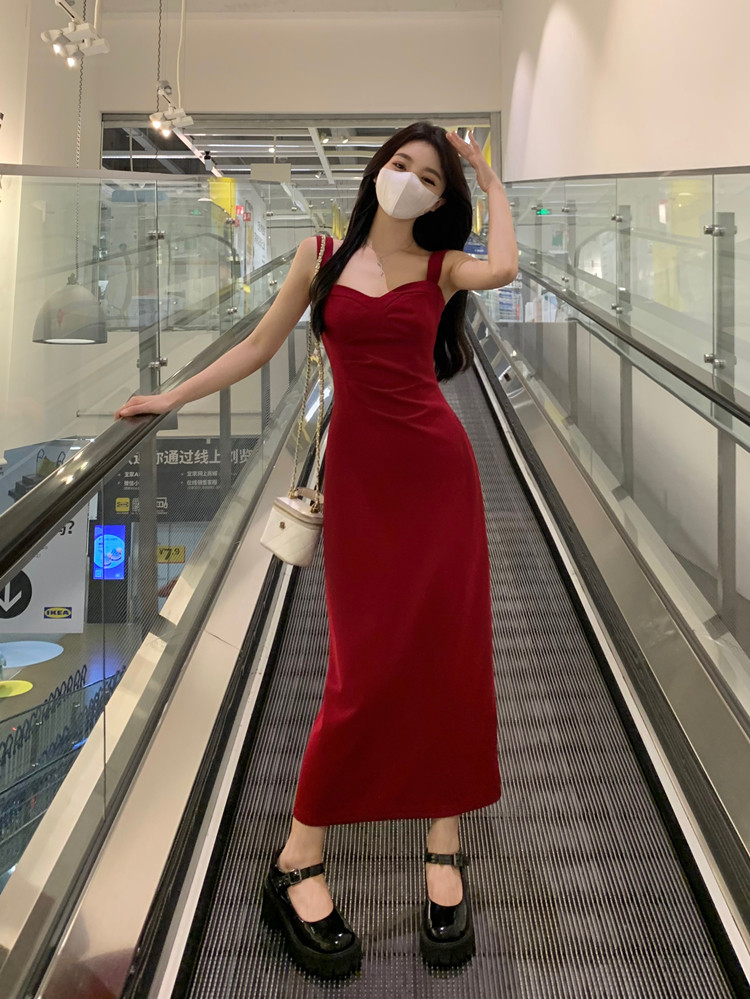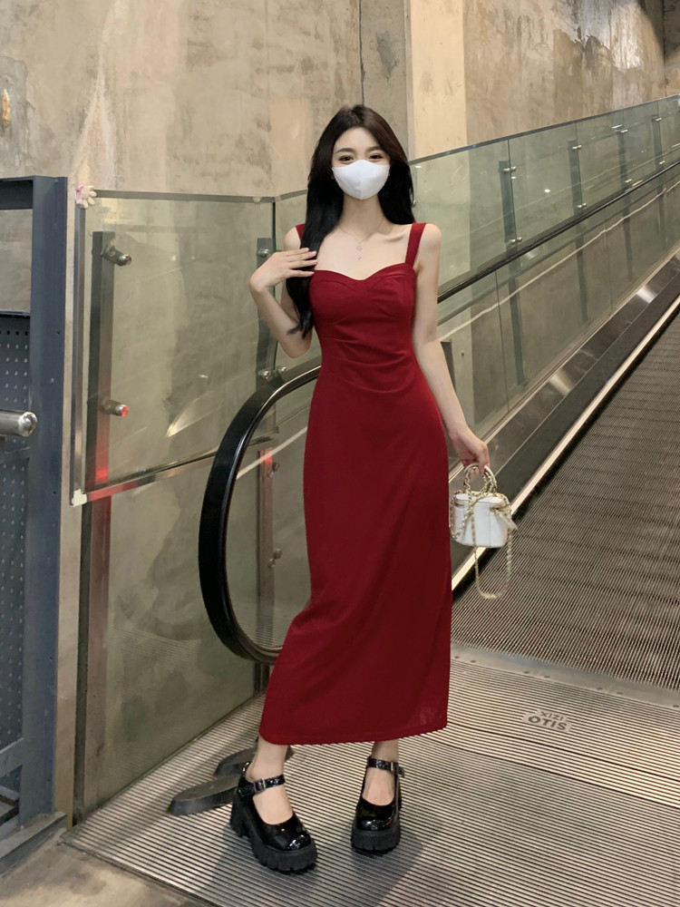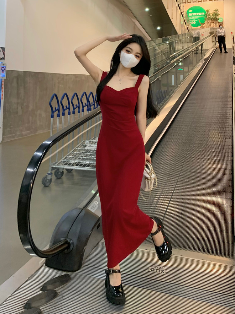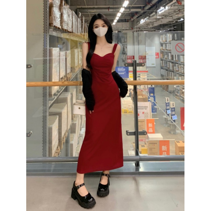 聖誕紅色吊帶連衣裙2025秋季大碼胖mm顯瘦高級感收腰長裙外搭套裝