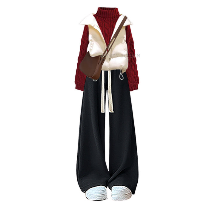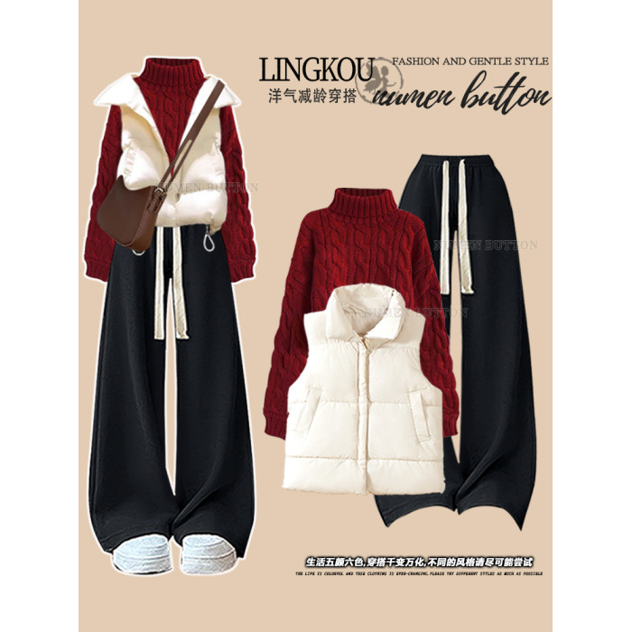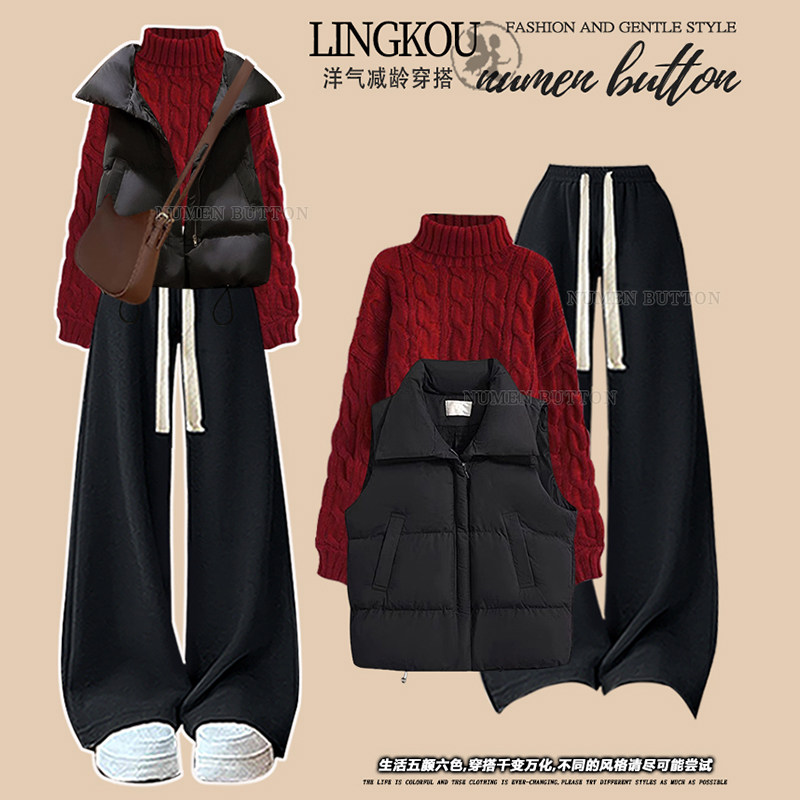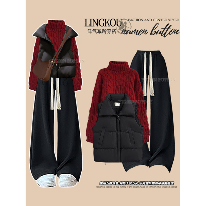 大碼春秋小香風套裝女休閒馬甲外套聖誕紅色針織毛衣休閒褲三件套
