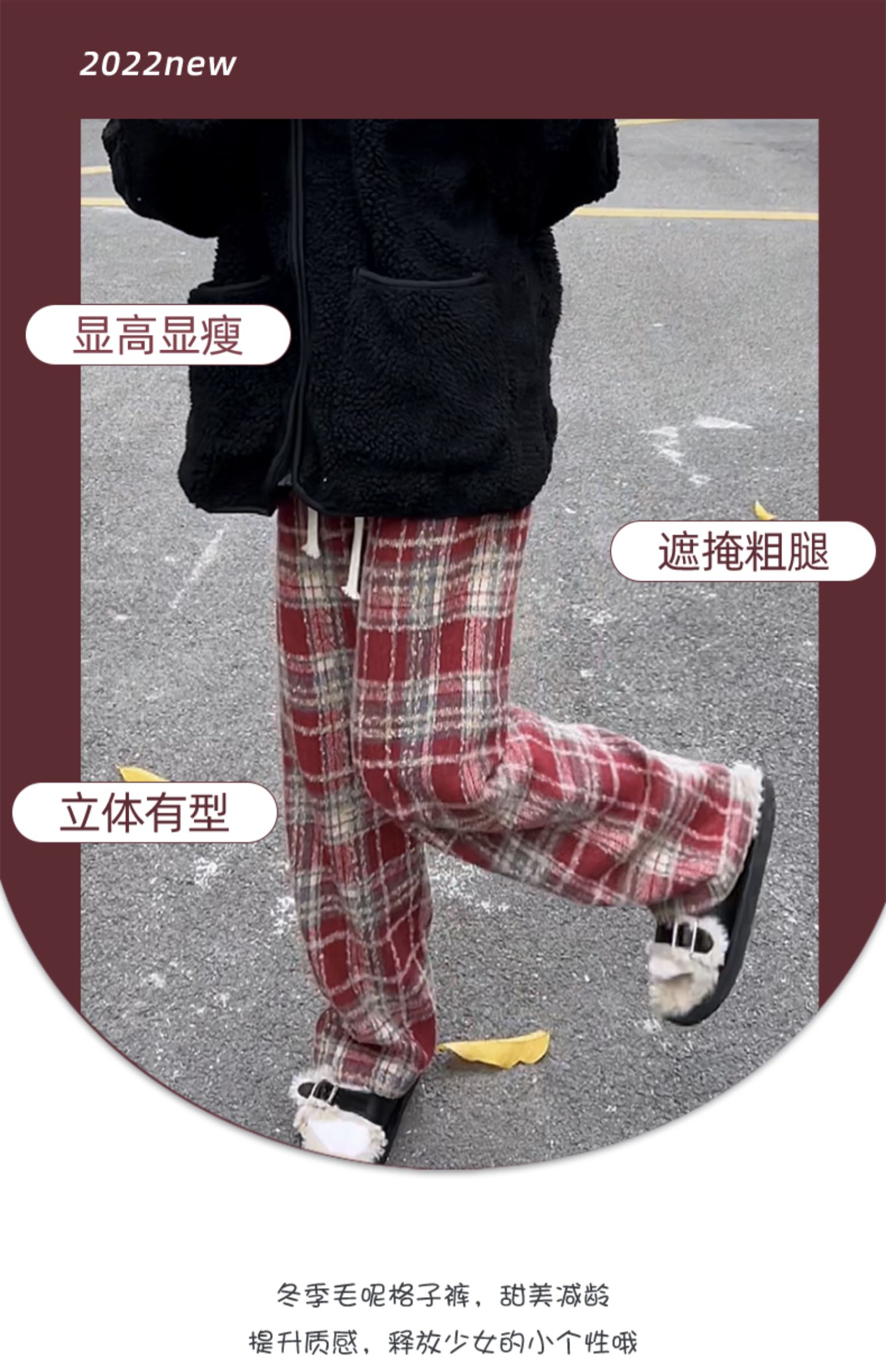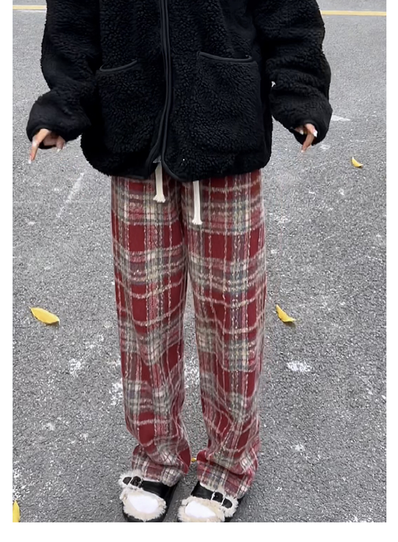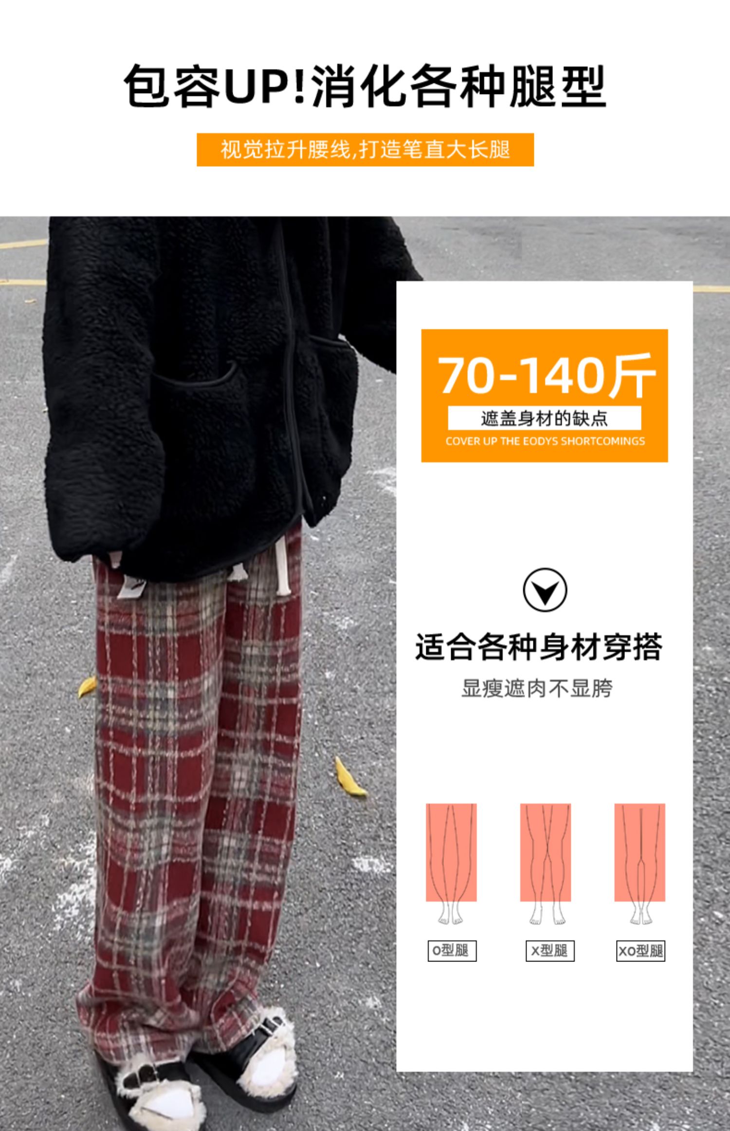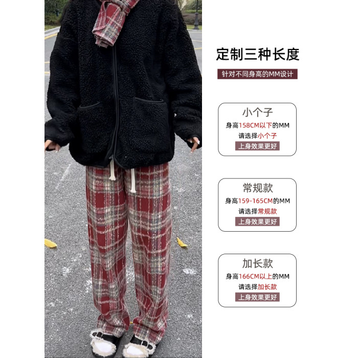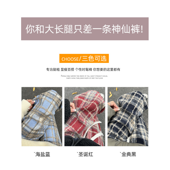 聖誕紅色加絨格子褲女秋季季高腰垂感休閒直筒長褲毛呢窄版濶腿褲
