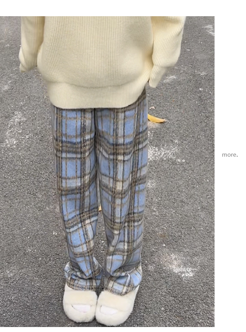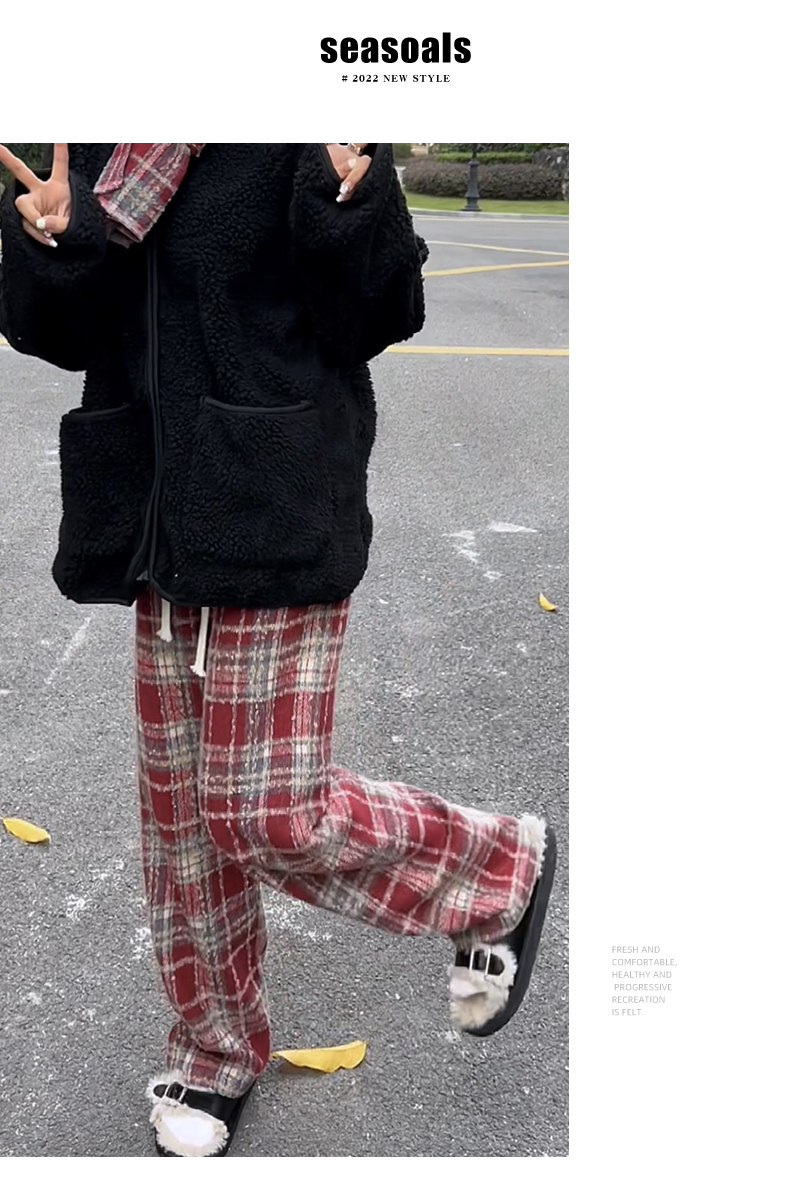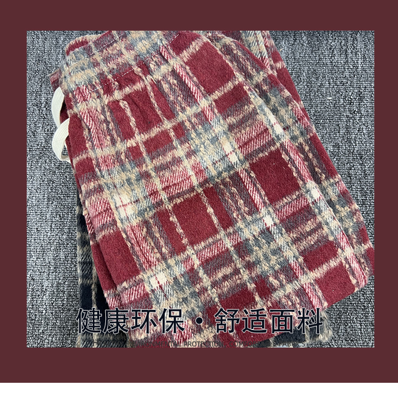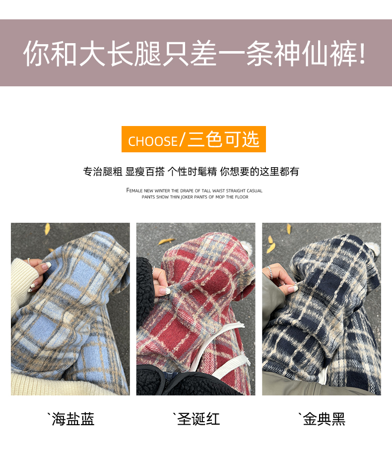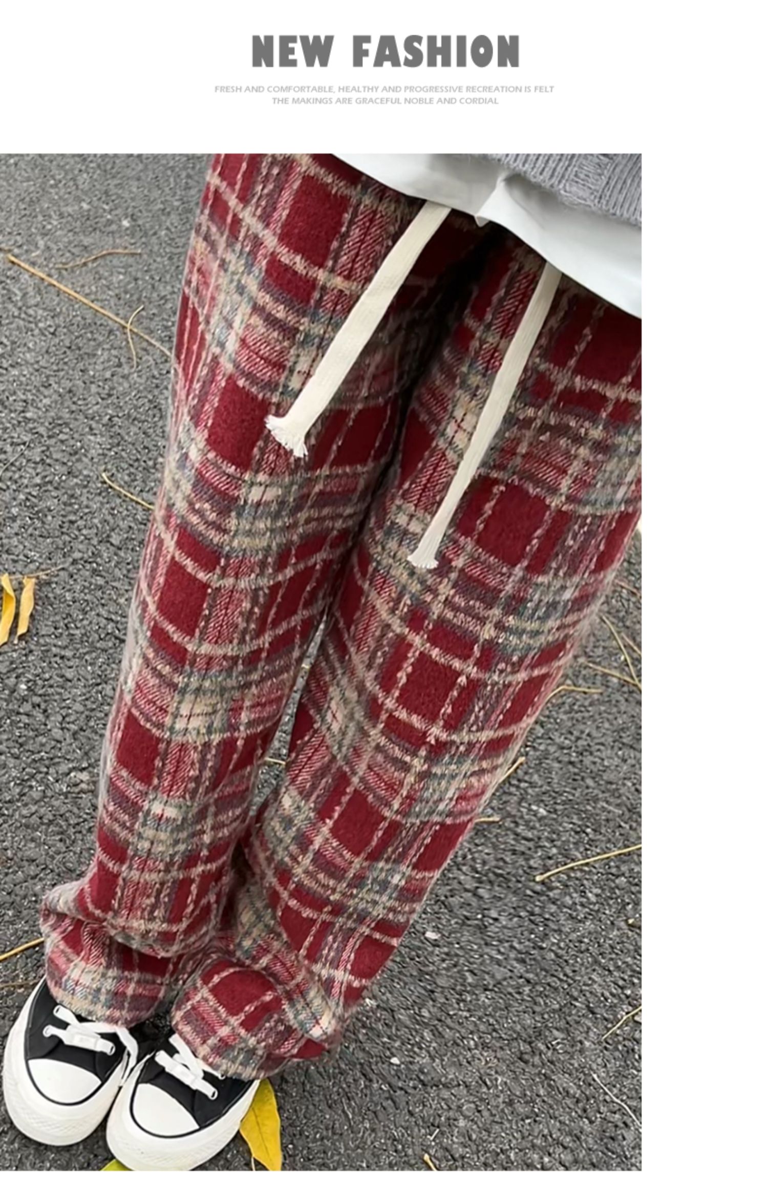 聖誕紅色加絨格子褲女秋季季高腰垂感休閒直筒長褲毛呢窄版濶腿褲
