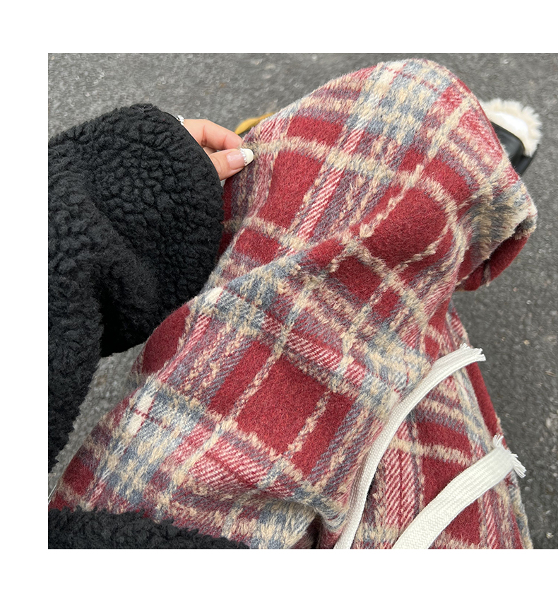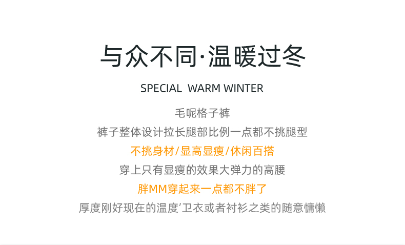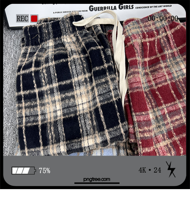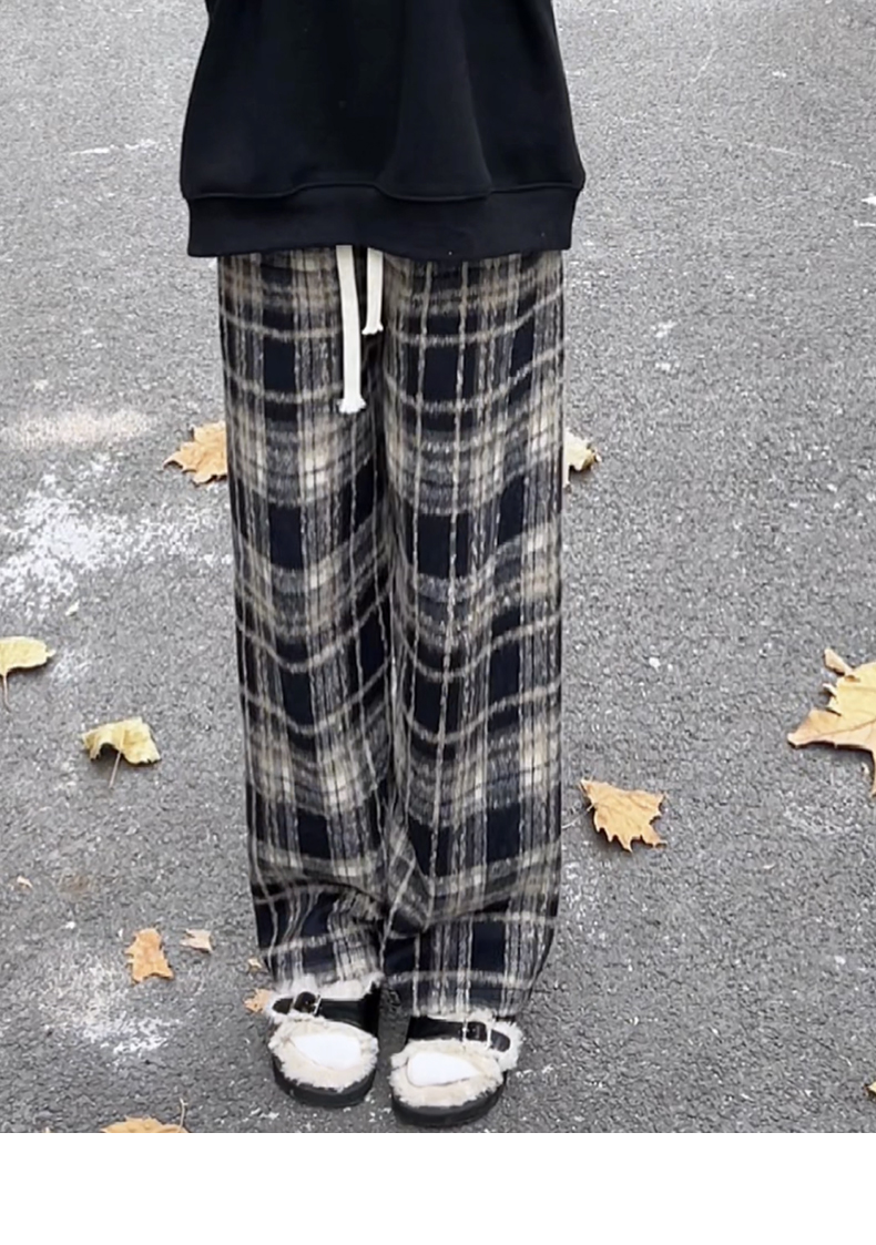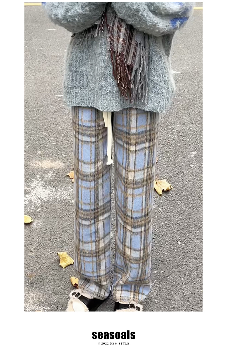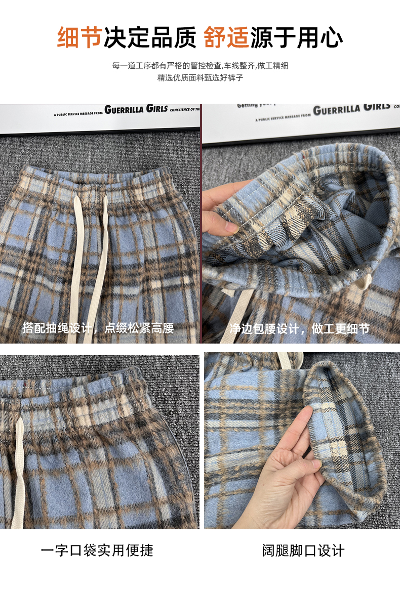 聖誕紅色加絨格子褲女秋季季高腰垂感休閒直筒長褲毛呢窄版濶腿褲