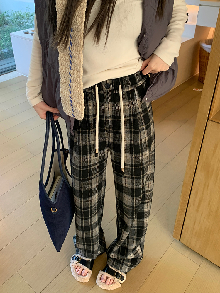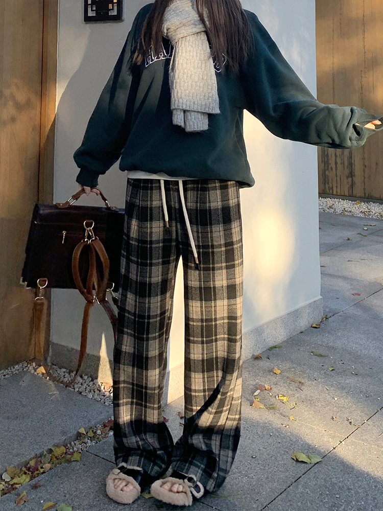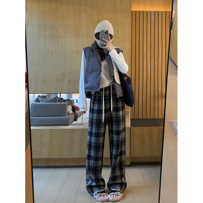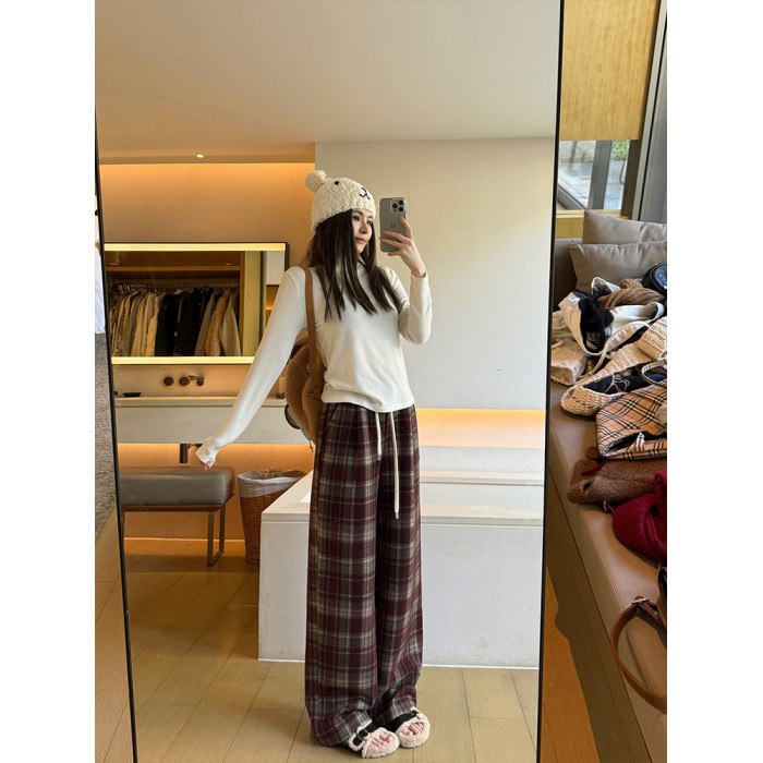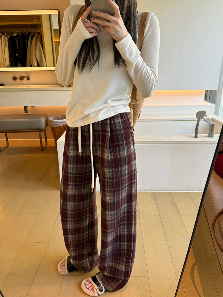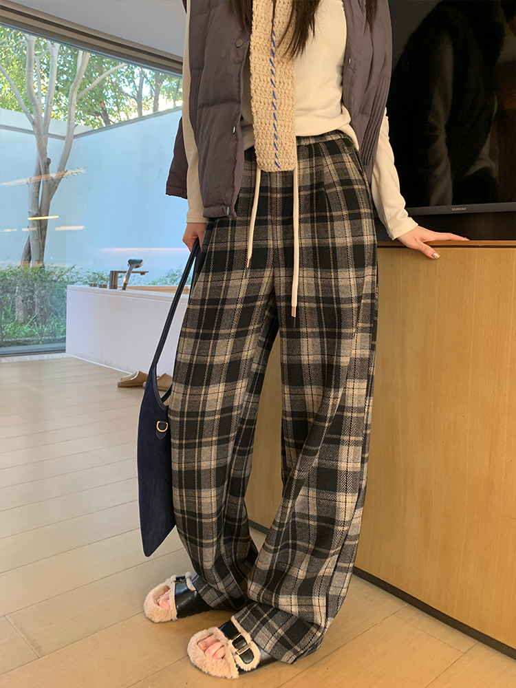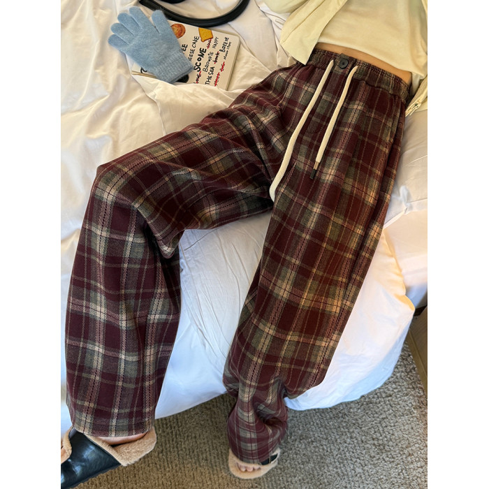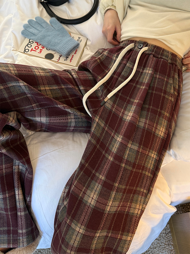 加絨聖誕紅格子褲秋冬慵懶抽繩垂感拖地直筒褲子復古毛呢濶腿褲女
