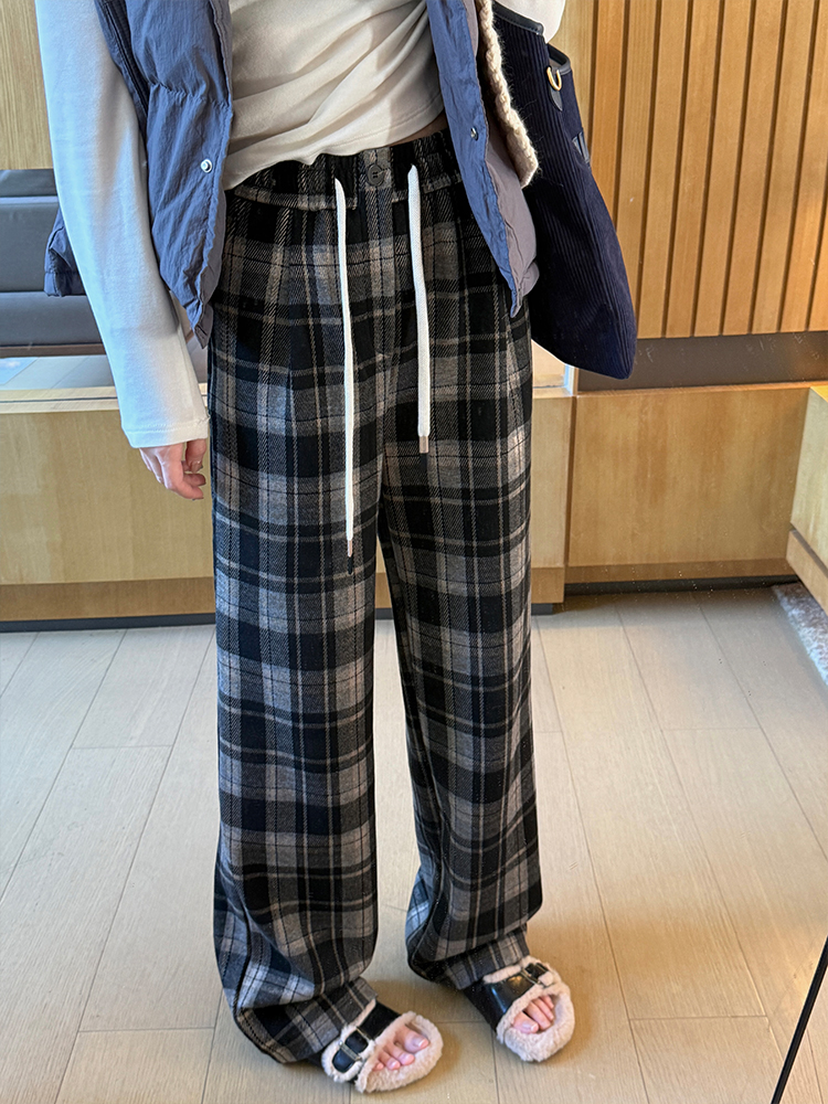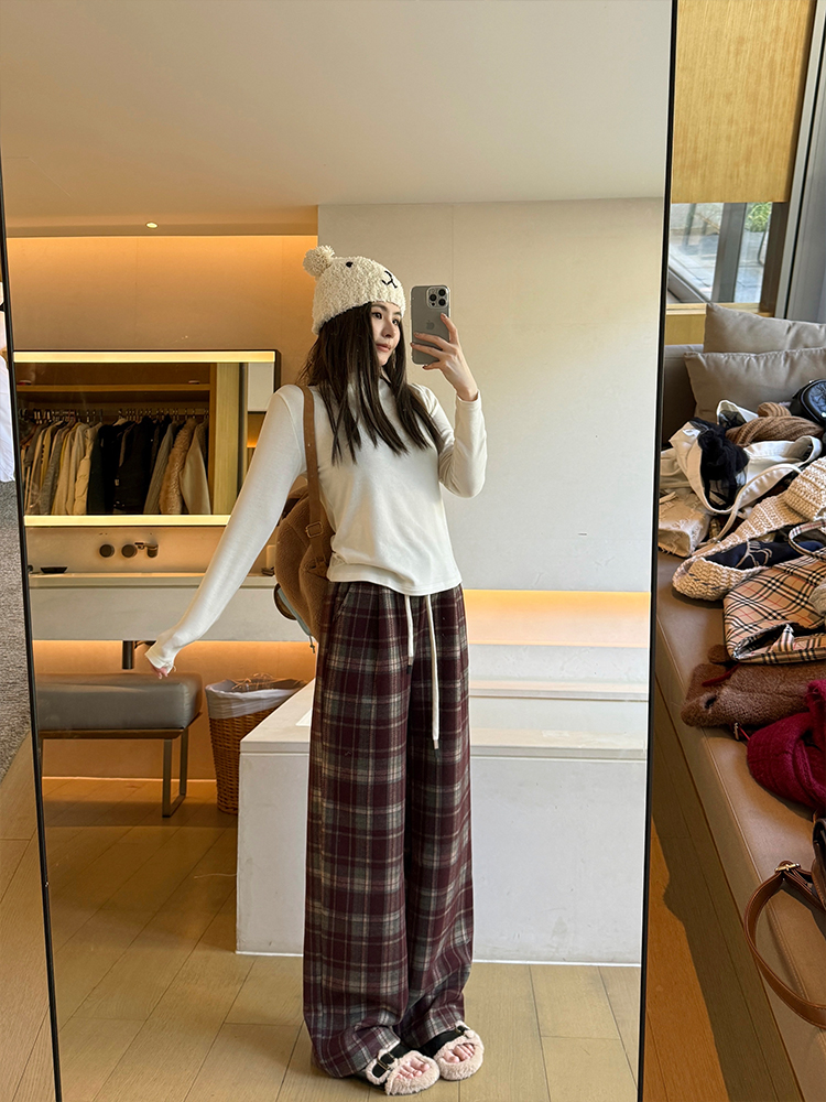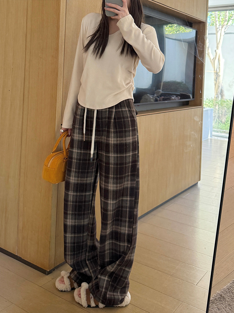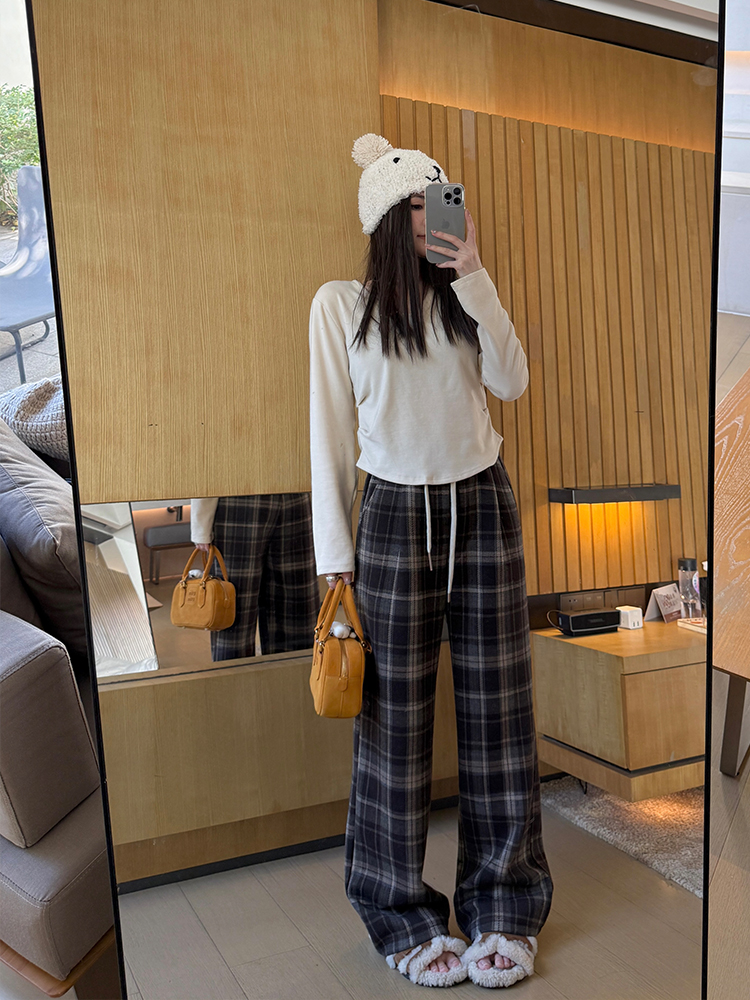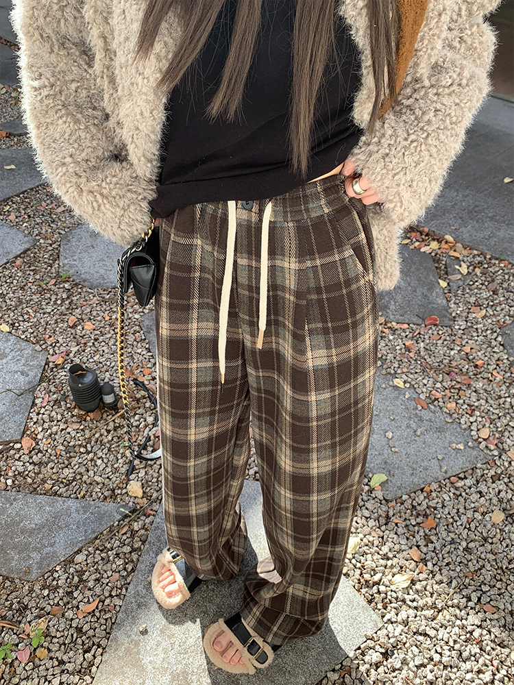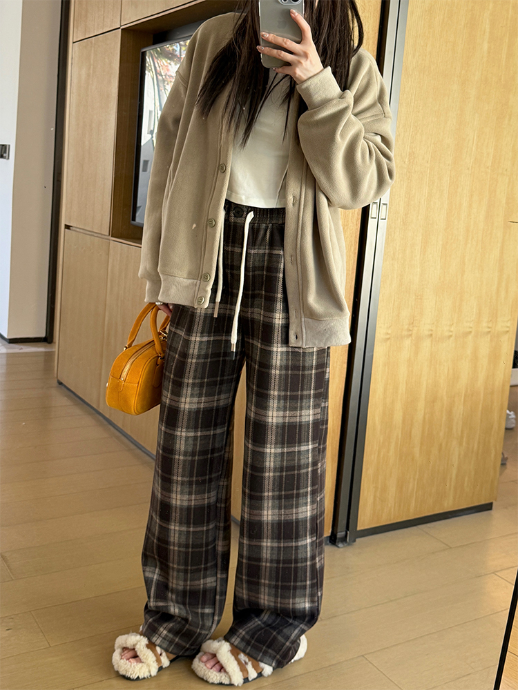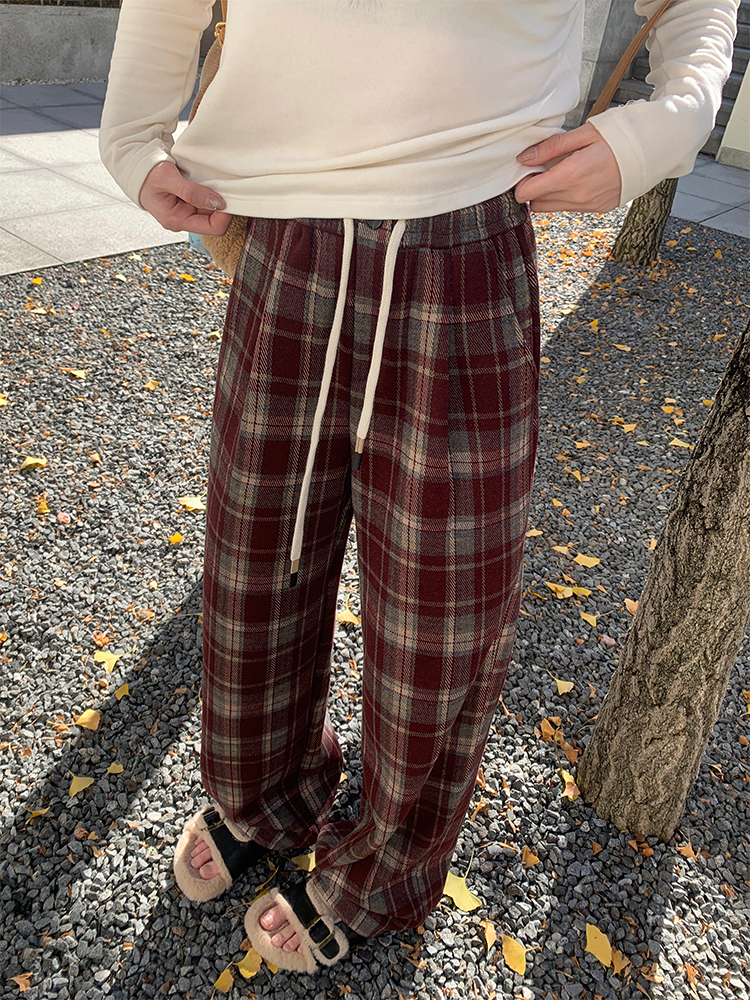加絨聖誕紅格子褲秋冬慵懶抽繩垂感拖地直筒褲子復古毛呢濶腿褲女