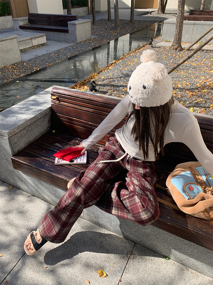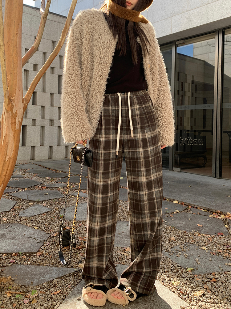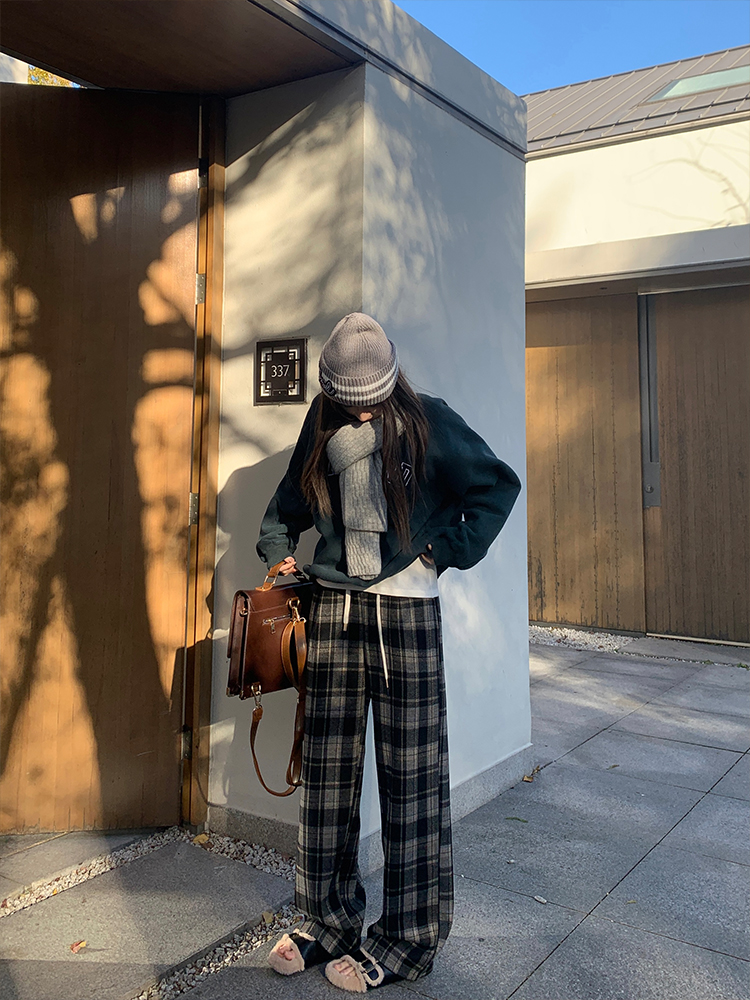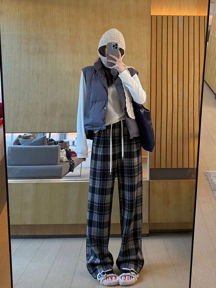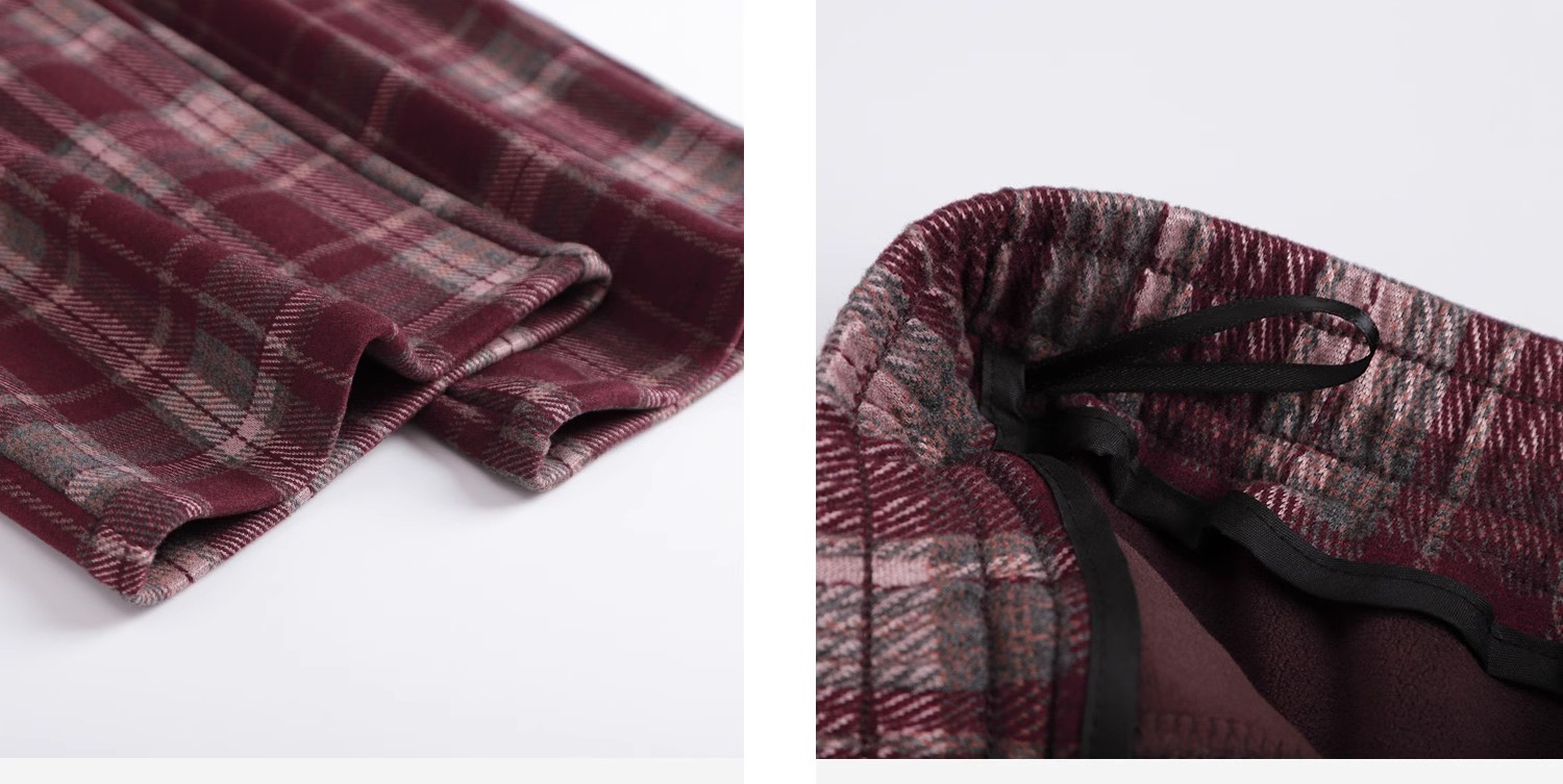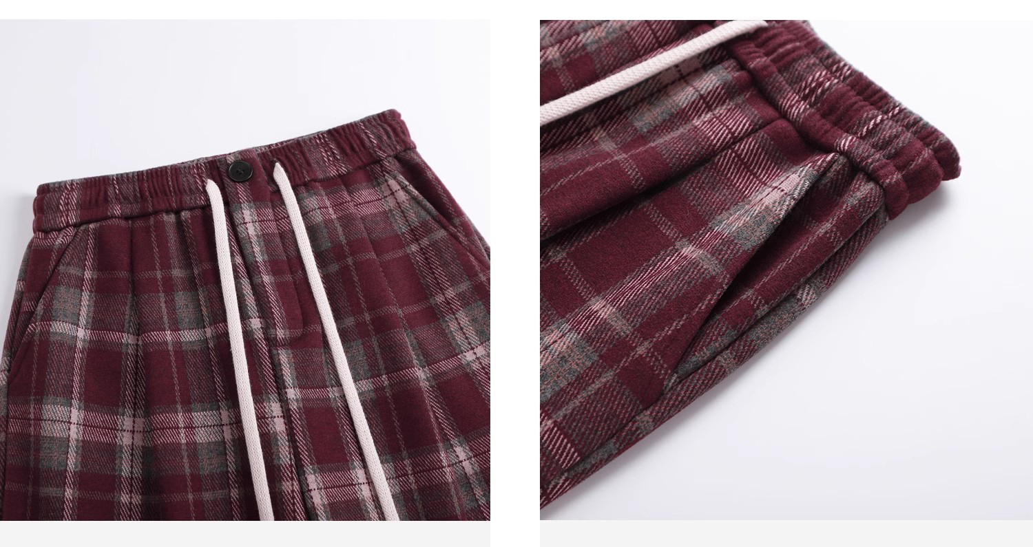加絨聖誕紅格子褲秋冬慵懶抽繩垂感拖地直筒褲子復古毛呢濶腿褲女