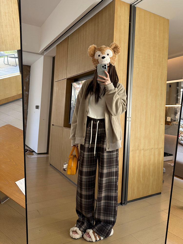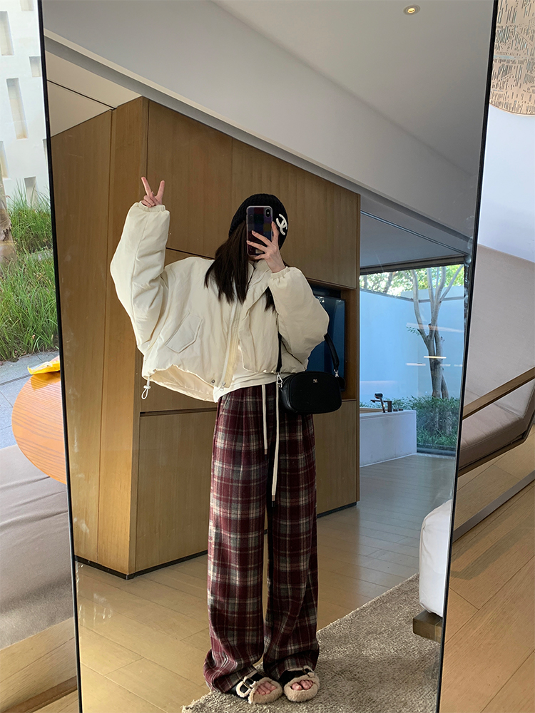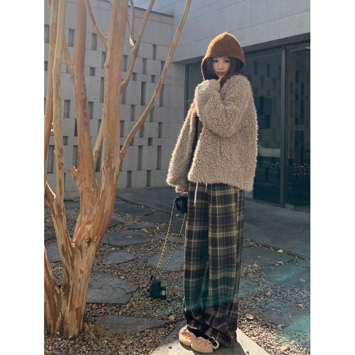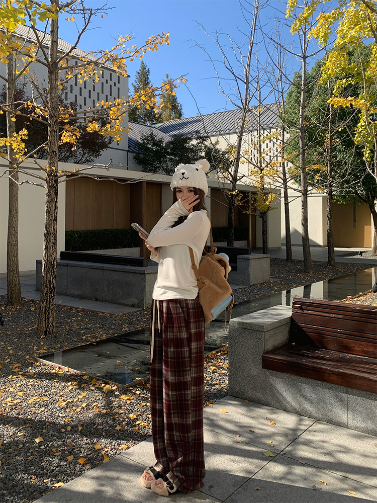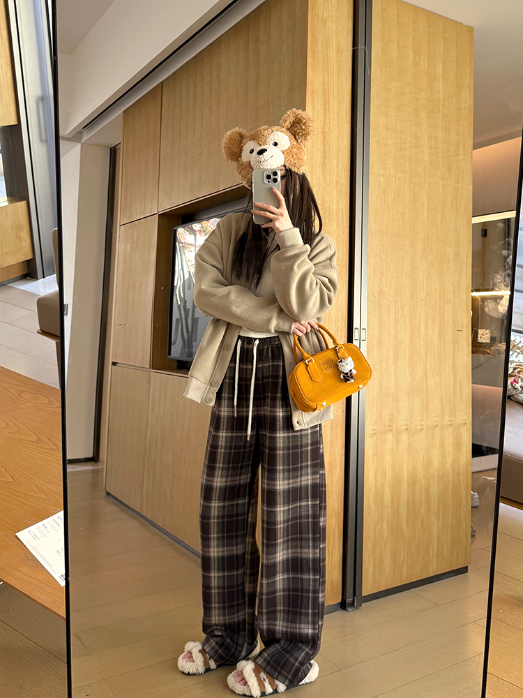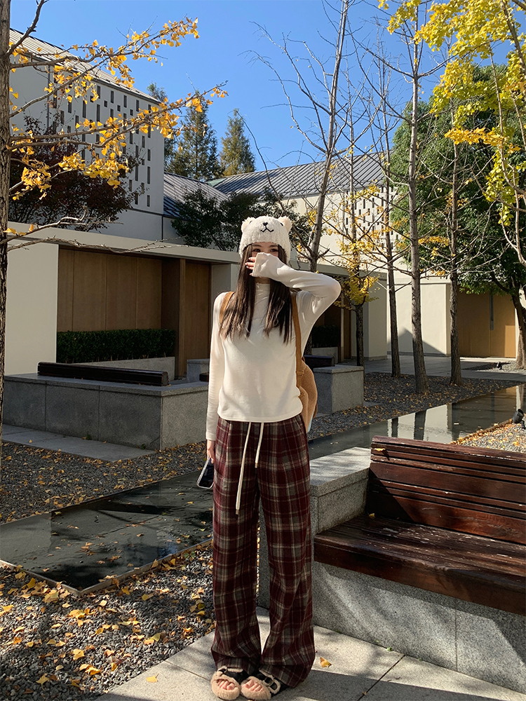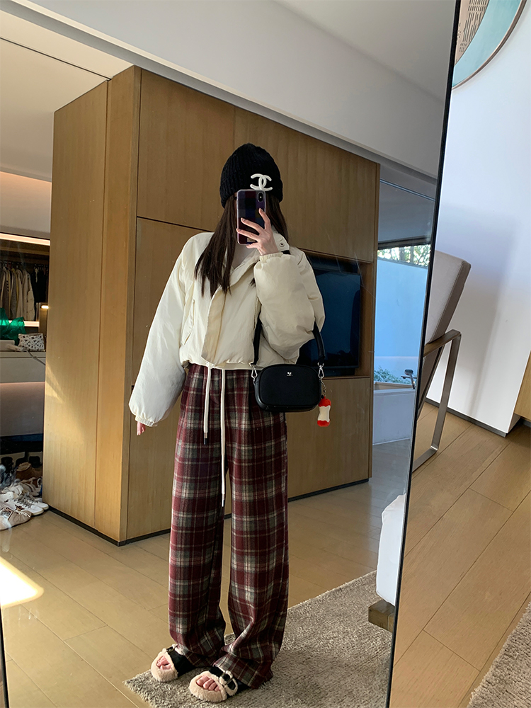 加絨聖誕紅格子褲秋冬慵懶抽繩垂感拖地直筒褲子復古毛呢濶腿褲女