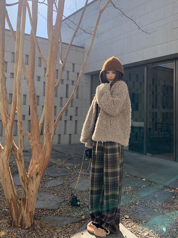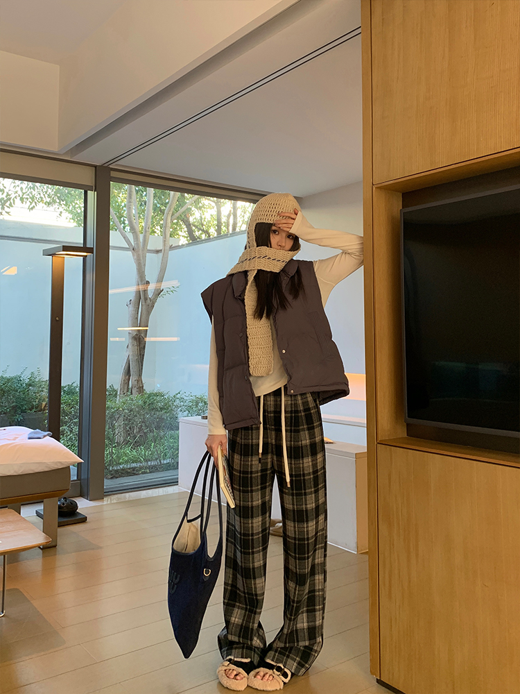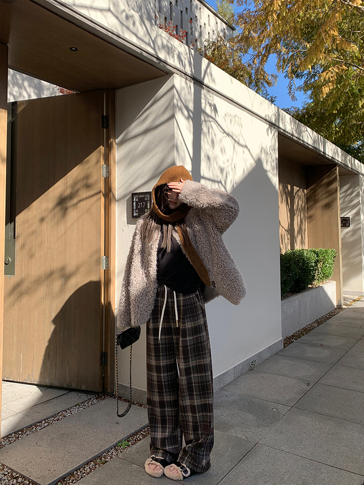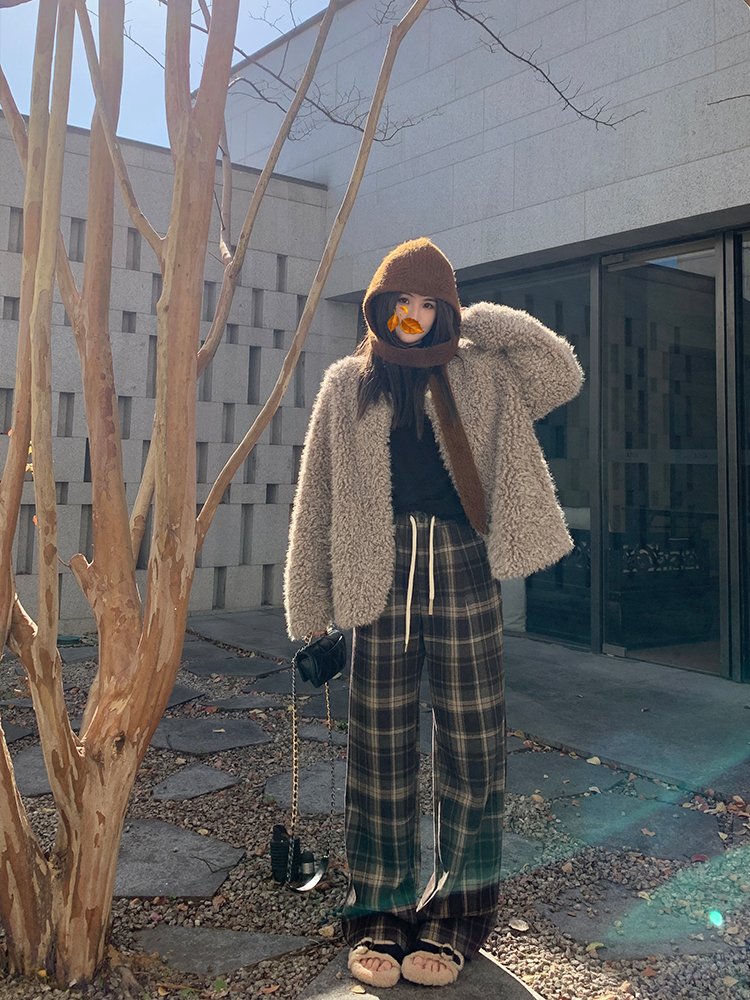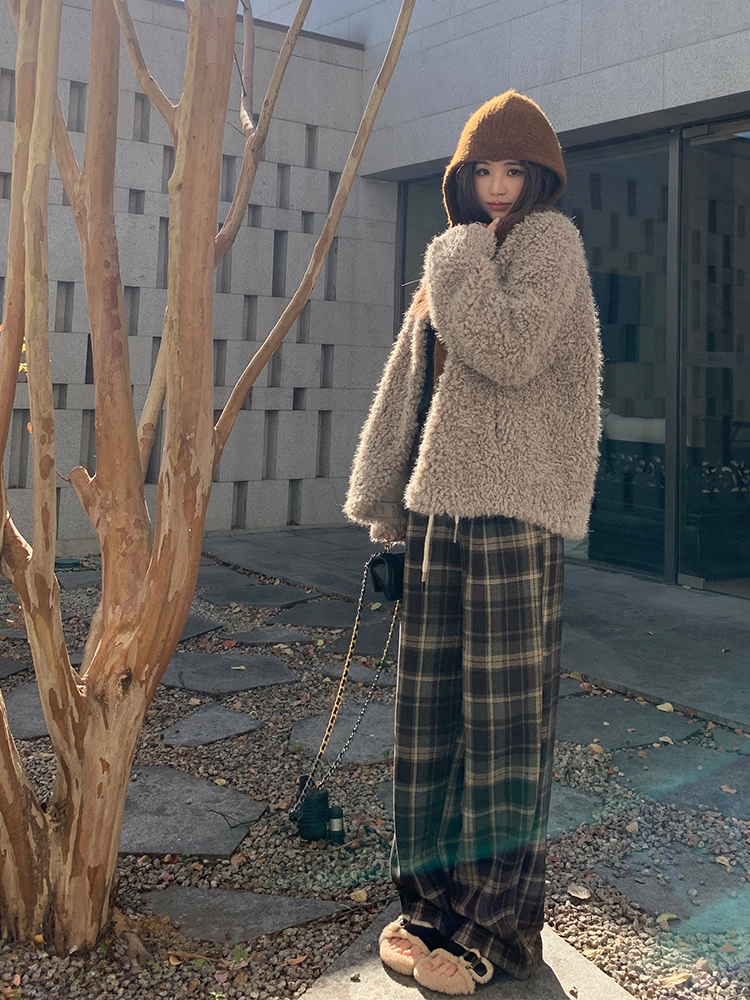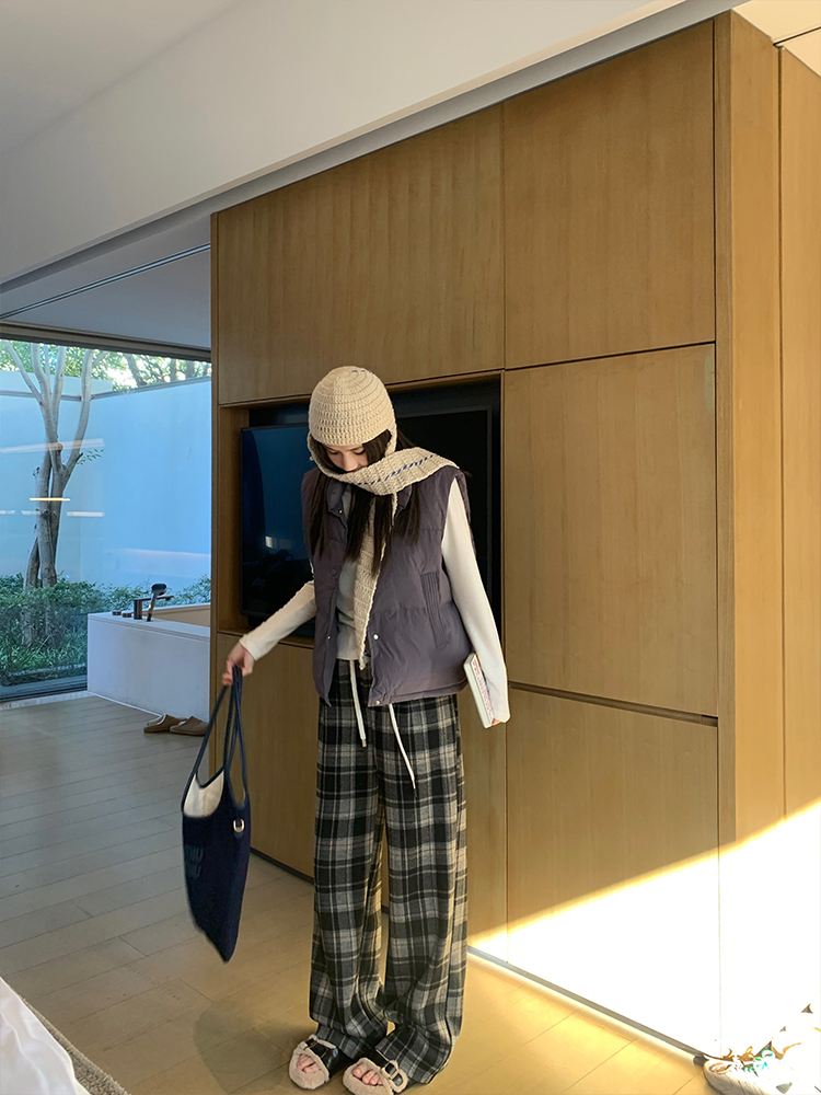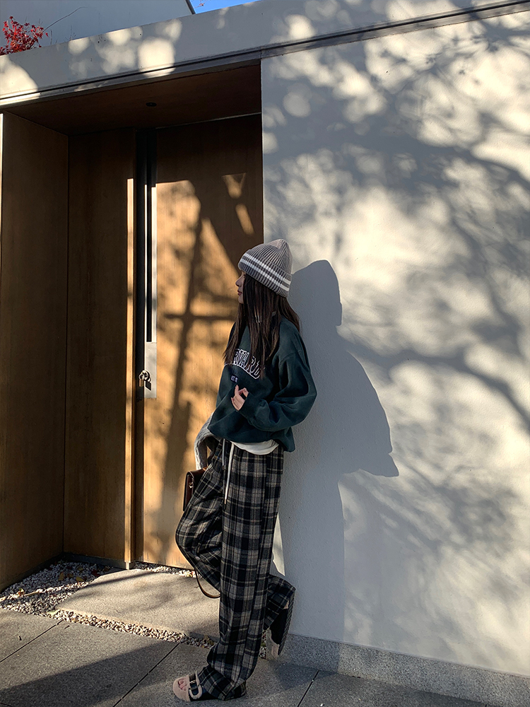 加絨聖誕紅格子褲秋冬慵懶抽繩垂感拖地直筒褲子復古毛呢濶腿褲女