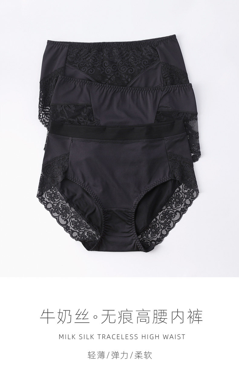 3條黑色牛嬭絲內褲女純棉襠蕾絲性感無痕大碼高腰收腹包臀三角褲