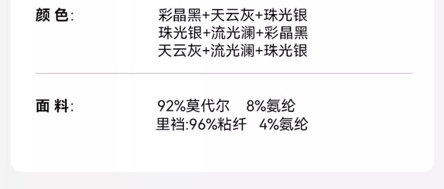 | 材質成分 | 莫代爾纖維(莫代爾)92% 聚氨酯彈性纖維(氨綸)8% |
