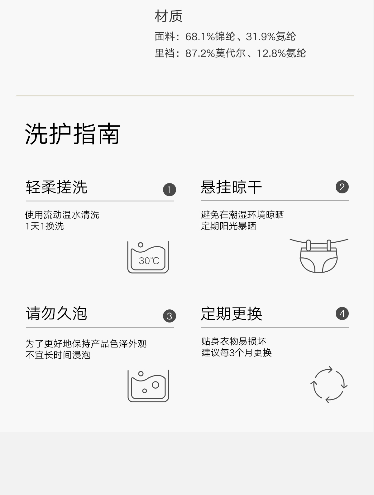 襠部材質成分 莫代爾纖維(莫代爾)85% 聚氨酯彈性纖維(氨綸)15%