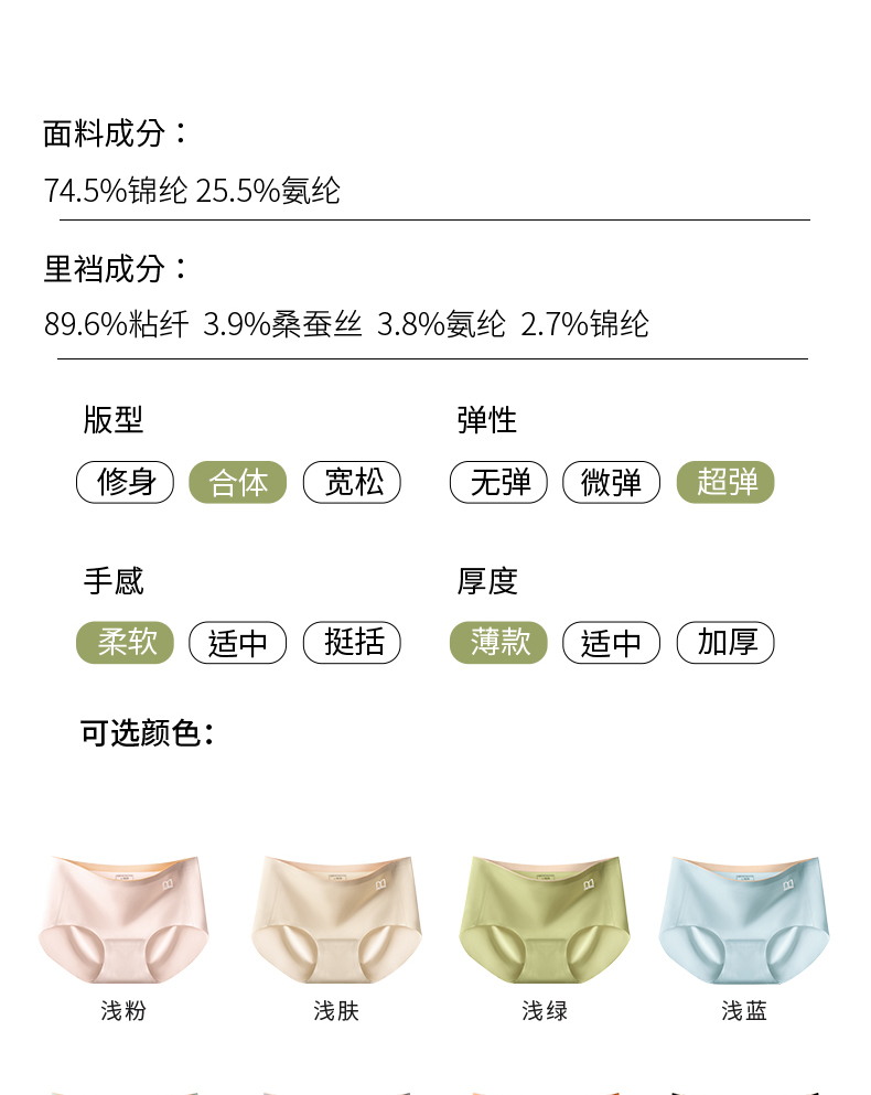 | 襠部材質成分 | 粘膠纖維(粘纖)89.6% 桑蠶絲3.9% 聚氨酯彈性纖維(氨綸)3.8% 聚醯胺纖維(錦綸)2.7% |