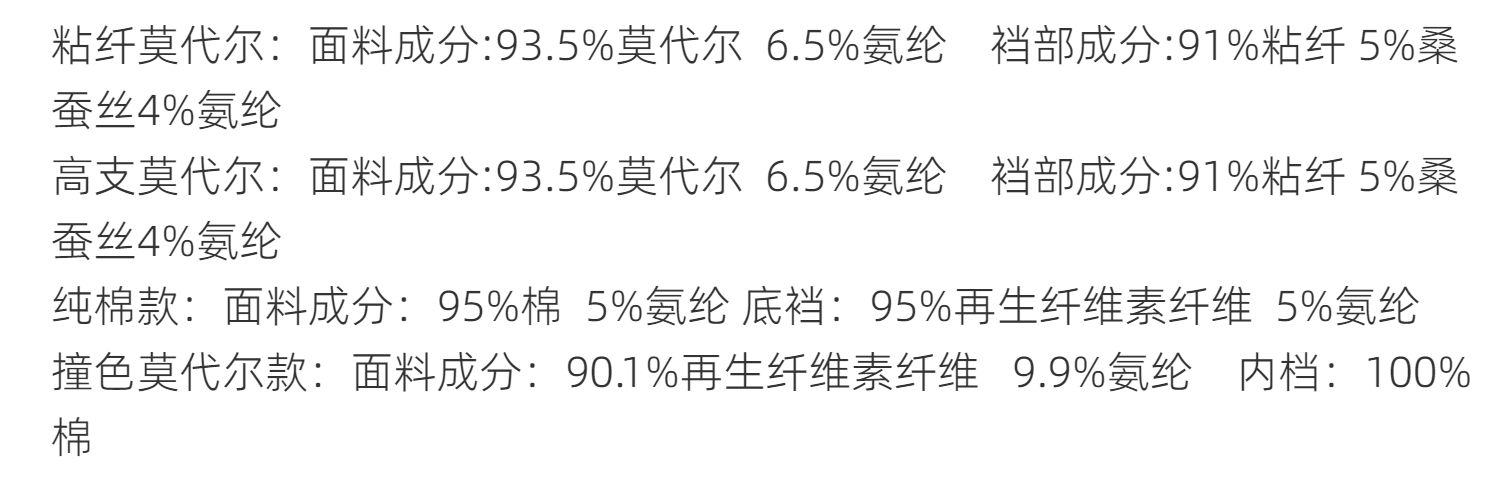 | 襠部材質成分 | 粘膠纖維(粘纖)91% 桑蠶絲5% 聚氨酯彈性纖維(氨綸)4% |