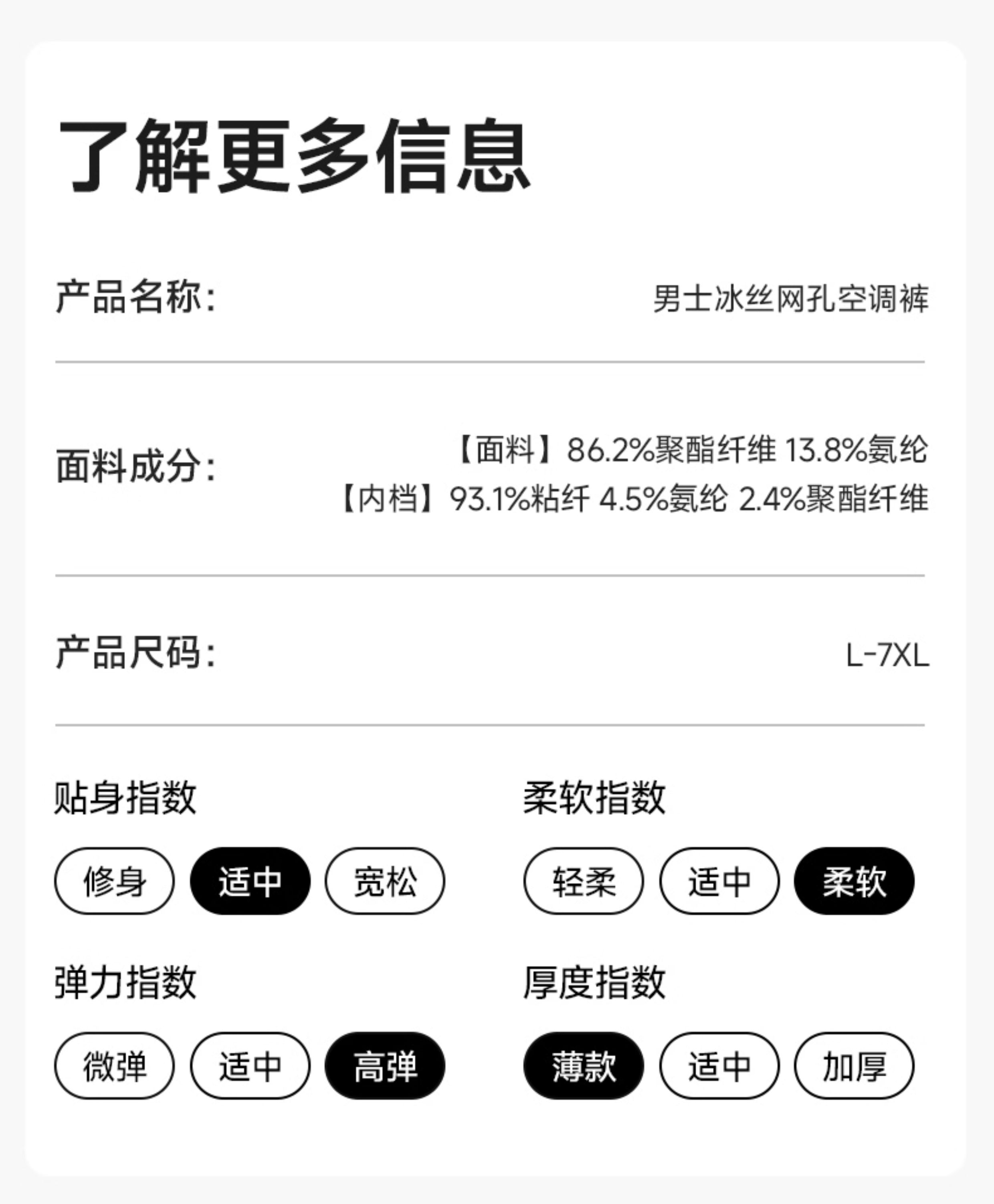 | 襠部材質成分 | 粘膠纖維(粘纖)93.7% 聚氨酯彈性纖維(氨綸)4% 聚酯纖維2.3% |