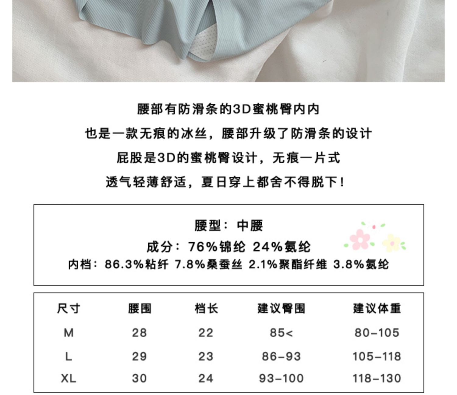 桃醬少女丨不夾臀+不下滑+真無痕 冰絲透氣3D蜜桃臀蠶絲襠內褲女