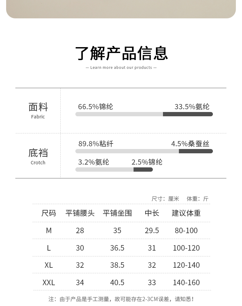 | 襠部材質成分 | 粘膠纖維(粘纖)89.8% 桑蠶絲4.5% 聚氨酯彈性纖維(氨綸)3.2% 聚醯胺纖維(錦綸)2.5% |