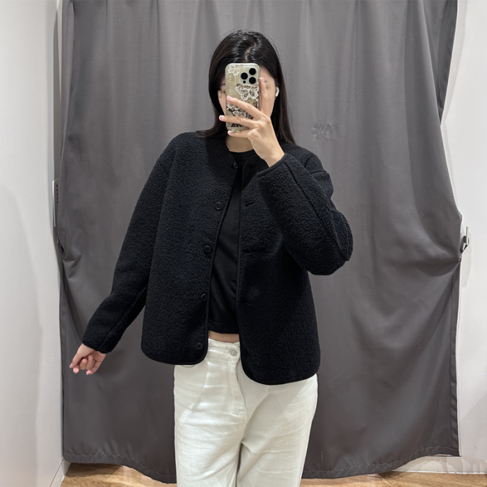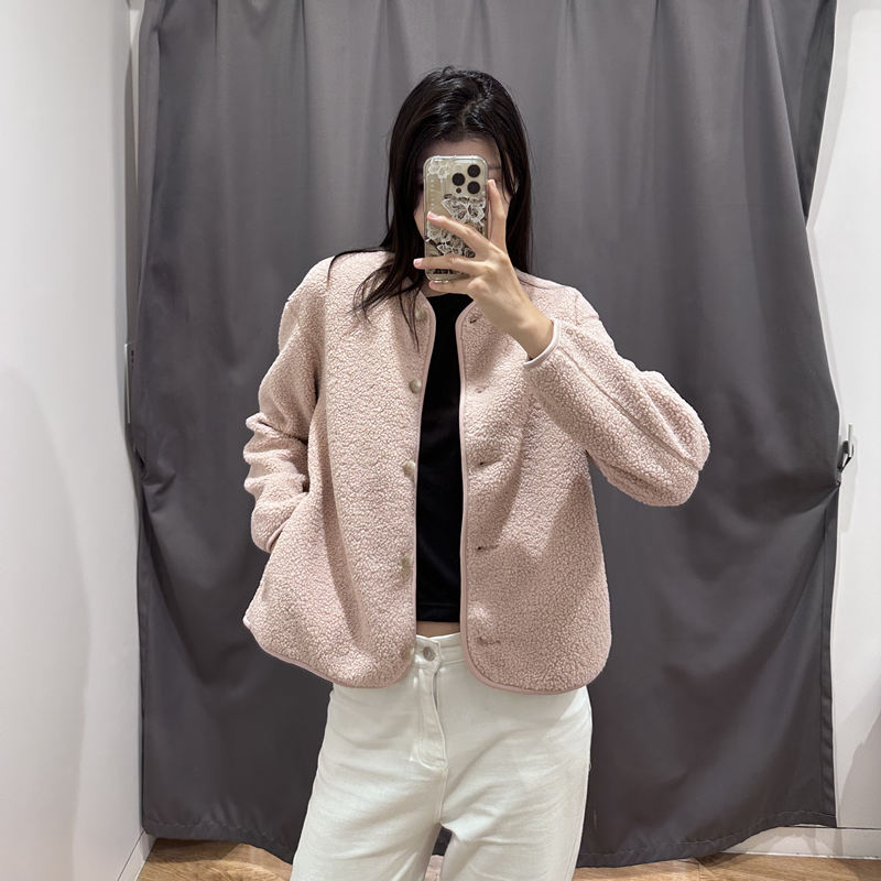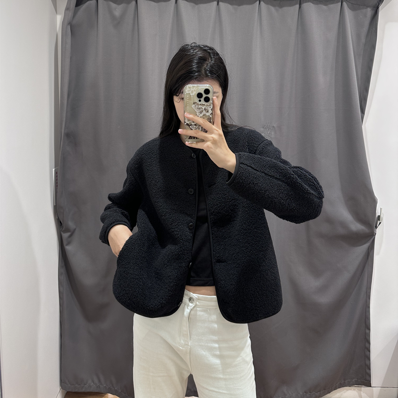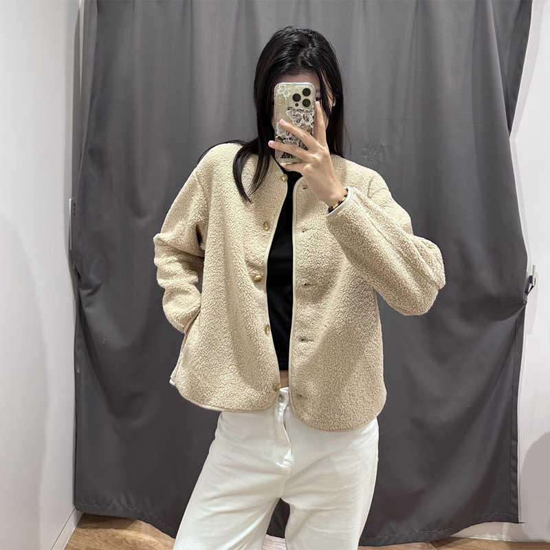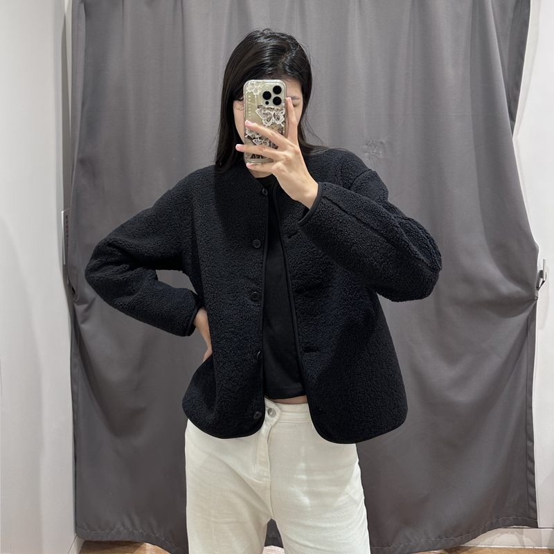 三裡屯出品秋冬新款女裝仿羊羔絨搖粒絨圓領開衫長袖外套Y461660