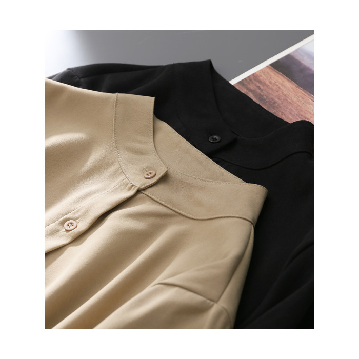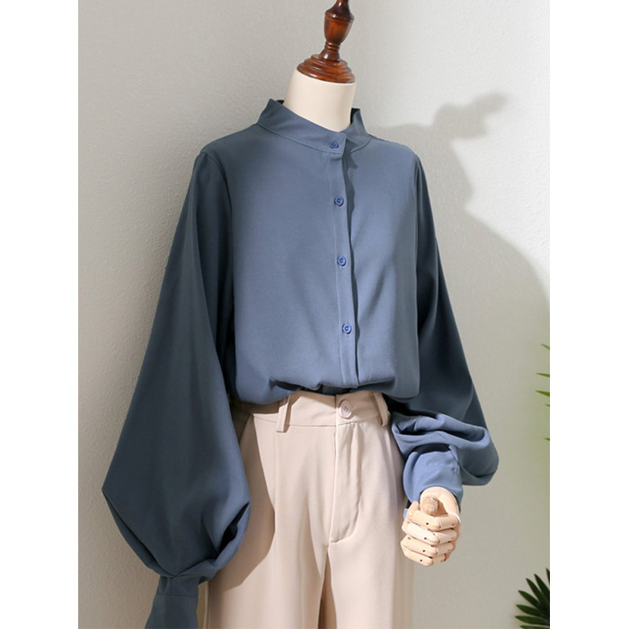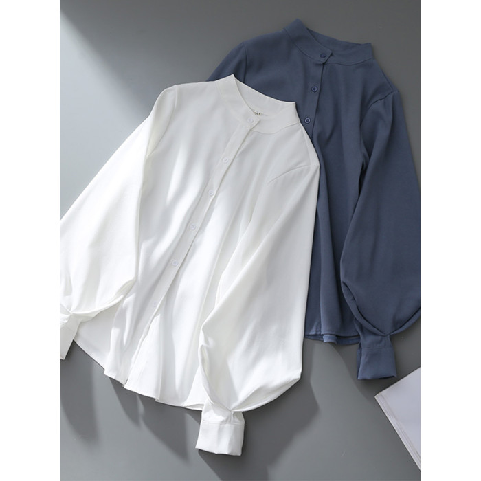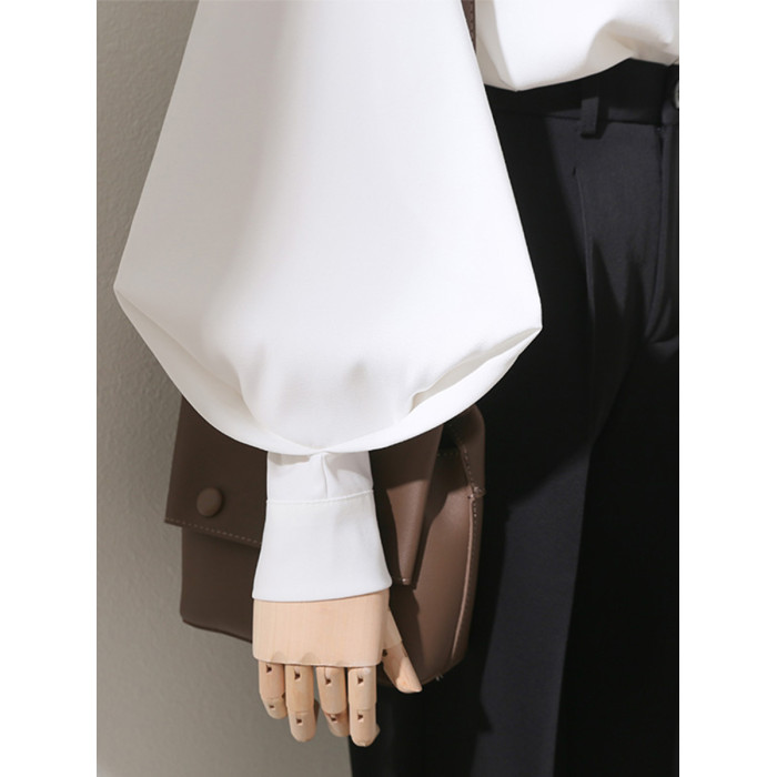 秋新款燈籠袖白色襯衫女長袖磨毛上衣韓版寬松港味立領泡泡袖襯衣