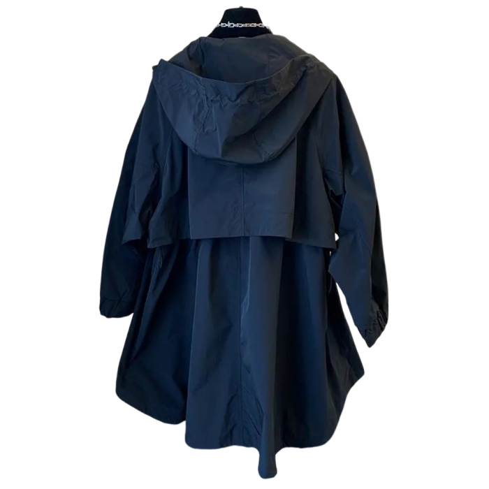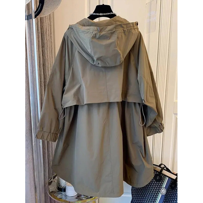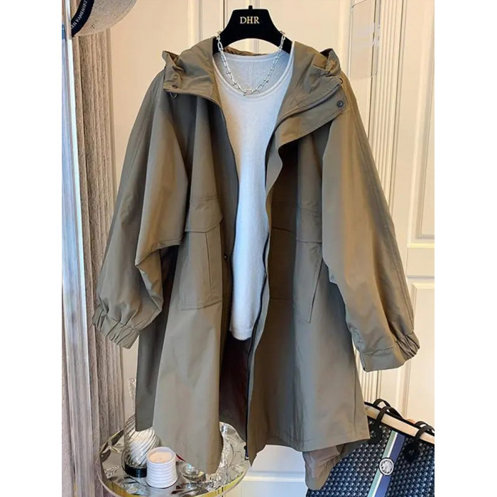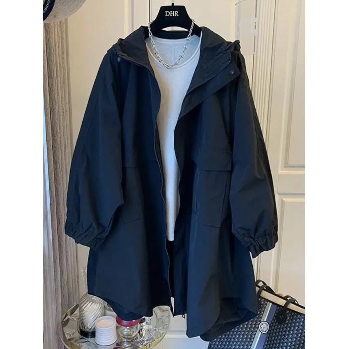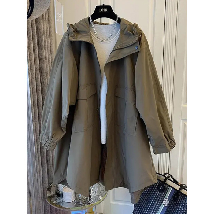 設計師小衆日系寬松休閒茁繭雙口袋拼接連帽中長款風衣外套女春秋