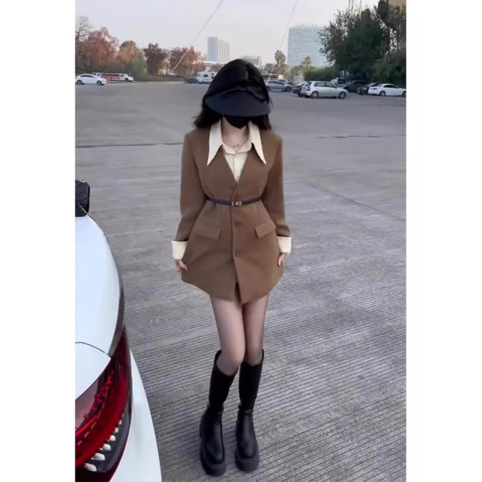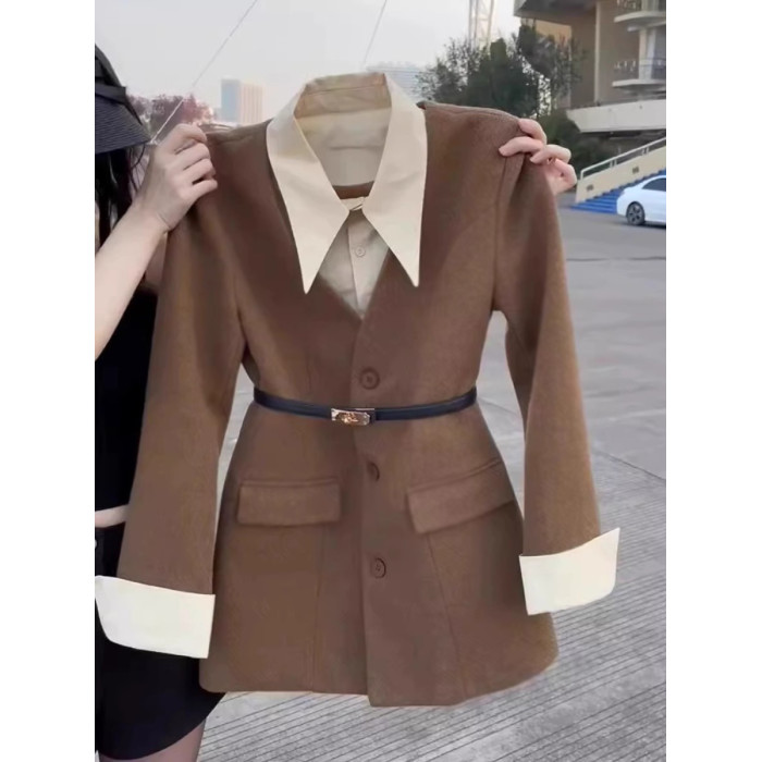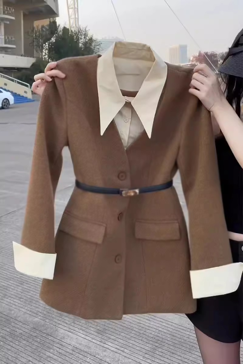 今年流行高級感獨特超好看美拉德小香風咖色假兩件西裝外套女秋裝