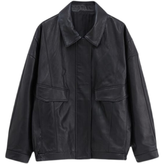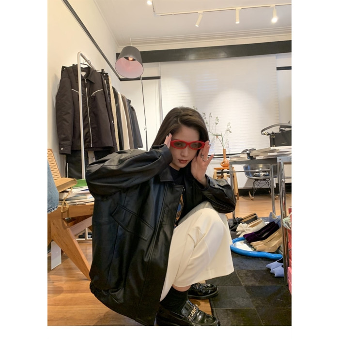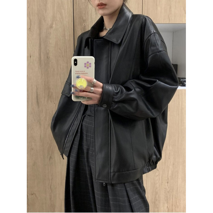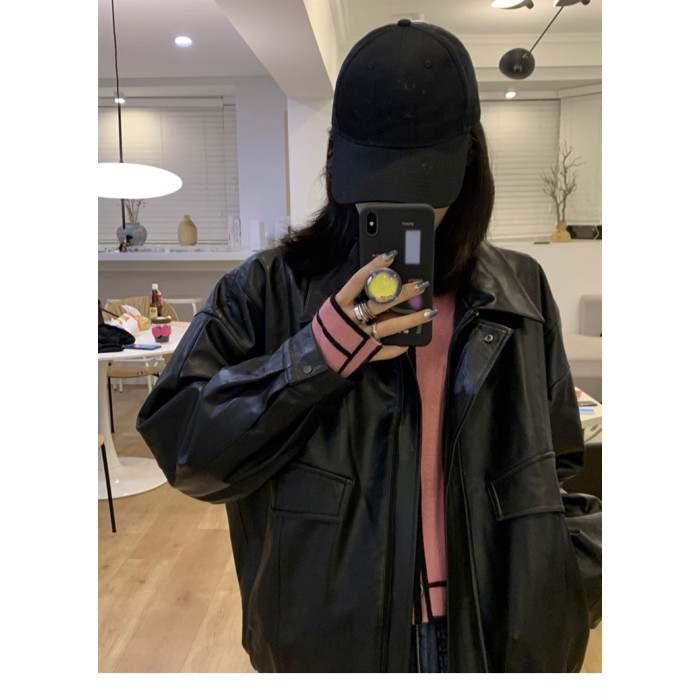 秋冬加絨港風復古休閒寬松廓形酷帥潮黑色拉鍊機車皮衣夾克外套女