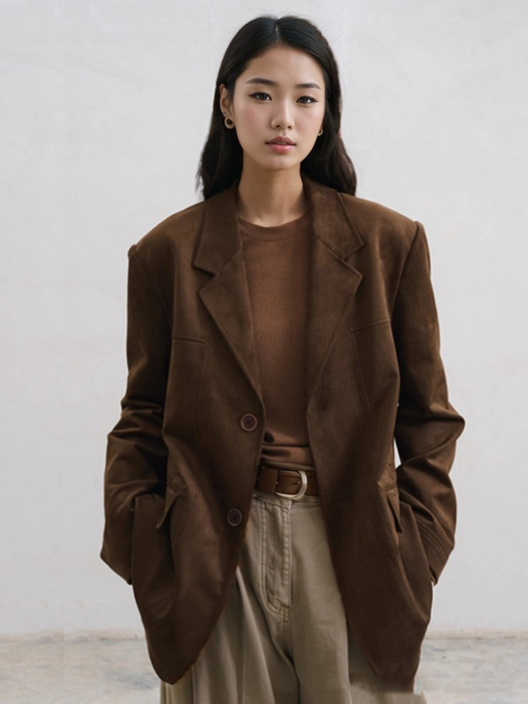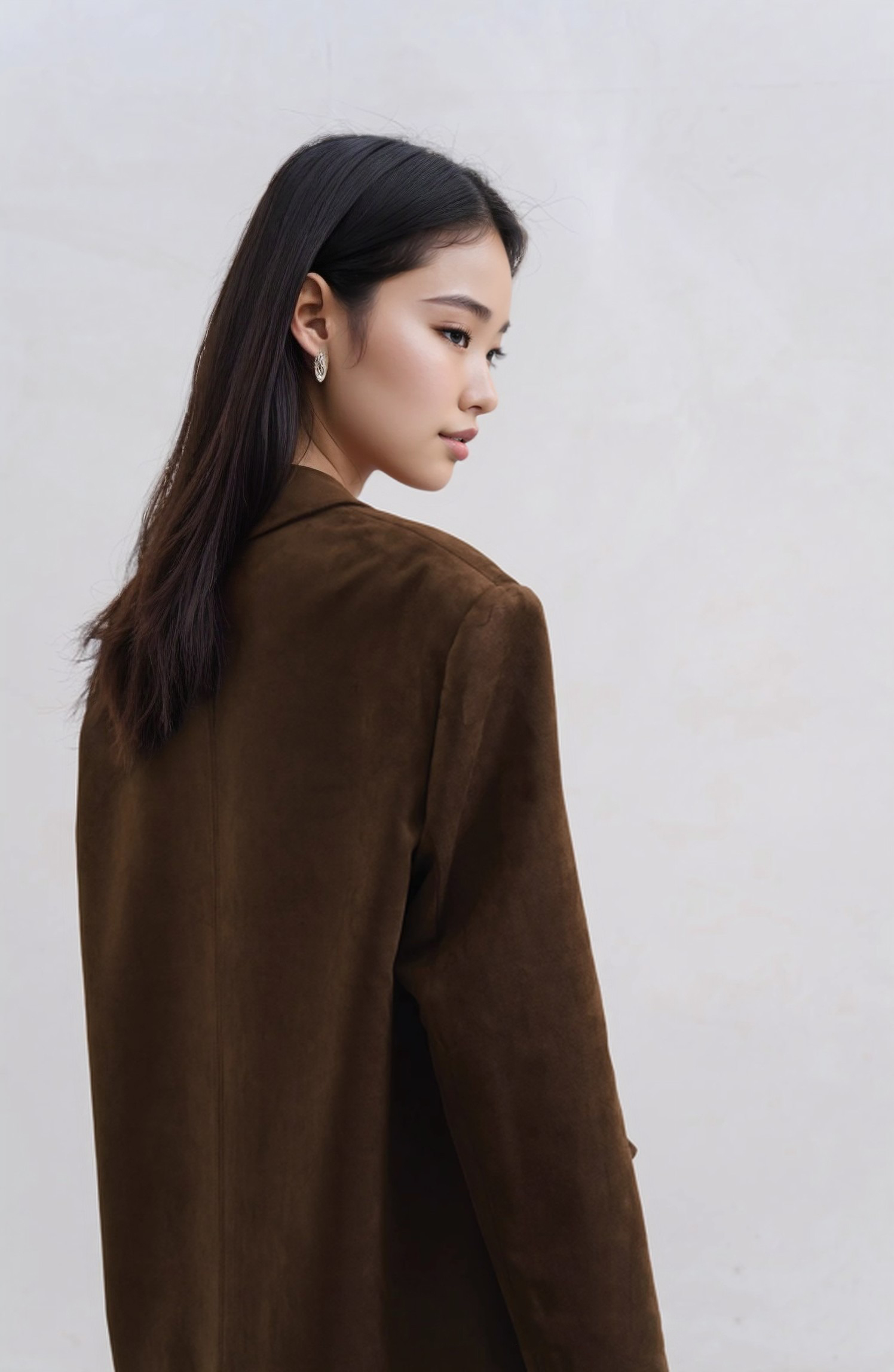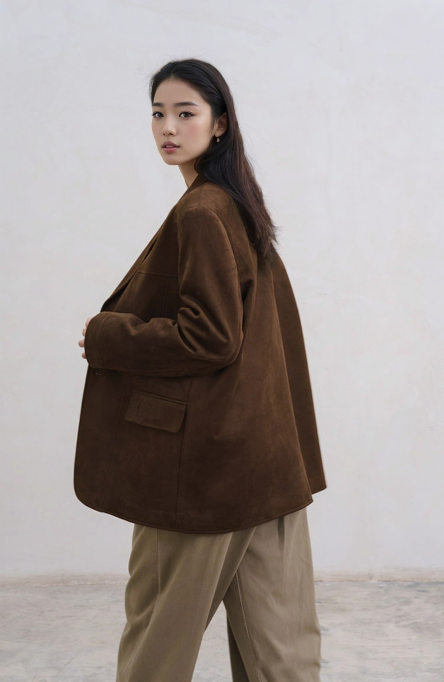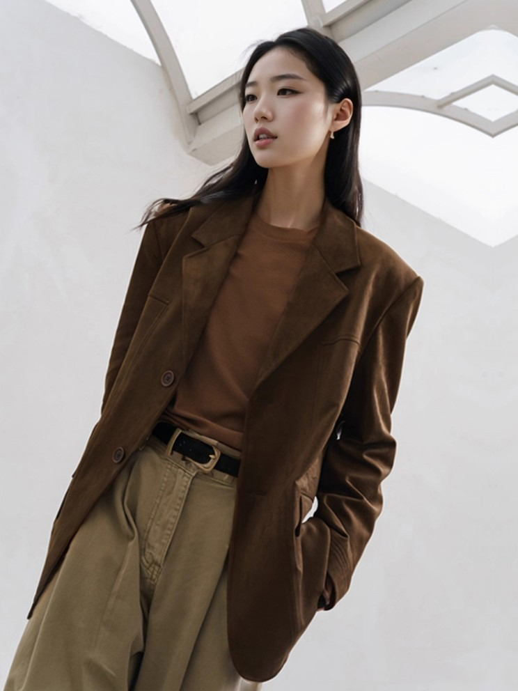 深棕咖麂皮絨西裝外套女2025春秋新款美式復古高級感小衆西服皮衣
