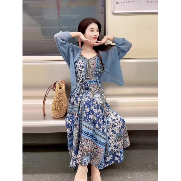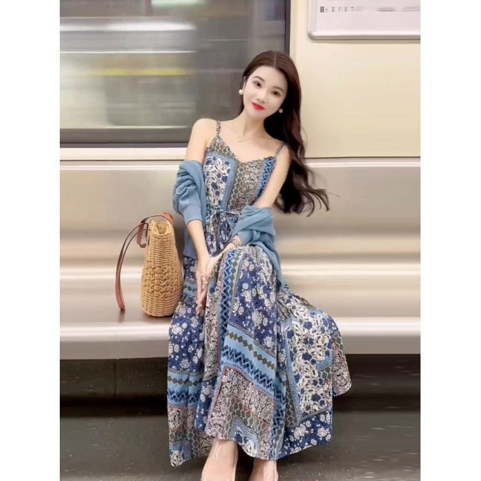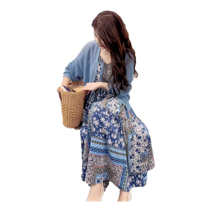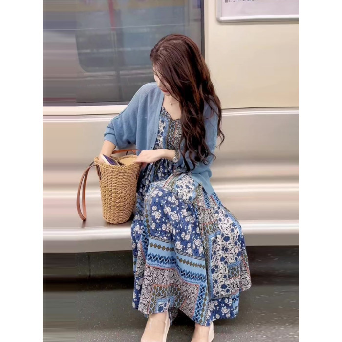 今年流行漂亮套裝長裙女小個子高級時尚藍色針織衫茶歇法式連衣裙