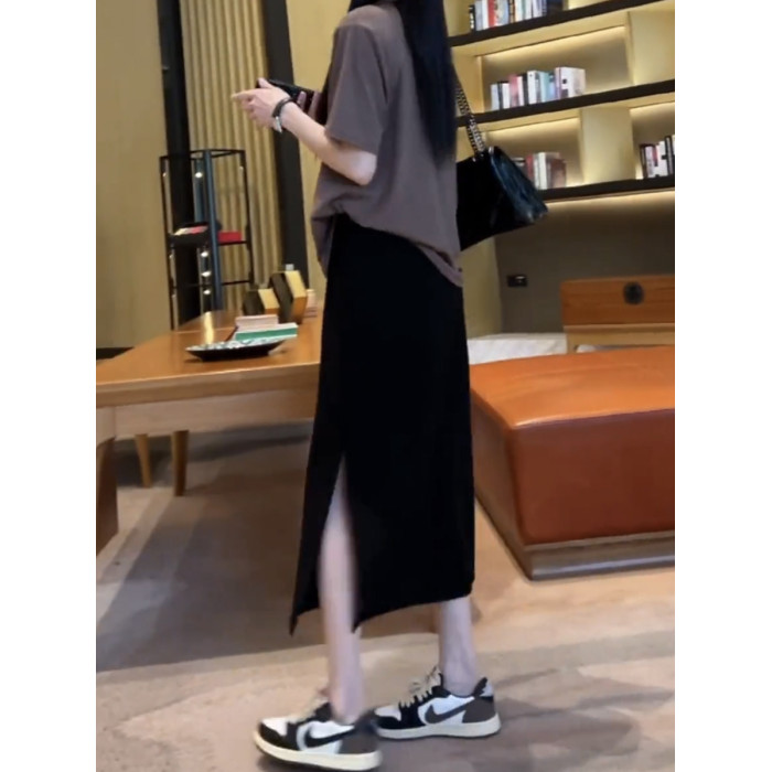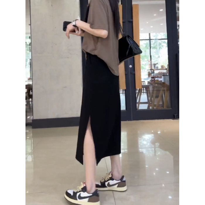 梨形身材大碼高腰顯瘦黑色半身裙女夏季新款彈力中長款開叉A字裙